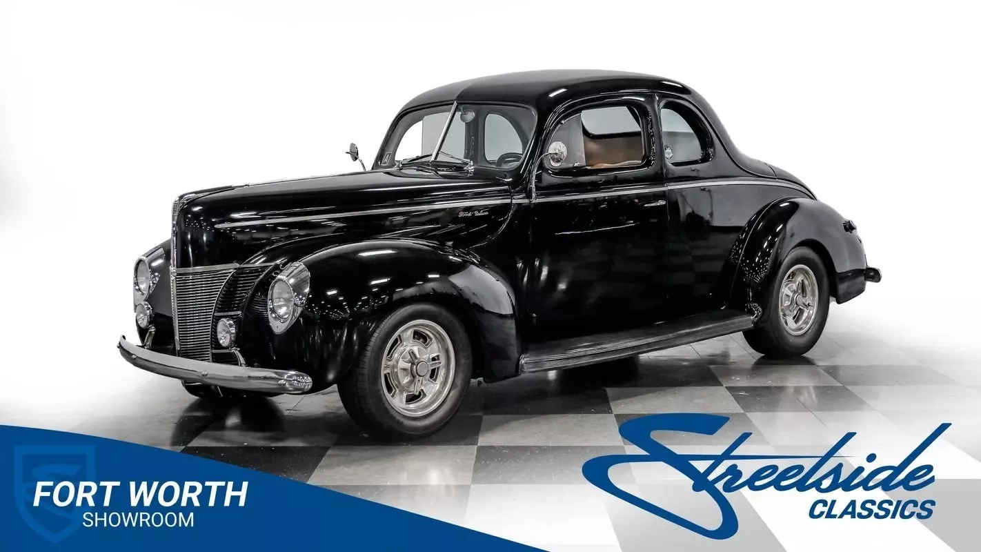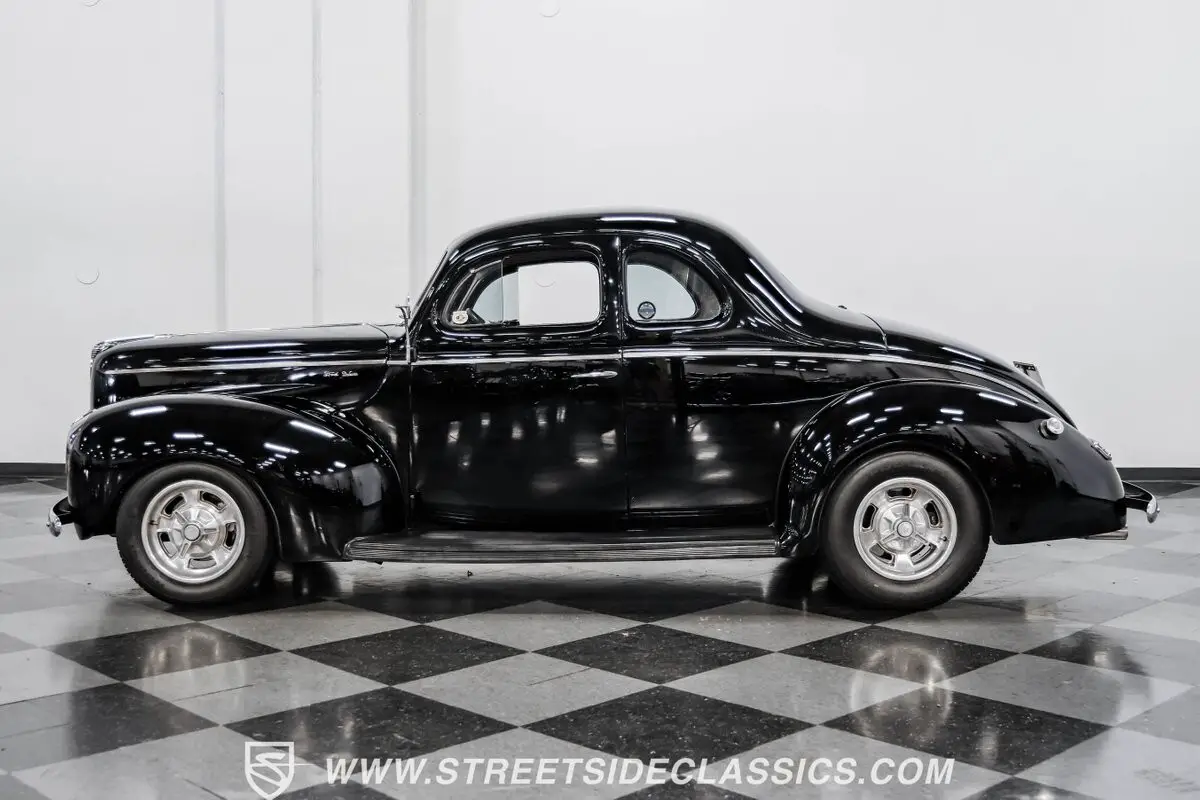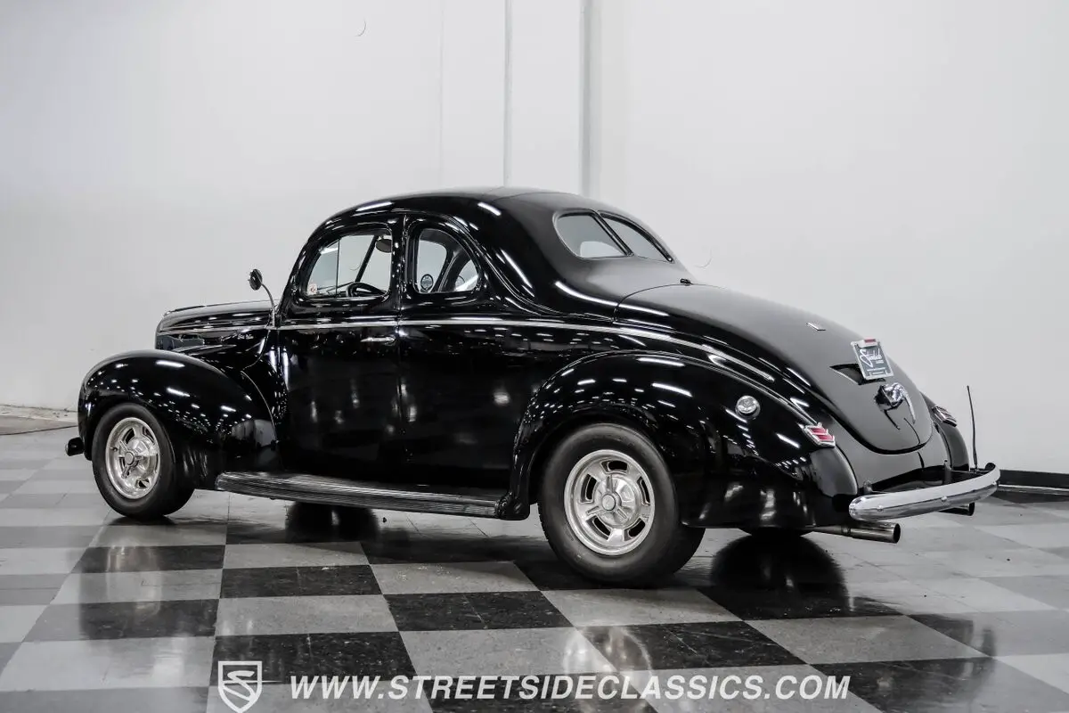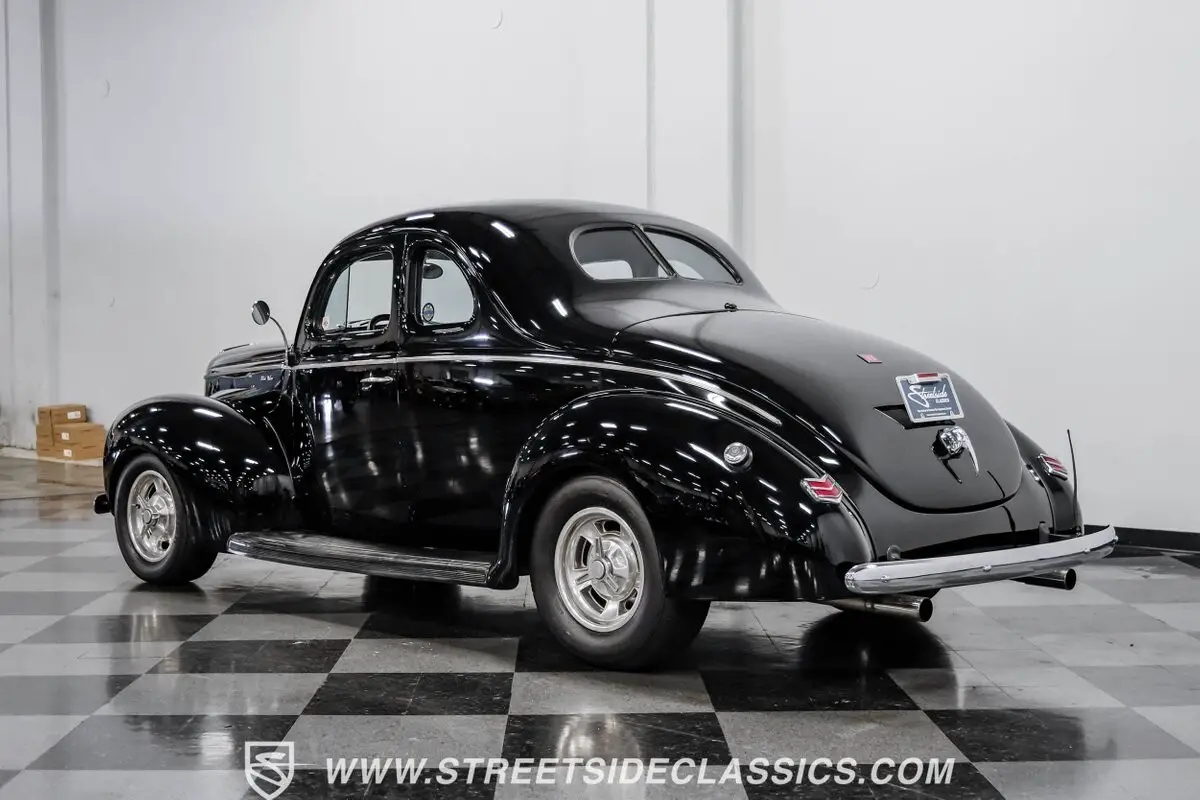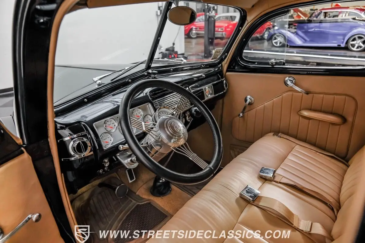 Fully restored by Hatfield Restorations, this 1940 Ford 5-Window Coupe Streetrod in black features all-steel construction including fenders and running boards. The painted grill matches the black exterior finish, while rubber running boards provide classic accents. Genuine 15" Halibrand wheels anchor each corner, wrapped in 215/60R15 front and 235/70R15 rear tires. The two-door configuration maintains the coupe's original proportions with modern refinements throughout the exterior package.