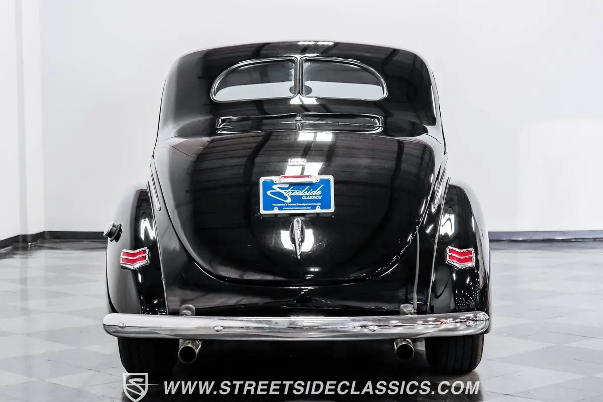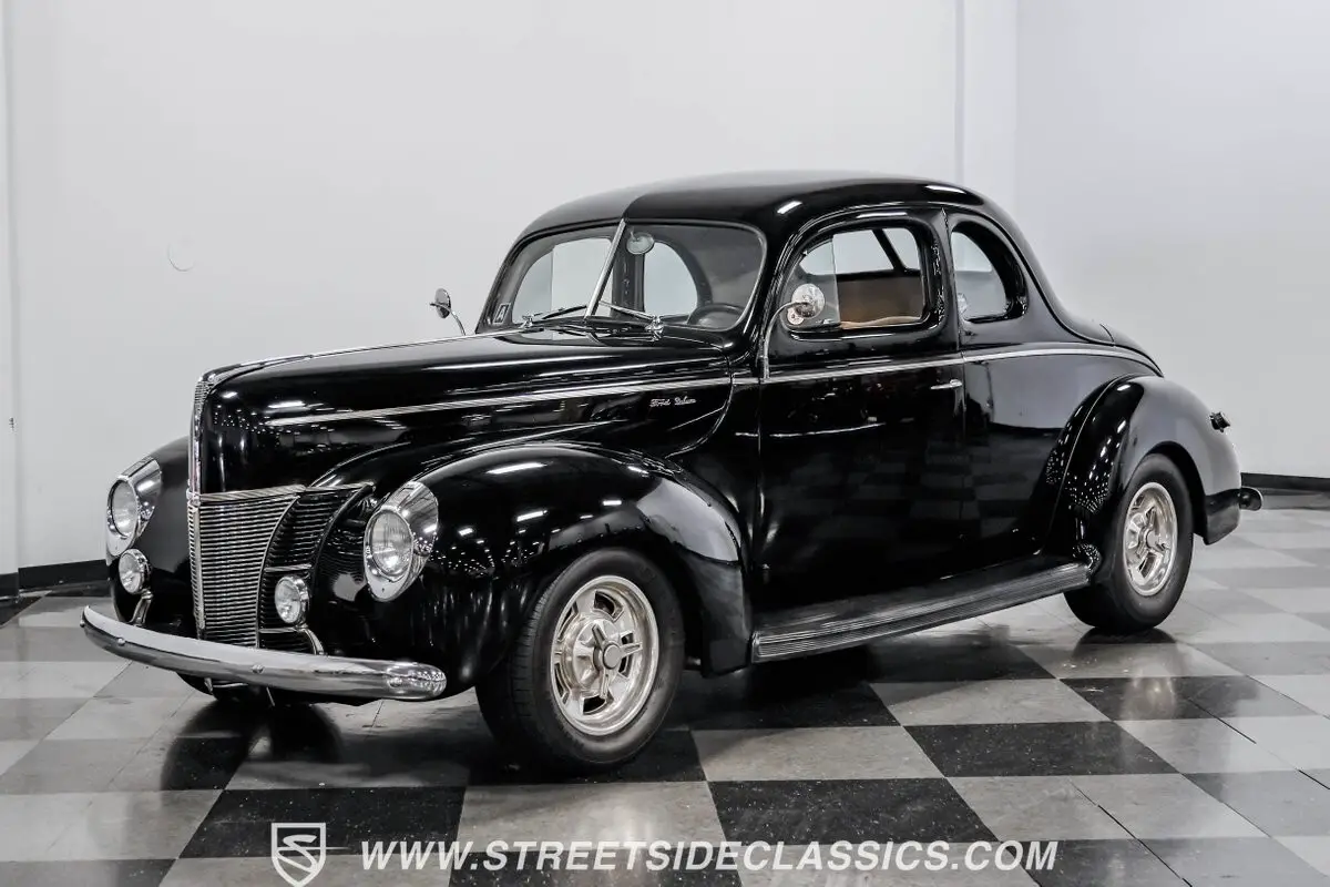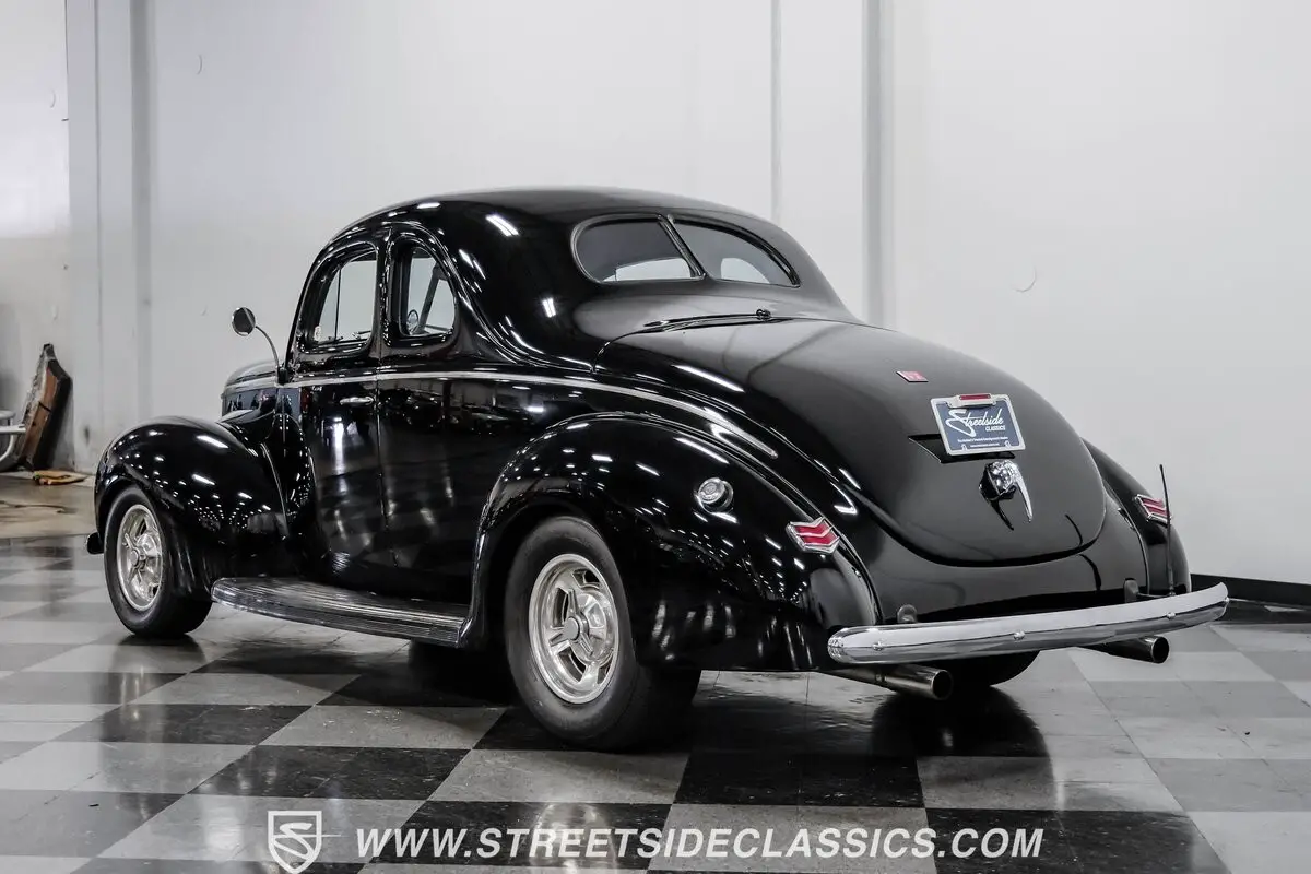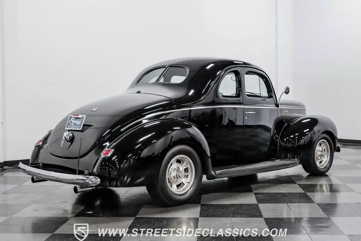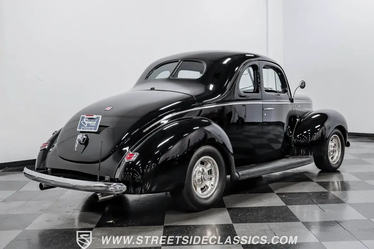 Fully restored by Hatfield Restorations, this 1940 Ford 5-Window Coupe Streetrod in black features all-steel construction including fenders and running boards. The painted grill matches the black exterior finish, while rubber running boards provide classic accents. Genuine 15" Halibrand wheels anchor each corner, wrapped in 215/60R15 front and 235/70R15 rear tires. The two-door configuration maintains the coupe's original proportions with modern refinements throughout the exterior package.