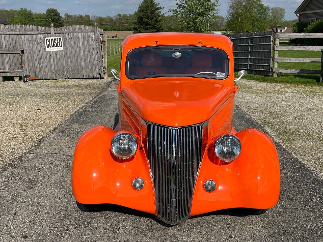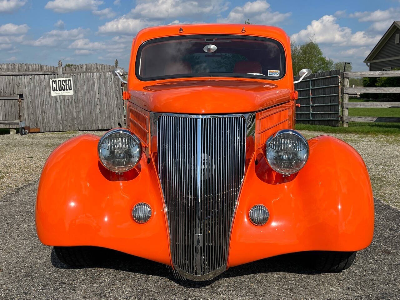 IT IS A ORIGINAL FORD STEEL BODY EXCEPT TOP OF HOOD AND FENDERS THAT ARE FIBERGLASS BUT RUNNING BOARDS ARE STEEL. THE BODY FITMENT ON THE CAR IS GREAT. THE TANGERINE ORANGE HAS A HI GLOSS. ITS VERY NICE SHOW PAINT MINUS A FEW NICKS AND 2 SLIGHTLY DULL SPOTS AT BOTTOM OF REAR FENDERS IN BACK. THEY ARE ABOUT 2 TO 3 INCH IN AREA. GLASS IS ALL NICE, CHROME IS NICE, AND DOORS WORK GREAT. HAS POWER OPEN AND CLOSE TRUNK LID. HAS A REAL NICE SPECIAL MADE FRAME.