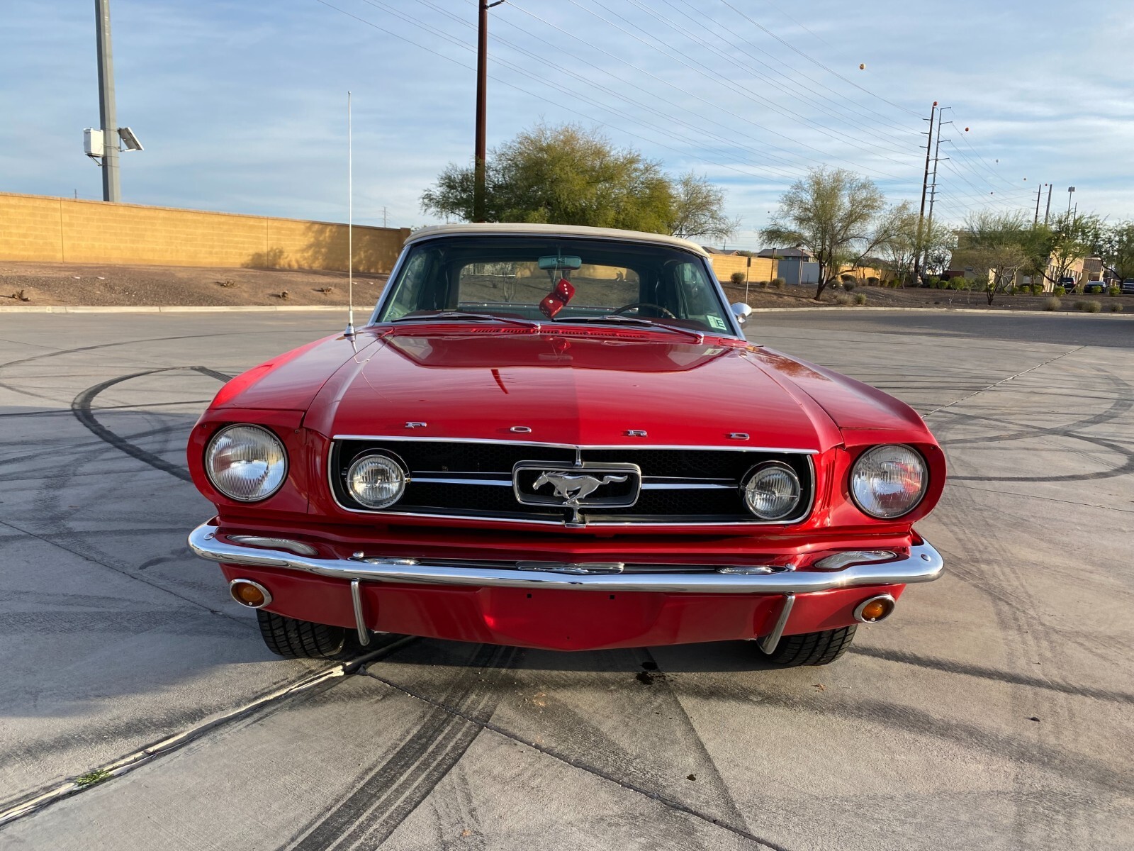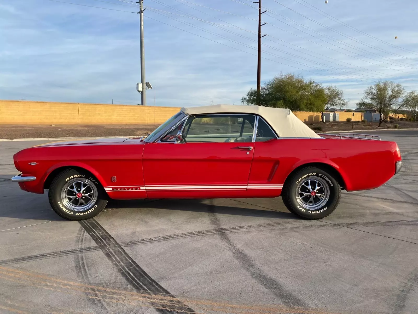 This garage-kept 1965 Ford Mustang GT 2-door convertible is powered by a 289ci v8 paired with an upgraded 5-speed manual transmission. It features a full center console, woodgrain interior trim, and a dual-exhaust system. Beautiful Rangoon Red with a newer power-retractable white top over a white interior. Features include fog lamps, brightwork, rocker panel striping and a trunk rack. Original AM radio still works. Recent replacements include a new electic fuel pump, carburetor, distributor, clutch and muffler.This car does not have power steering, power brakes or power windows. I have tried to keep it as original as possible. Paint is good but not perfect. Has assigned Colorado VIN number, but original VIN visible in engine bay. Unsure if odometer mileage is correct.