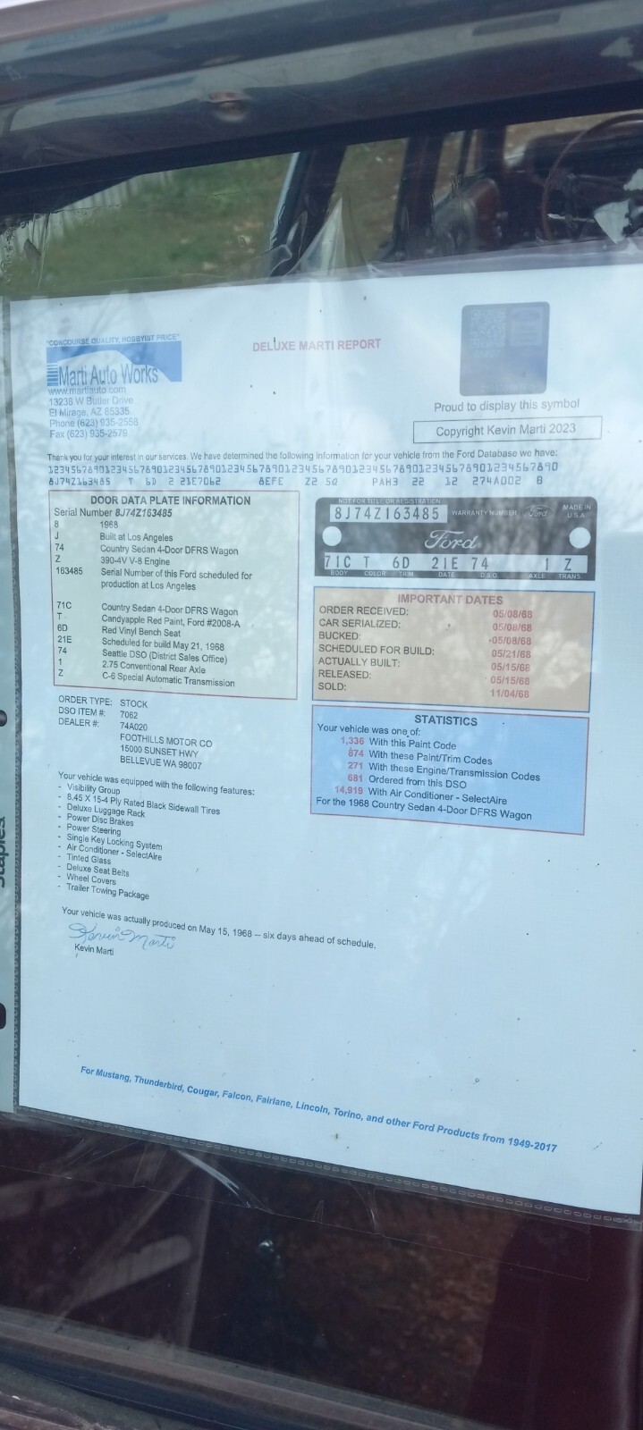 The 1968 Ford Country Sedan DFRS Wagon is a classic car in stunning condition, featuring all original trim and a beautiful burgundy interior. This 9-seater wagon has a powerful 390 4-barrel engine, automatic transmission, and more than 350 horsepower. The exterior is a candy apple red with a black top, and it comes equipped with air conditioning, a trailer hitch, roof rack, power steering, and alloy wheels. With only 116,852 miles on the odometer, this Ford Country Sedan DFRS Wagon is a rare find for collectors and enthusiasts of vintage vehicles. I Love to take this car out and drive it once in a while. It fires right up and drives very well for sucha large vehice. My name is Greg .....please call if you have any questions as I may have forgotten something that is important to you. (406) 317-3225Before the car was sprayed original candy apple red, they shaved the door handles and 2 faubs open each door automatically.