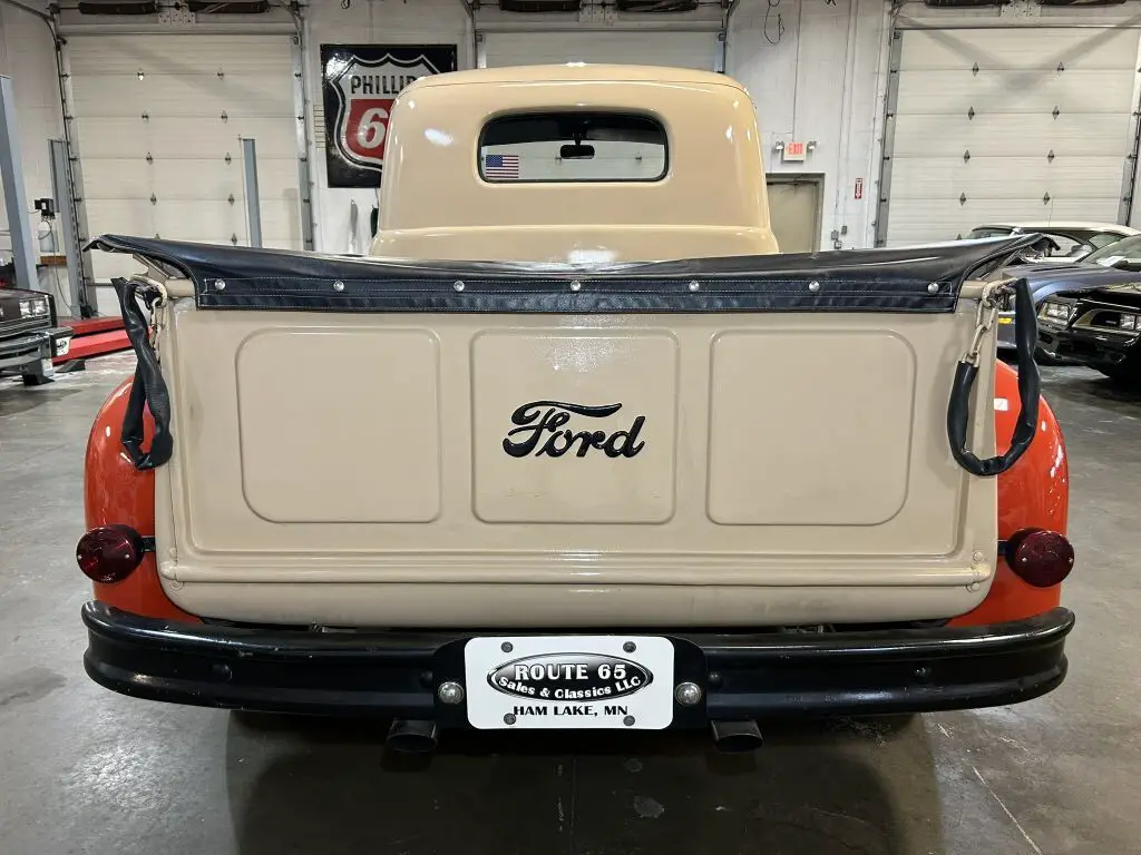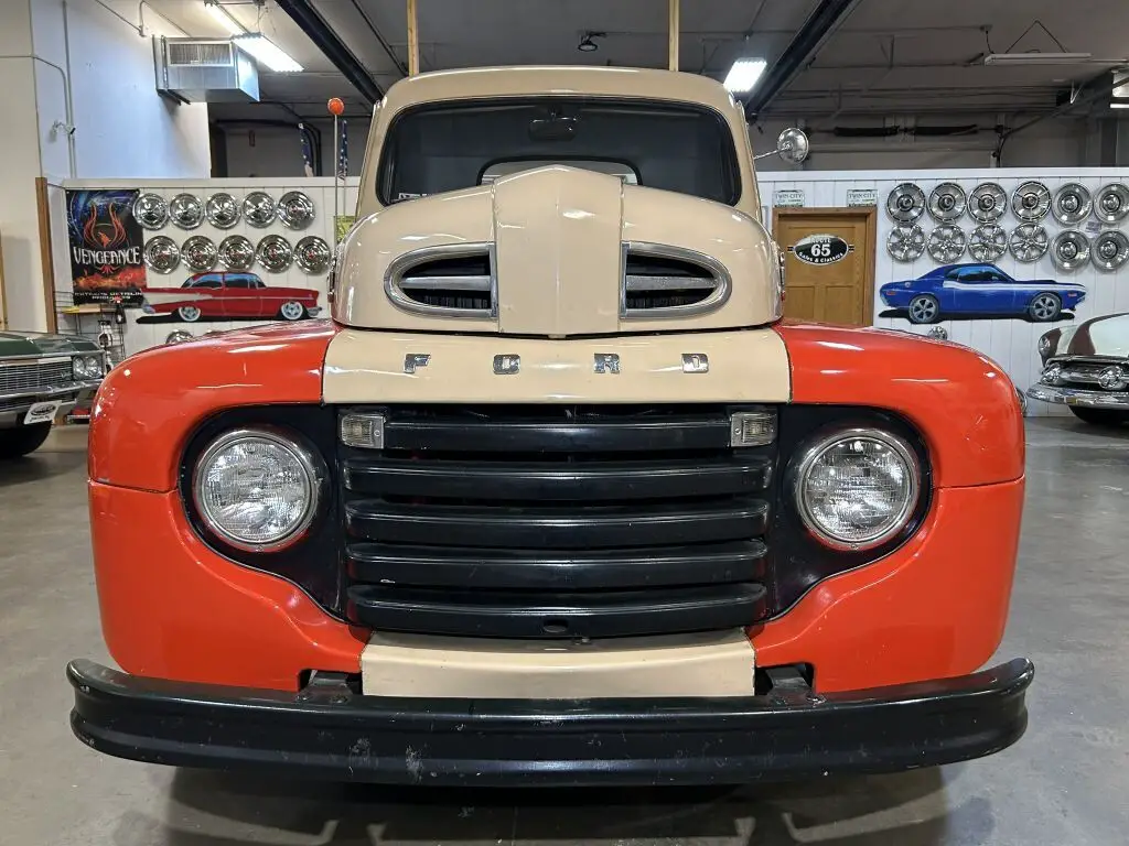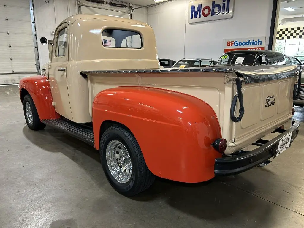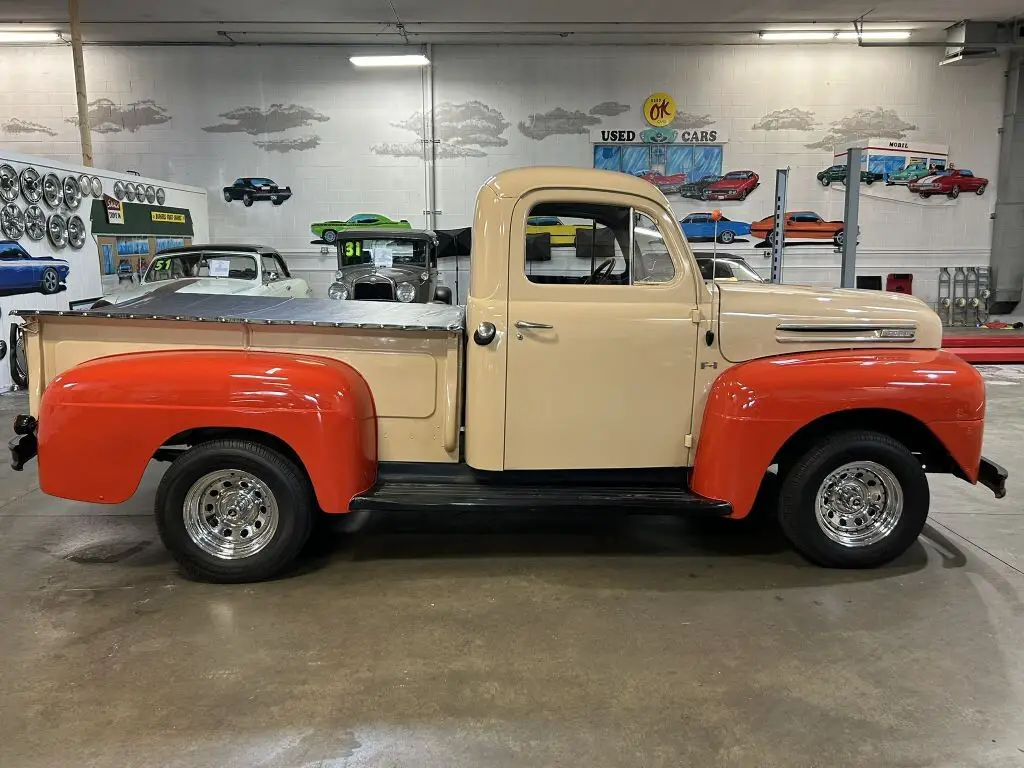 This 1950 Ford F-1 Pickup truck features a two-tone tan and orange maroon finish| complemented by a black cloth bench seat interior. This F-1 is a good-looking pickup that runs and drives very smoothly. It sits on 15'' factory chrome wheels with wide tires. Overall| the body of this truck is solid| with good fenders| doors| hood| cab| and frame. All the wood on the bed is in great shape. The paint shines nicely| but some scratches and chips on the finish give it character. The black bumpers are in good shape with only minor scratches. Under the hood is a 400 CID and TH-400 3-speed auto| both out of a 1968 Pontiac Catalina. It operates on a 12-volt system| and all electrical components function properly. The interior looks good| and the bench seat is comfortable and in excellent shape. The gauge cluster is stock| and the speedometer is operable. Sunpro gauges at the bottom of the dash show better than the original gauges. It has a working AM/FM/USB stereo mounted underneath the dash. This 1950 Ford F-1 is an excellent truck for getting in and cruising| hobby farms| or just taking it to a car show. It is a must-see! Please feel free to ask us for more information. Call us at 763-434-6565 / 763-999-1098 or email '' route65sales@gmail.com'' to inquire about this 1950 Ford F-1 Pickup truck. WE ARE OPEN TO TRADES! FINANCING IS AVAILABLE!