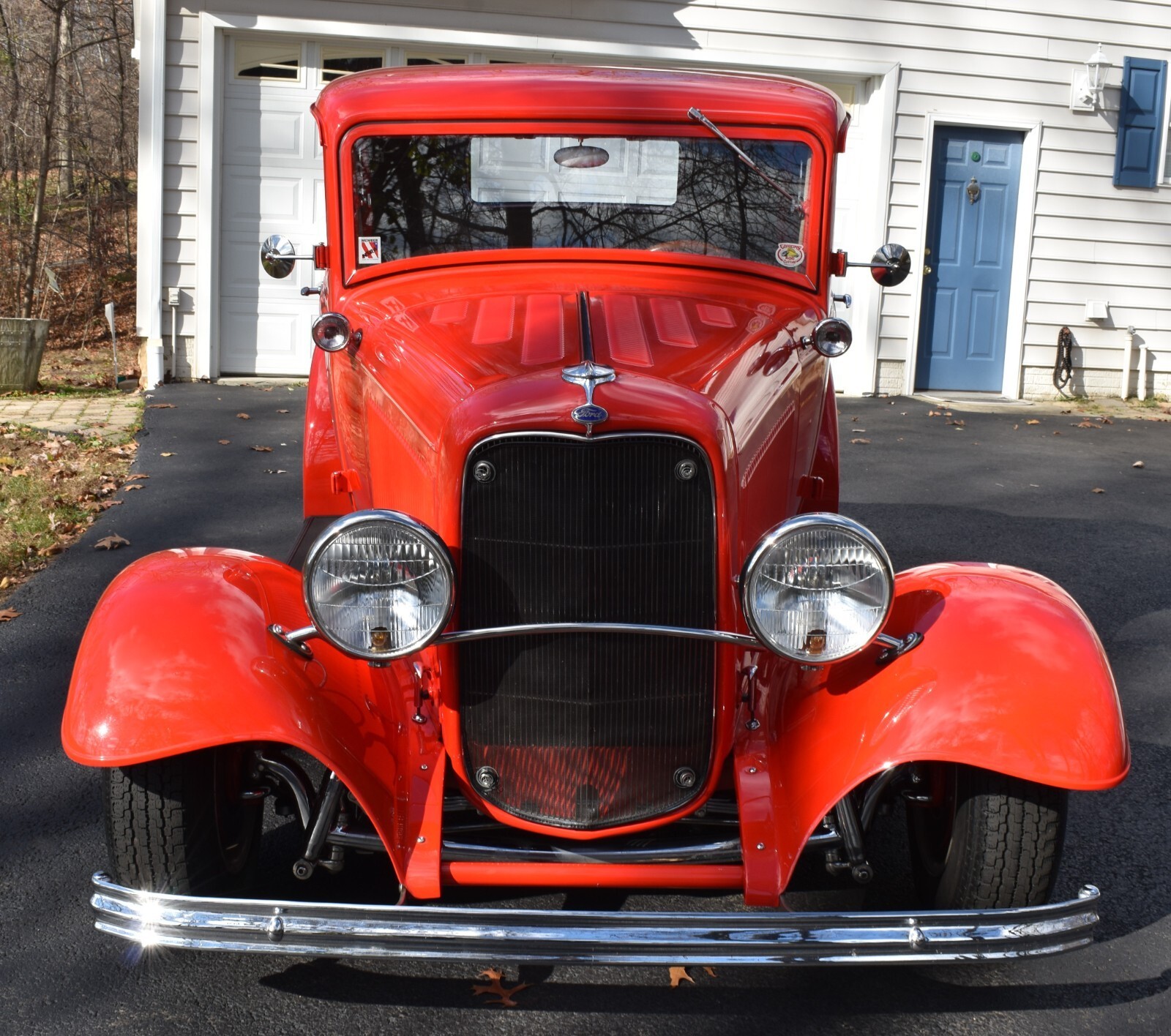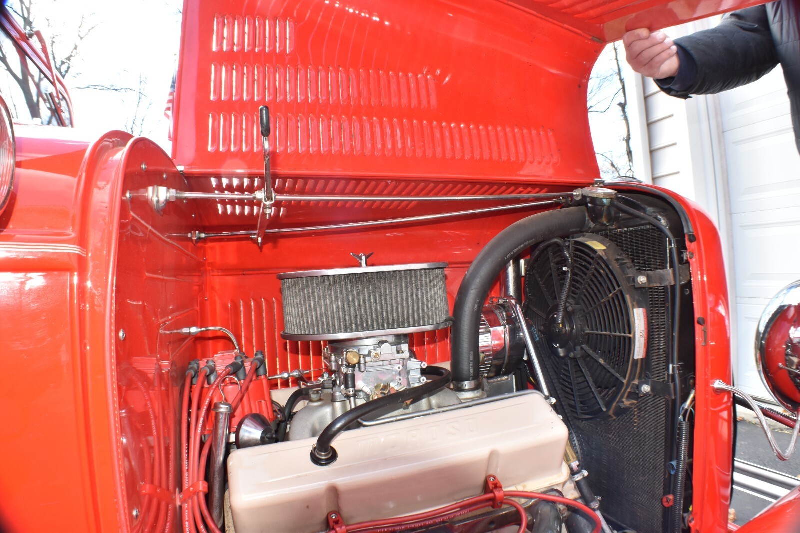 1980’s vintage 350 cu. in. Chevrolet V8 boasting about 300 horsepower with a mild hydraulic cam, Edelbrock intake & carburetor. HEI distributor and ignition, Sanderson ‘block hugger’ headers with dual exhaust. Battery is located in the trunk. Thermostatically controlled electric fan and Walker radiator keep the ’32 cool.