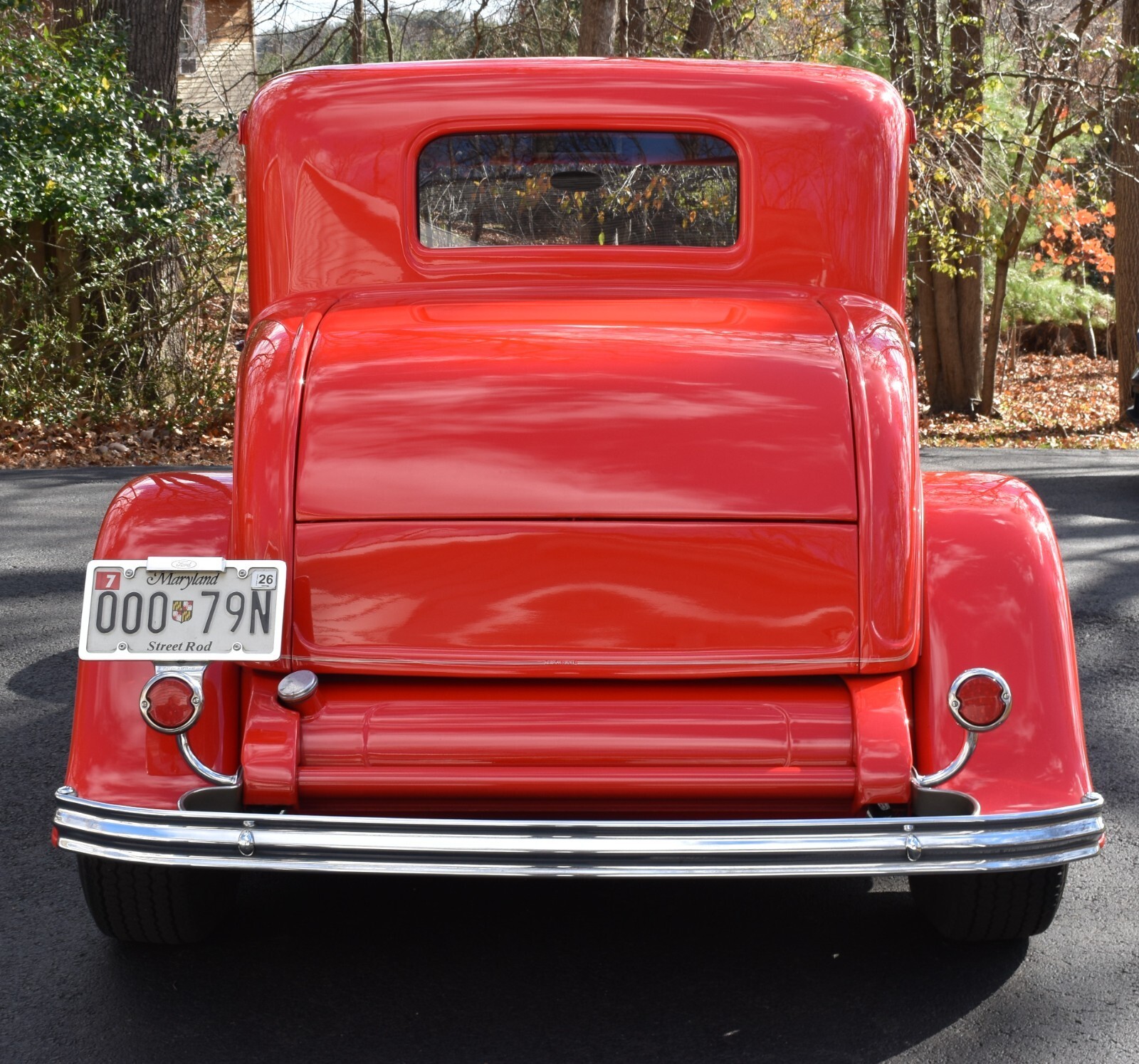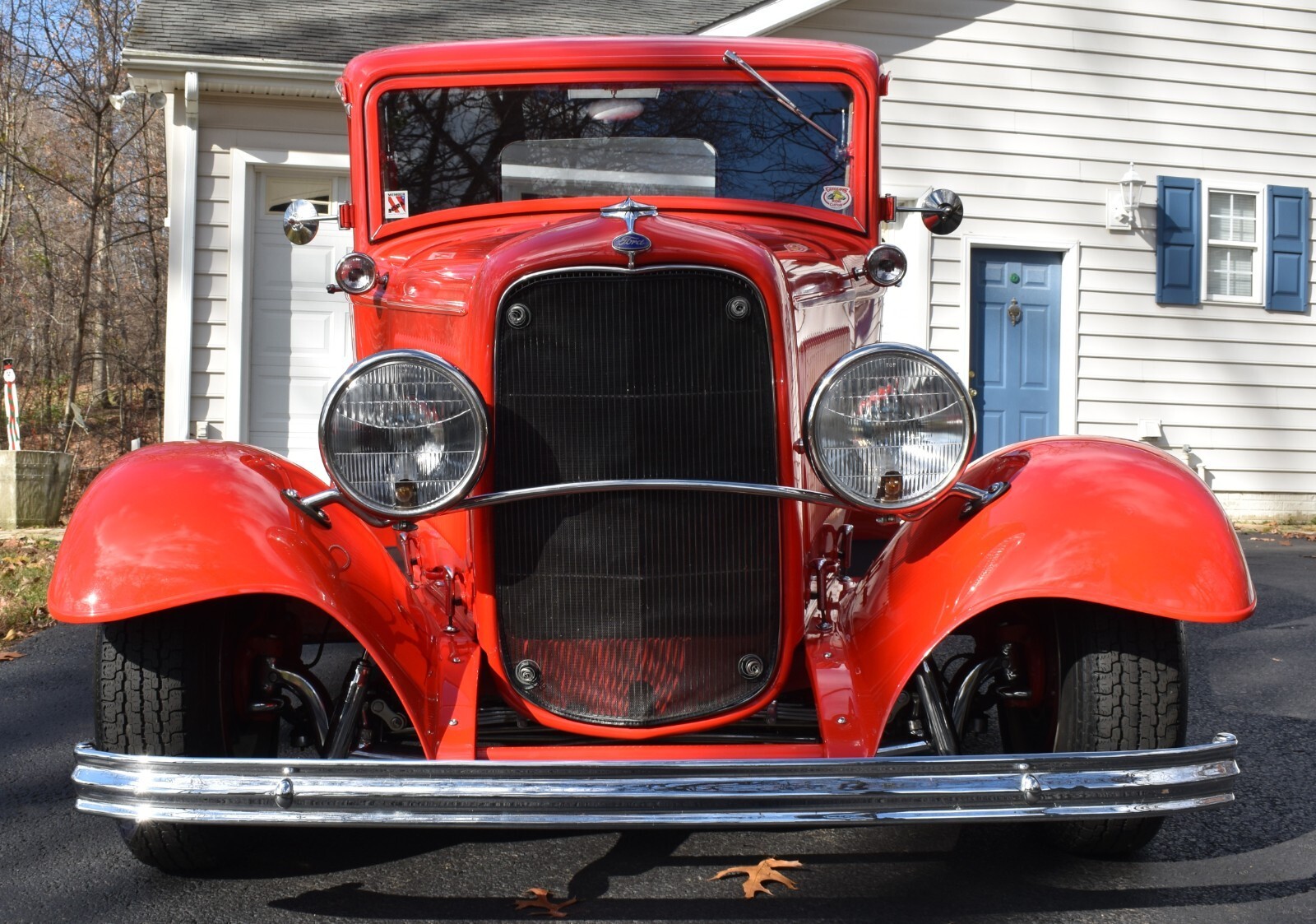 1932 Ford ‘Henry Steel’ body, louvered hood, and running boards. Outlaw performance fiberglass front and rear fenders. The paint is a 2-stage urethane in a 90’s GM red. Windows roll up and down easily and the front windshield ‘pop’s’ out. Also, the rear window goes up and down electrically. Paint is not perfect but shows well (see photos). Trunk opens with a release on the driver’s side. Support struts for the trunk need to be replaced, they do not hold it up.