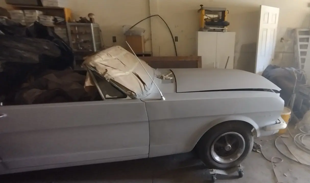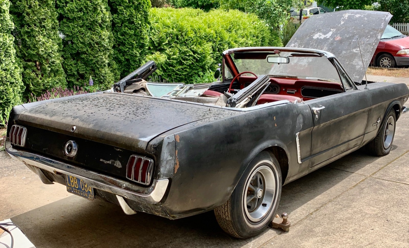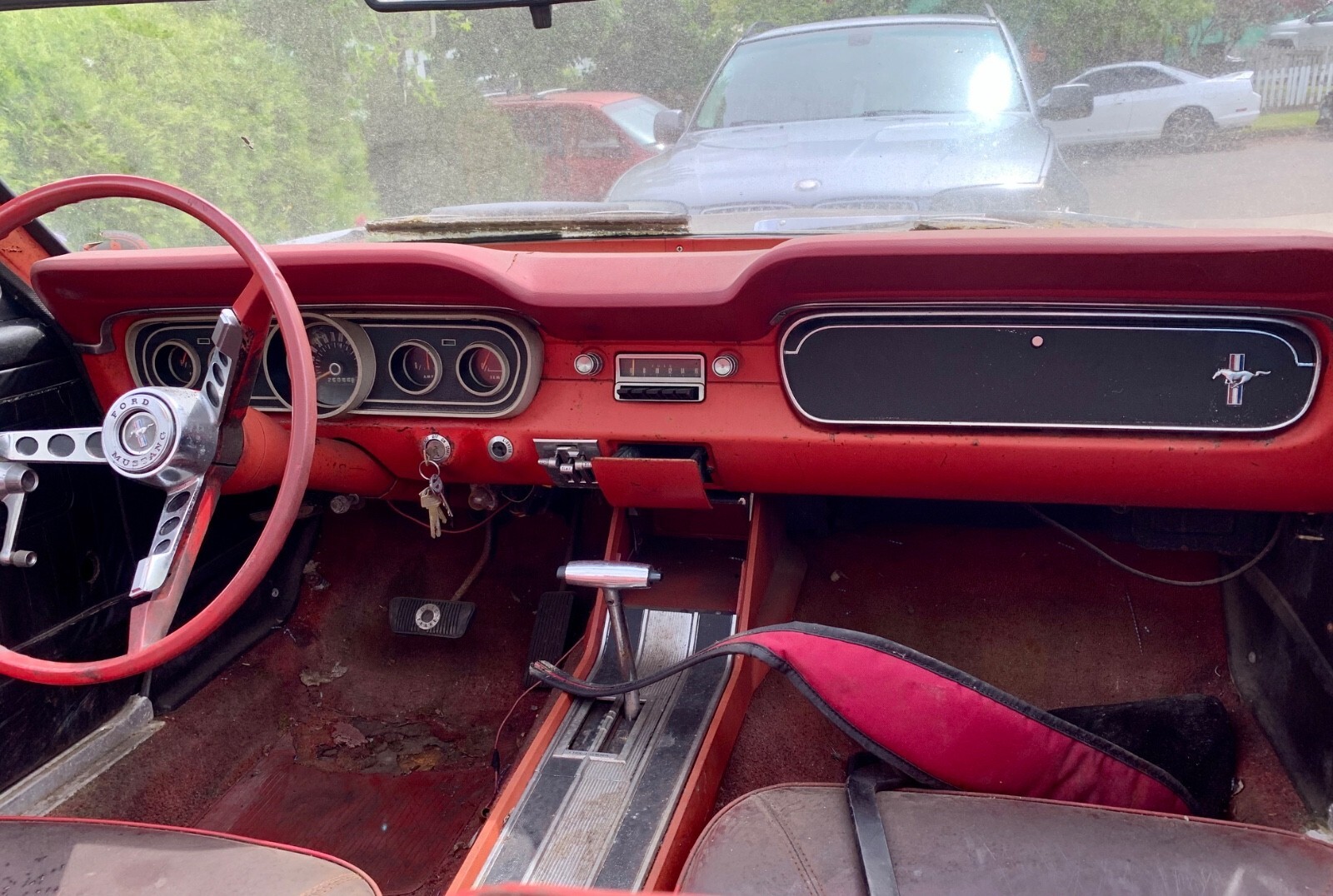 This is a 1965 Ford Mustang convertible. It was originally black exterior and red interior. It is currently in primer, however. The mileage is just 25,066. It has an automatic transmission. and a 289 V8 factory 4 barrel engine. This classic car was made in the United States in San Jose, California and has had 2 previous owners, both of them left it parked indoors since 1977. In all, it has been parked inside for nearly 50 years. Resulting in a classic car with virtually no rust. The engine does turn over with help, but it has not been driven in that time, so it needs to be taken apart and cleaned. It comes with the original vehicle title. One arm on the convertible top is broken. This unbelievably rare find is a great project car for collectors and enthusiasts of early Ford Mustangs. It is located in Oregon.