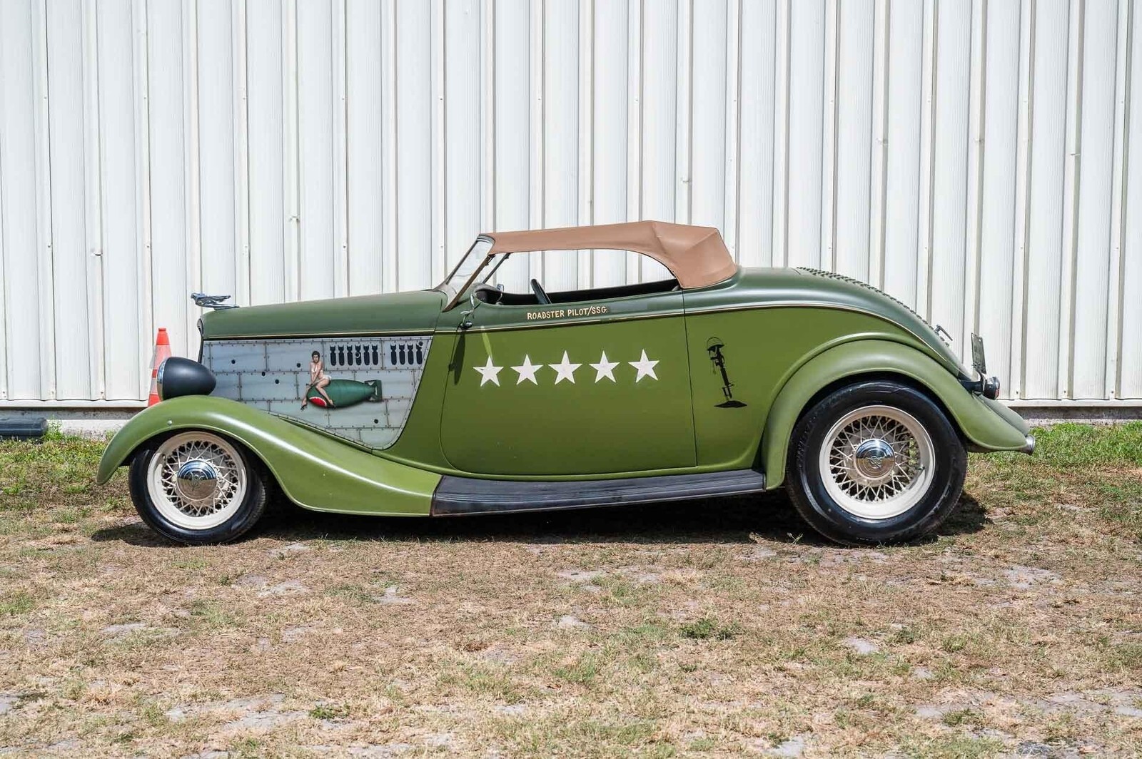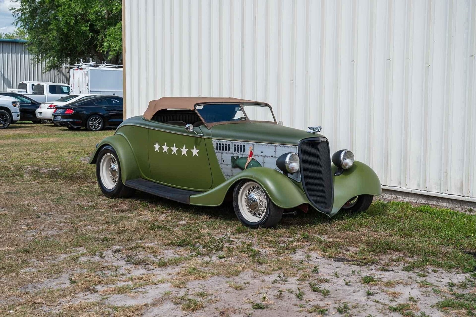 1933 Ford Roadster, WWII Tribute, Downs Body & Chassis, Steel Fenders & Hood, 383ci SBC, Automatic Transmission, Currie 9 Posi This ’33 Ford is a purpose-built, period-inspired WWII tribute that blends traditional hot-rod DNA with thoughtful, name-brand components. The look is authentic and intentional: hand-painted graphics, DuVall-style brass windshield, Dan Fink grille, recently upgraded to leather bucket seats, and a proper big-n-little wire-wheel stance. Underneath the skin, it’s a serious driver with a Downs body and chassis, a stout small-block, and a Turbo 350 Transmission. Highlights Downs fiberglass roadster tub on Downs chassis; steel front fenders and hood 383ci Small-Block Chevy V8, Griffin aluminum radiator for reliable cooling Turbo 350 Automatic Transmission Currie 9 smoothed rear housing with 3.55 Posi for balanced street performance DuVall-style brass windshield; Dan Fink grille Wheel Vintiques wire spokes: 17 rear / 15 front for classic big-n-little stance Lokar hardware (shifter, linkages, details) Hand-painted WWII-era tribute graphics (not vinyl) Up front, the Dan Fink grille sets the tone clean, traditional, and high quality. The DuVall-style brass windshield delivers the right pre-war profile while the hand-painted nose art pays homage to WWII iconography without looking contrived. Steel front fenders and hood give this car the right heft and panel crispness, while the smoothed Currie 9 out back and the staggered Wheel Vintique spoke wheels finish the silhouette like a proper lakes-style roadster. Drivetrain & Chassis Engine: 383ci SBC with the right street manners torque on tap and a healthy idle; Griffin radiator keeps temps in check. Transmission: Turbo 350 Automatic Rear: Currie 9 smoothed housing, 3.55 Posi a smart compromise for both cruise nights and highway stretches. Chassis: Downs frame engineered for rigidity; the car tracks straight and feels planted. Interior Tan Leather Bucket Seats. Lokar shifter and hardware for precise, clean operation. Straightforward, driver-first layout with a focus on function over frills. Tribute Details WWII-style hand-painted graphics done the right way by hand so it ages with character. Built to be driven and shown; it presents well and turns heads, but it’s not a trailer-queen museum piece. If you’re looking for a ’33 roadster that honors wartime heritage with credible hardware and real road manners this WWII Tribute delivers the brief. While we do our best to provide the highest quality muscle cars with an honest and reliable description and realize the importance of transparency when selling vehicles. That being said, we have not built, modified, changed or personally owned this vehicle. Whether this vehicle is consigned or owned by Past & Present Motor Cars we do not know the vehicles complete history since new. We want to be clear and try to answer any questions our customers might have prior to purchasing. Additionally, we not only welcome but we encourage 3rd party independent inspections. Please inquire prior to purchase to make sure the advertised vehicle has not already been sold. We list our vehicles on multiple websites and a vehicle can sell at any time. If a customer chooses to purchase sight unseen (many of our customers choose this option) the customer accepts the vehicle AS IS and WHERE IS and understands we cannot address concerns after purchase. For this reason, it's important all concerns are addressed prior to purchase. We make every effort to present accurate and reliable information, but use of this information is voluntary, and should only be deemed reliable after an independent review of its accuracy, completeness, and timeliness. It is the sole responsibility of the customer to verify the existence of options, accessories and the vehicle condition before time of sale. Financing is Available with low rates and Vehicle Shipping is available from our Showroom to your Garage. A Classic Car Warranty is Available for Purchase from a 3rd Party. Please speak to our Sales Associate or Company Representative for more information. Our team is working and available anytime by Phone or Text for your convenience at 407-559-7759. Thank you for your interest!