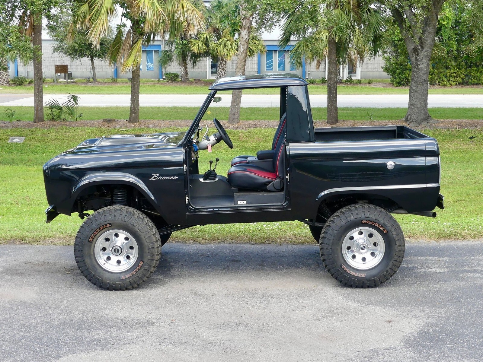 Our Bronco is finished in fresh Metallic Black paint that shines like no other. It looks better than it did from the factory without a doubt! She comes complete with full doors, safari bar doors, and even painted fiberglass door inserts should you prefer that look better. This Ford is riding tall on a set of American Racing alloy wheels wrapped in 33in General Grabber Radial Mud Terrain tires.