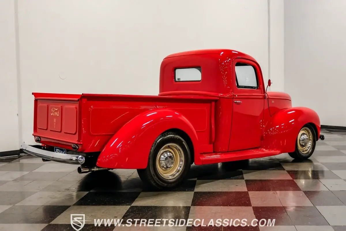 Factory steel construction with fiberglass rear fenders gives this 1940 Ford Pickup 1/2 Ton a perfect blend of classic form and modern practicality. Red paint flows across the body panels while chrome bumpers frame the front and rear. Dog dish hubcaps with beauty rings complement the 15" wheels, wrapped in 205/65R15 front and 235/70R15 rear tires that provide the stance and grip needed for daily driving. Pin striping accents the bodywork and tailgate, while modern wood bed inserts complete the exterior package.