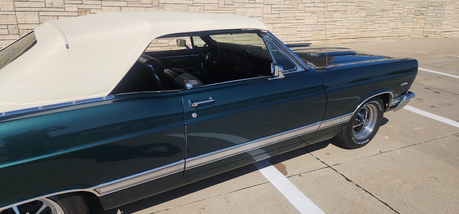 Check out his 67 Ford Fairlane XL Convertible. The color is dark moss green metallic with black bucket seats and a white convertible top. Under the hood is a 289 with a 4-barrel carburetor, dual exhaust for that “just right” sound. It is equipped with power steering, power brakes and ice cold air conditioning. It has an AM radio and the all important power top. The wheels are new magnum 500 and the tires are brand new BF Goodrich TA Radials. This Fairlane XL convertible not only looks and sounds great…it runs great as well.