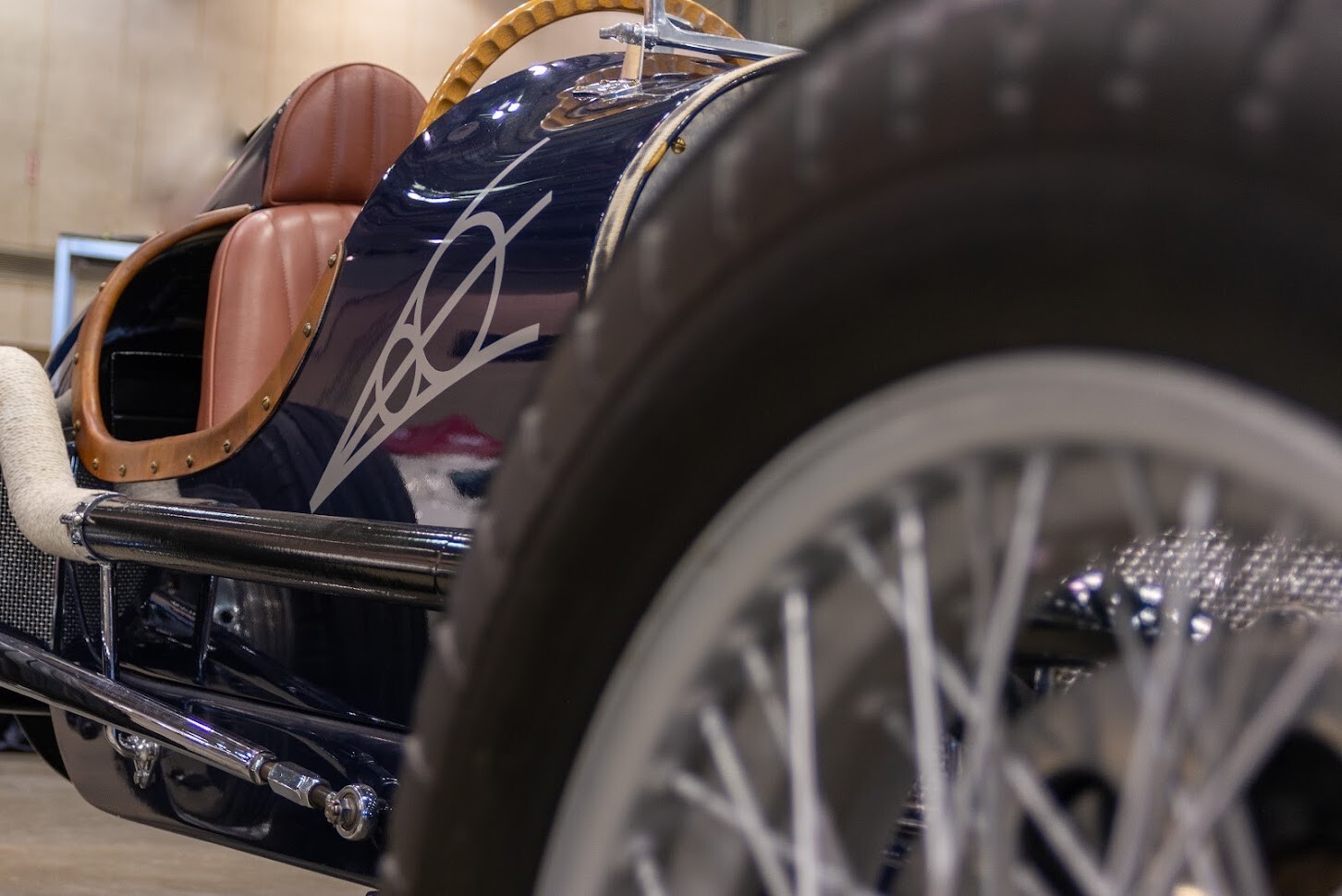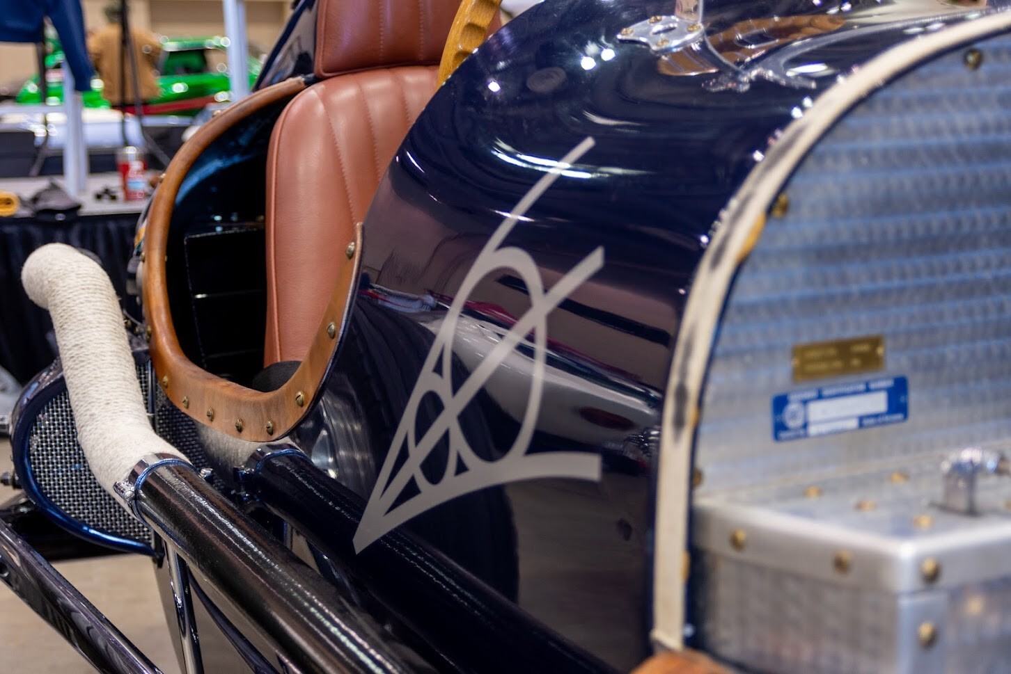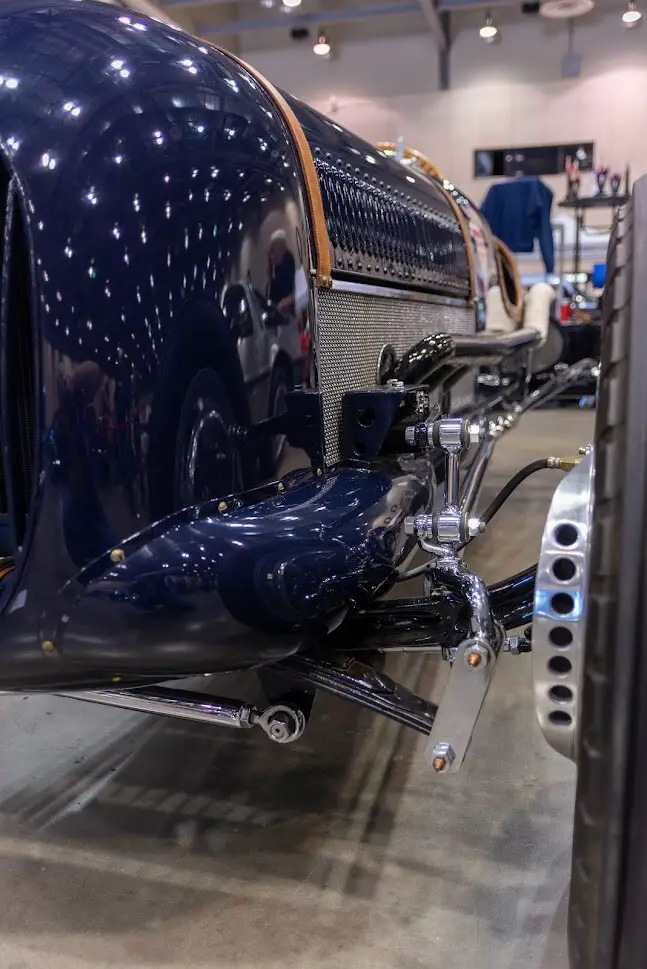 But the Reklus Ford special has a much simpler feel. It sports a period-correct Ford flathead with a 2×4 downdraft carburetor intake and aluminum Edelbrock heads. Large, cast aluminum brakes can be seen through the 20-inch, knockoff wire wheels, and vintage Firestone rubber helps compete the image. The lengthened V8 decal on the side of the car is a period detail, seen on the Miller-Ford Indy cars and others. The interior is everything you’d expect, from the machine-turned dash, to the center-mounted shifter, Brooklands-type screen and period-Ford gauges.