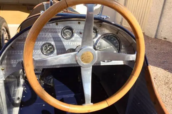 The interior is everything you’d expect, from the machine-turned dash, to the center-mounted shifter, Brooklands-type screen and period-Ford gauges. This isn’t a amateur rat rod. The aluminum body race car was hand-molded by craftsman and the entire car hand-fabricated much like the elite cars of yesteryear.