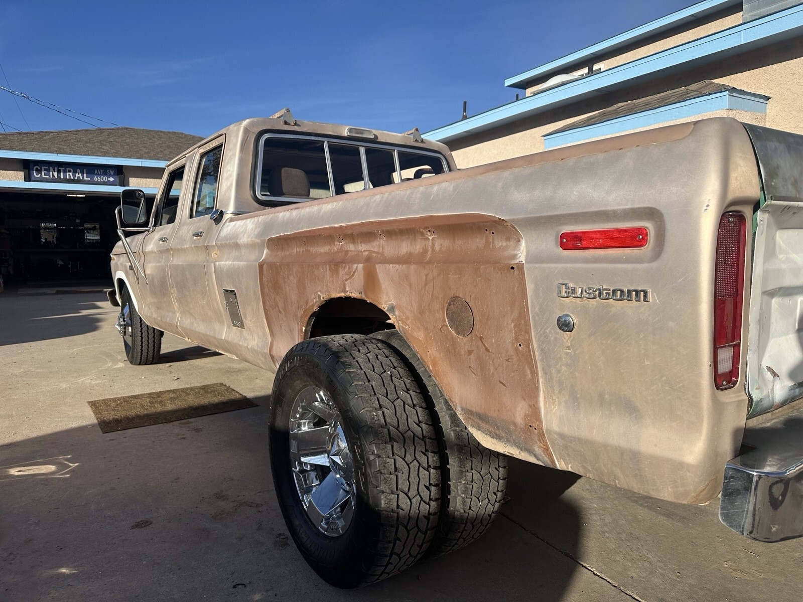 Has a 92 f350 drive train swap. Ford EFI 460, e40d transmission with a gear vendors overdrive. Estimated 14,000 miles on the swap. Runs fantastic fires right up. Sounds great! Has all the necessary equipment needed for heavy towing. Has a extrnal transmission and oil coolers. Engine has long tune headers, banks ram air intake and full 3in exhaust this truck sounds amazing! All the lights work as it sound. Trucks only been driven by me around town. 20-50 miles But It will idle in traffic and behave like a Honda. I personally would not hesitate to take this thing anywhere you wanted to go right now. We got the truck without any interior. We sourced seats from a 90 crew cab ford (bolted right up) and ordered a brand new carpet kit and installed it. The truck has great glass! And both the front and rear window are new and have new gaskets. It has a rear sunroof yes. Bed seems to have had a hitch bolted in but no big holes or cuts to it. Body is very straight, floors frame, all super solid no rust look at the pictures. The passenger drip rail has a few tiny rust spots but that’s it. I unfortunately was unable to find a factory set of dually fenders that this truck once had. I did buy a set of new ford 53 fenders from classic industries that will go with the truck.