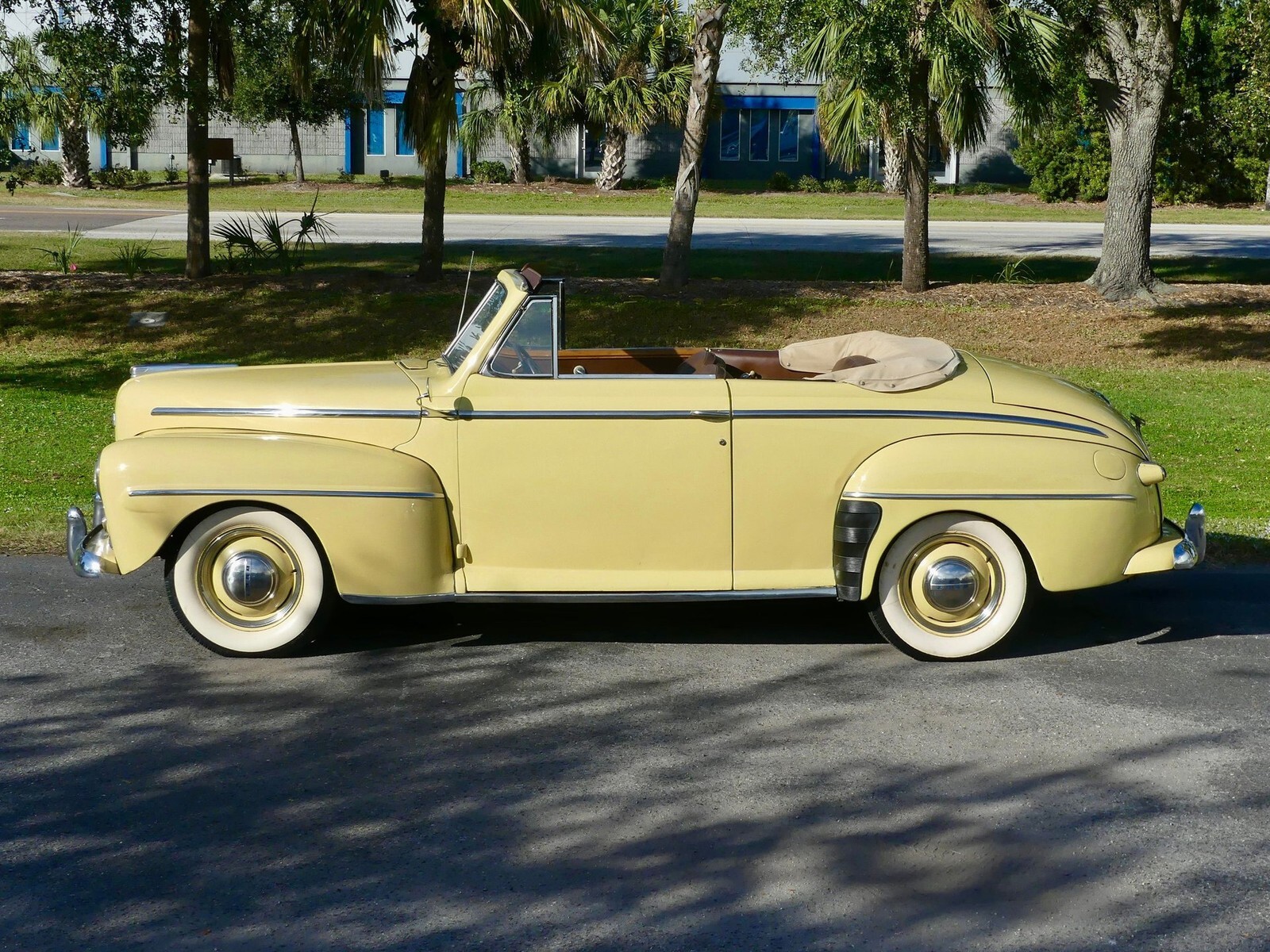 This Super Deluxe perfectly captures the essence of post waroptimism and is finished in an older Yellow lacquer paint job that is aging but still shows well. The chrome and brightwork are in good condition and the steel wheels wrapped in whitewall tires togive it a very classy look. The car does feature a power convertible top that is currently inoperable, but can be raised and lowered manually.