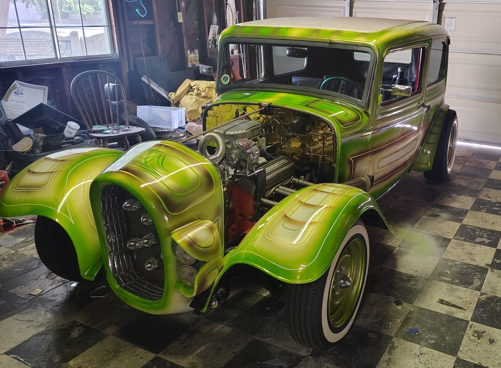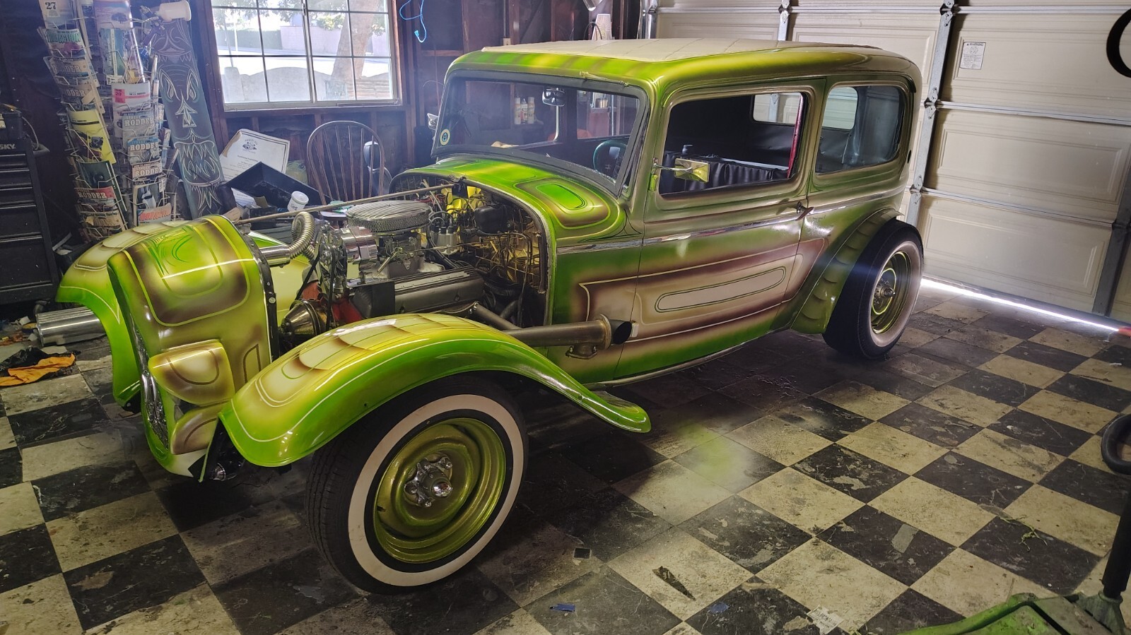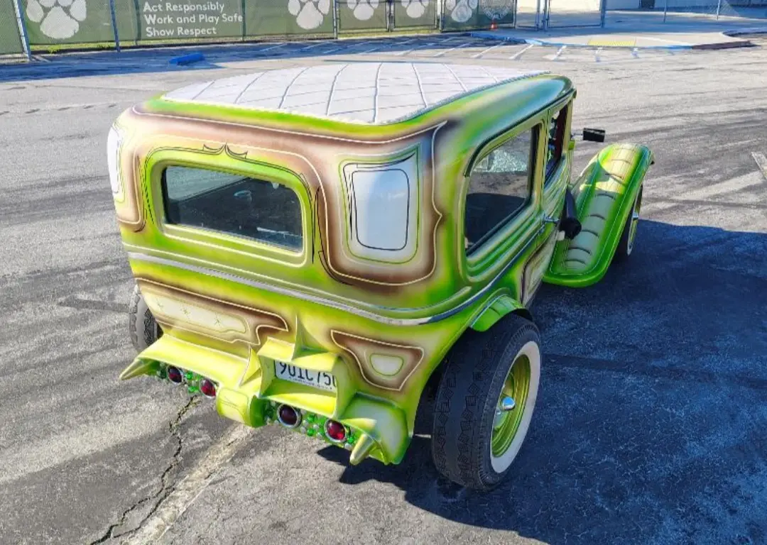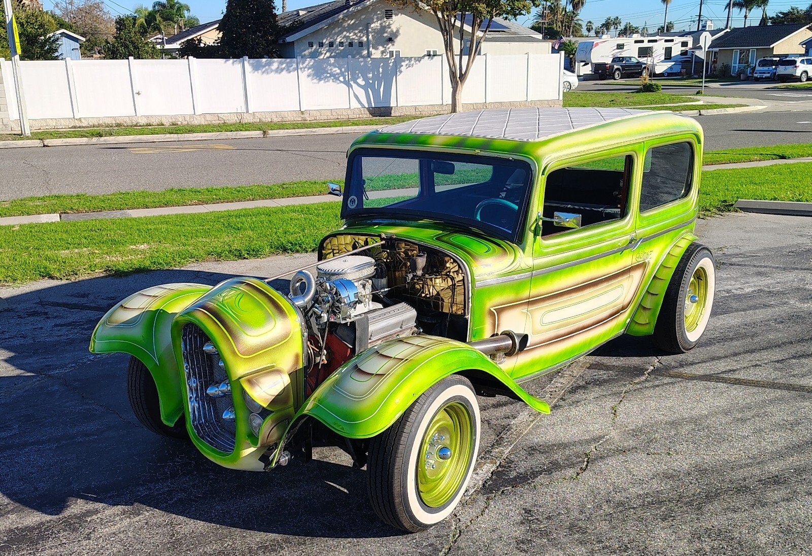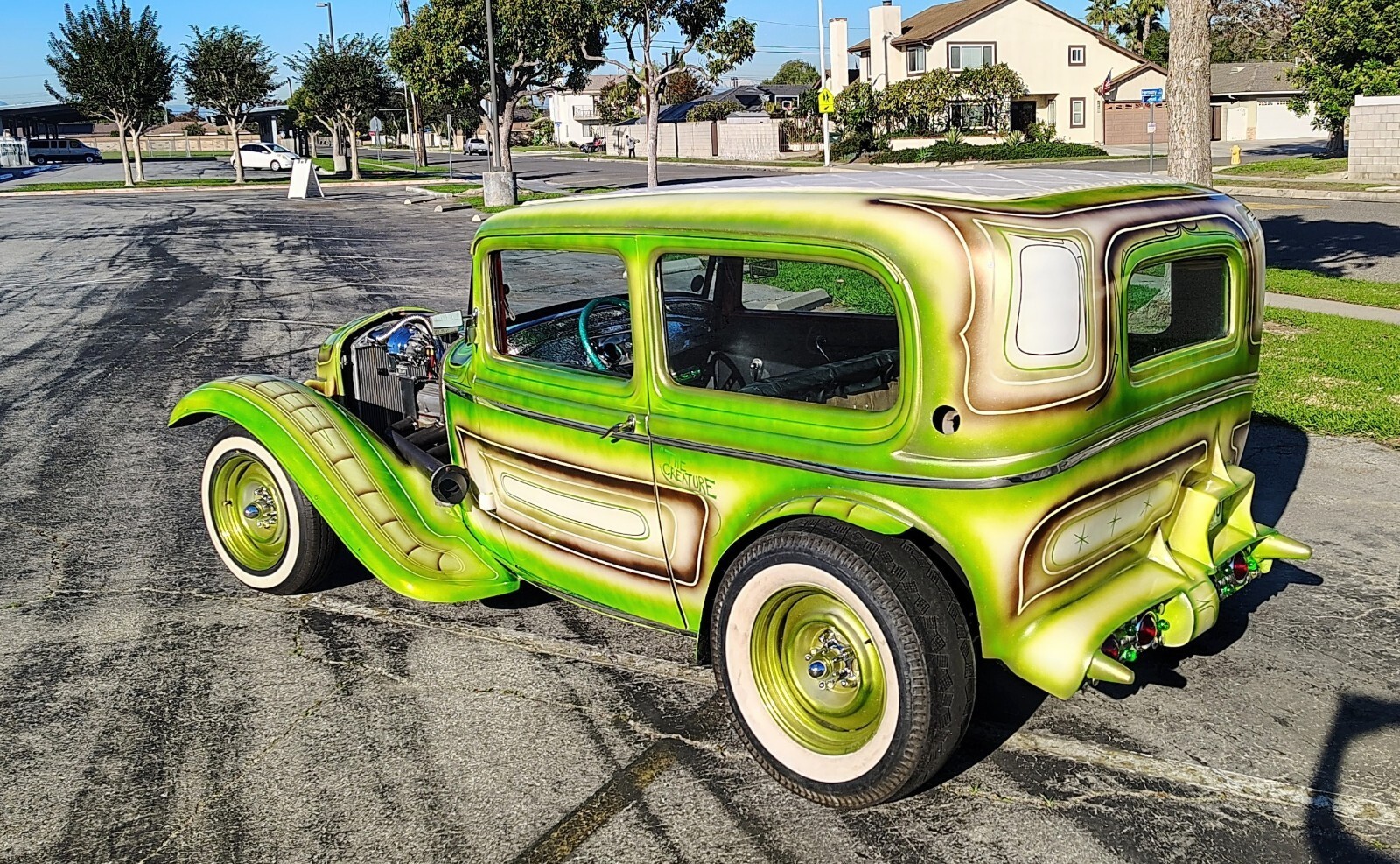 1932 Ford Tudor sedan. Radically Kustomized & channeled with wild paint. This Kustom 1932 Ford 2 door sedan is a radical 1960s styled Kustom one of a kind. Engine is a Corvette 283 V8 with a automatic powerglide transmission and a 1959 Corvette rear end with 4 bar coil over suspension in the rear whith wall cheater slicks... This hotrod is a Kustom time capsule has the same wildness as the lil coffin any true Kustom person will know that channelled Tudor before it was in its final faze of being a showrod it was more like this one It's obviously not the same but the feel was alike.. it's a fun little hotrod and needs a good home for somebody to put some final touches on it maybe a 4 duece intake things like that. This is a mixed media build like those of the 60s the Kustom grill shell is built out of fiberglass the fenders are steel the body is Steel the rear kustomization was done out of fiberglass as well. New video added!!!. Or check out thisYouTube link just copy and paste.