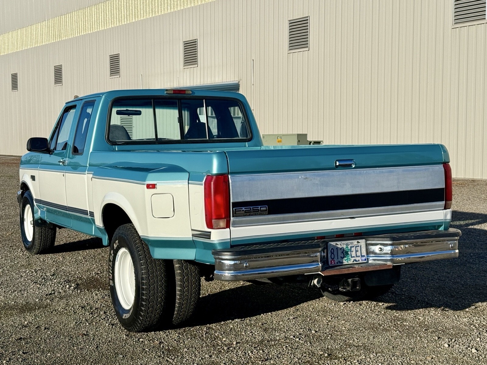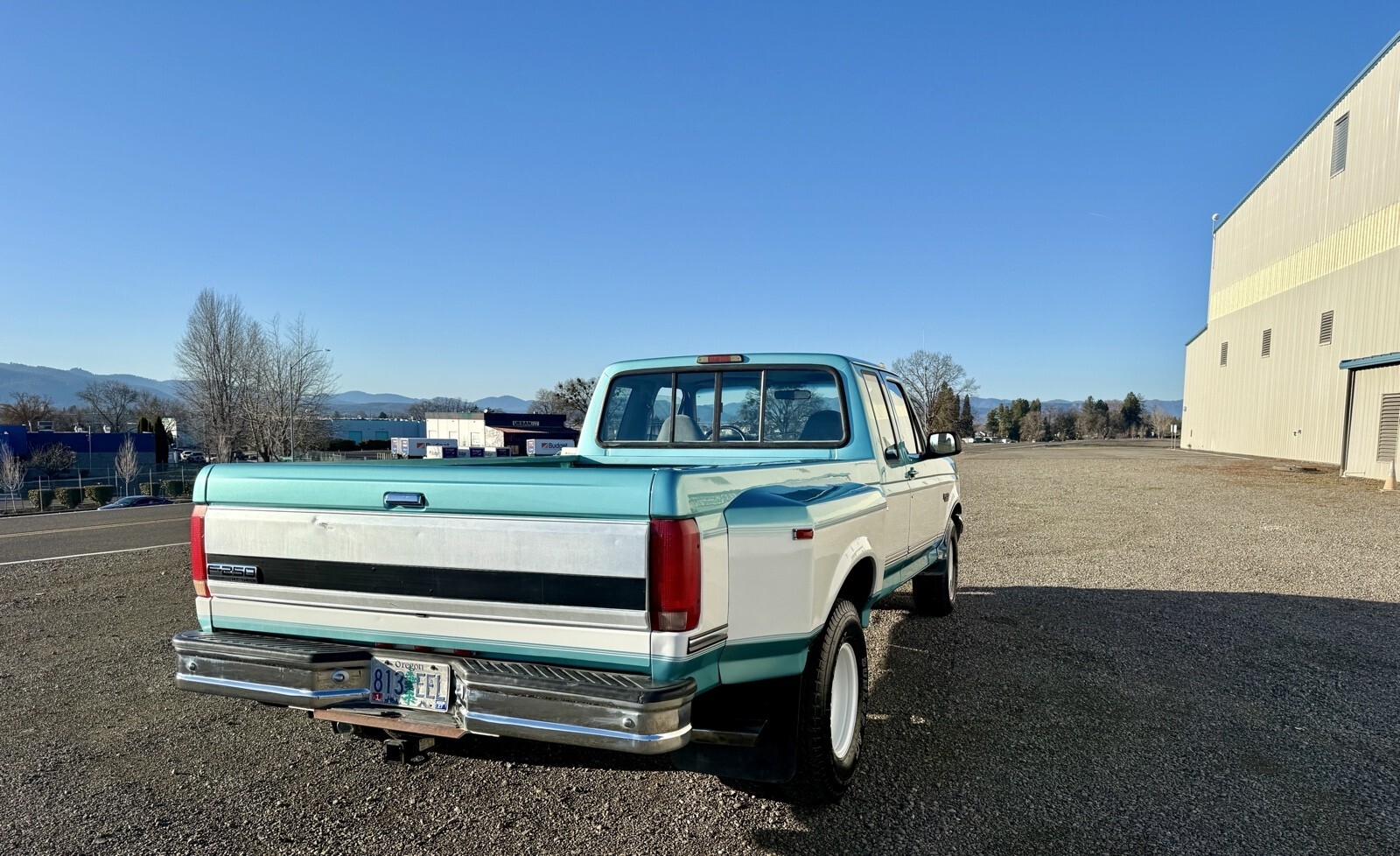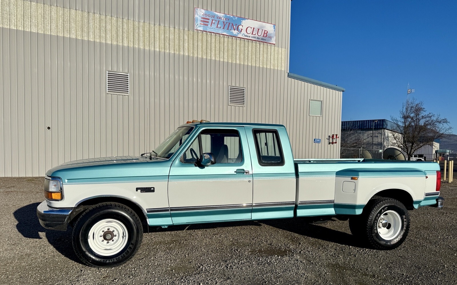 This 1994 Ford F-250 XLT is a SuperCab dually pickup that has 97k miles following registration in California and Oregon. Finished in Tobago Green Clearcoat Metallic and Oxford White over Opal Gray cloth, it is powered by a 7.5-liter V8 linked to a four-speed automatic transmission. Equipment includes 16″ wheels, front disc brakes, chrome bumpers, a sliding rear window, a receiver hitch, front captain’s chairs, air conditioning, cruise control. The truck is finished in Tobago Green Clearcoat Metallic and Oxford White. The 7.5-liter
