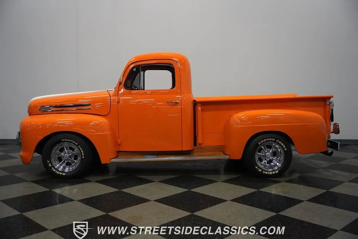 This 1949 Ford F-1 pulls off a masterful visual trick - it's a truck that blends two generations into one, mixing the original '49 grille and hood with the advanced styling of '51-'52 fenders and headlight placement. The result? Pure magic in orange and cream two-tone paint. Custom details abound, from the crisp white racing stripe to the rich wooden bed planks and running boards. Chrome Cragar SS wheels - 15 inches all around - anchor each corner with authority, wrapped in P255/60R15 rubber up front and muscular P295/50R15 tires out back. The bedsides feature unique carpet-like material, adding an unexpected custom touch to this classic hauler.