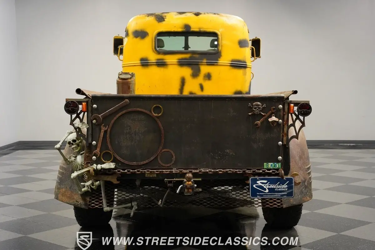 Custom crafted over three years using modern Toyota Tundra underpinnings, this 1947 Ford F-5 COE 4X4 Custom wears Patina Yellow finish that tells its own story. Clear tri-bar headlights with integrated turn signals anchor the front end, while a saw blade visor adds custom flair above. The weathered wood bed construction uses two beds bolted together, complete with a bolted-in gas can connected to the fuel system. Chain and piston front bumper, exposed welds, and surface rust create authentic rat rod character. LT265/75R16 tires mount on 16" wheels at all four corners, with a tow hitch and wiring plug completing the functional exterior package.
