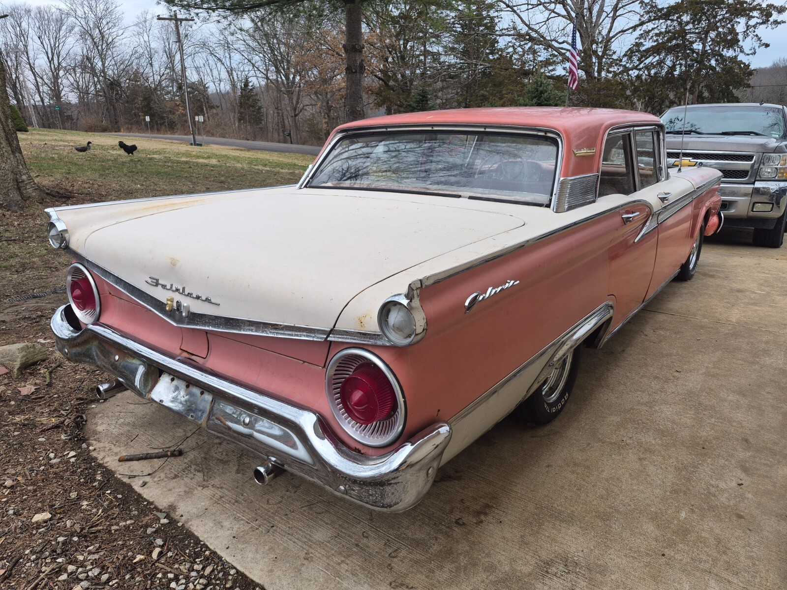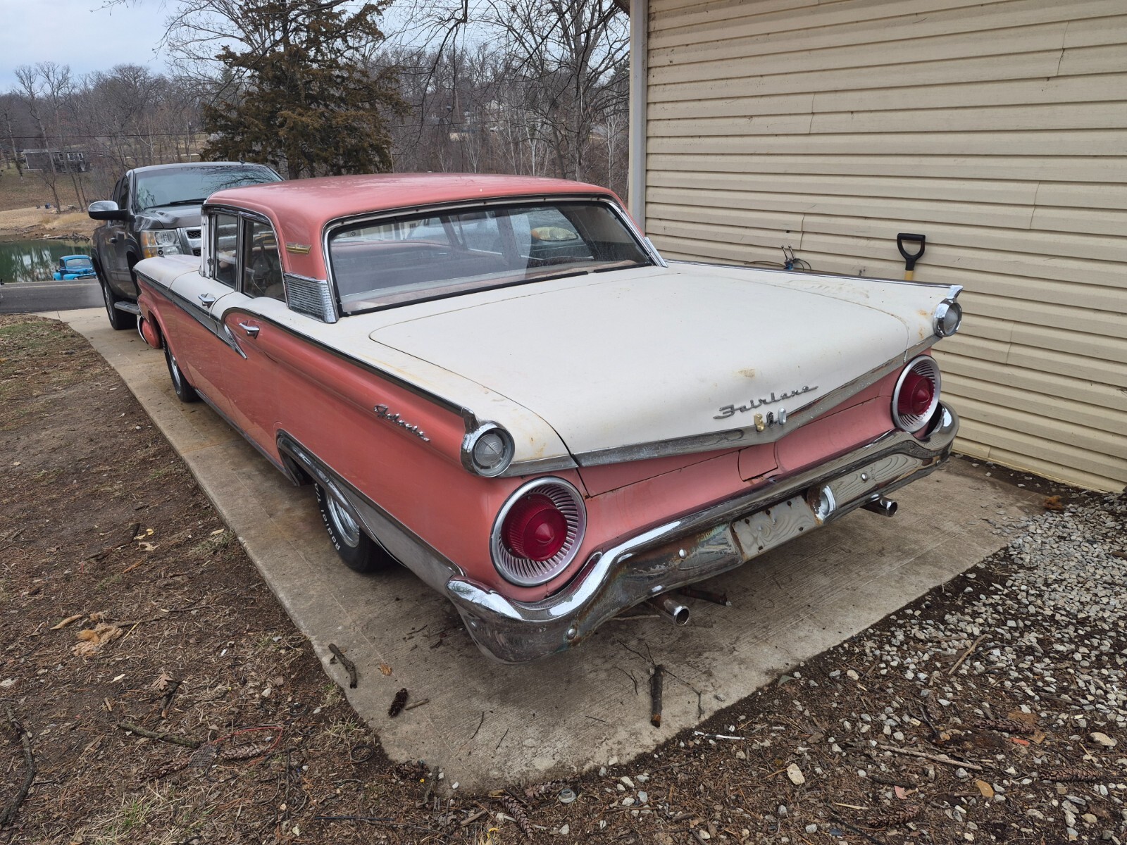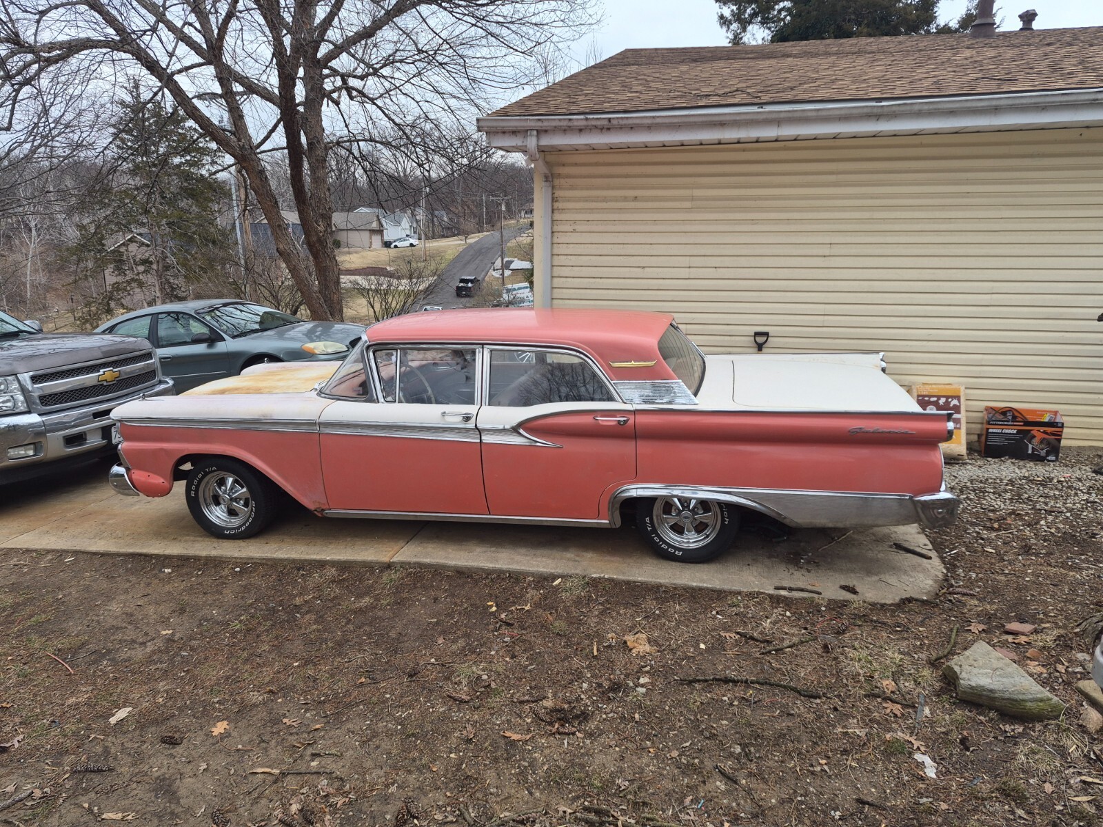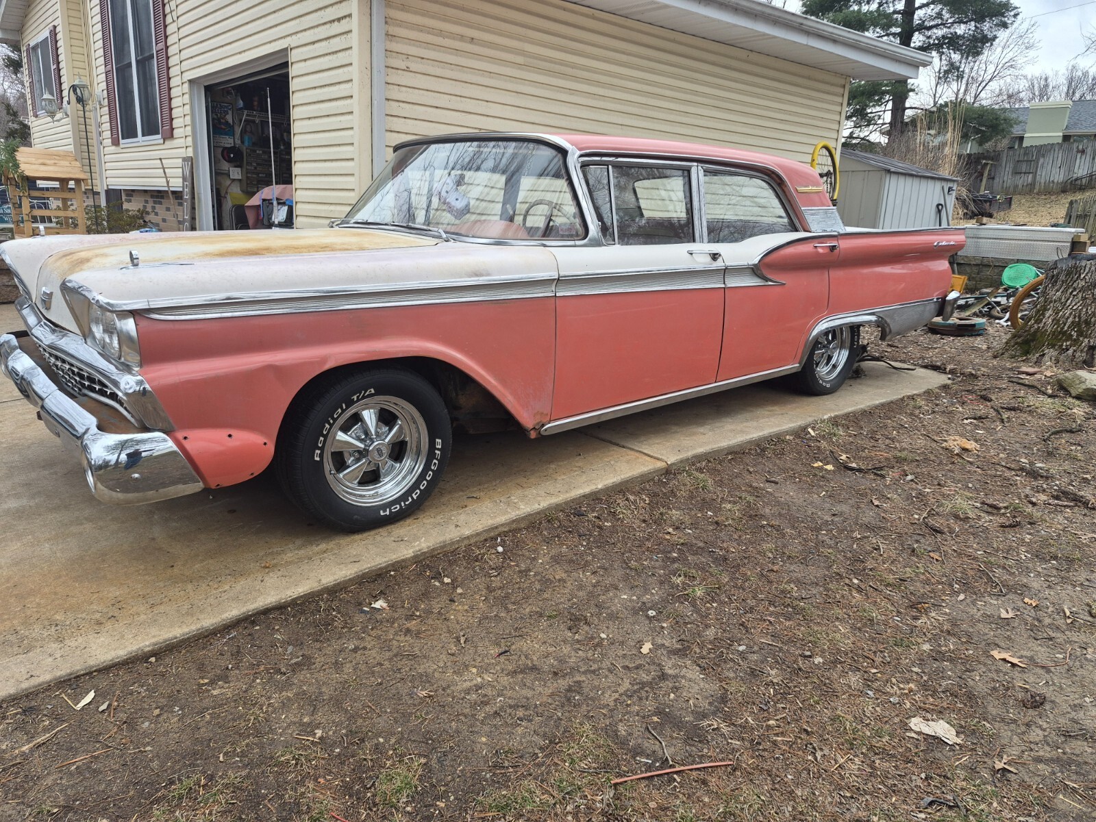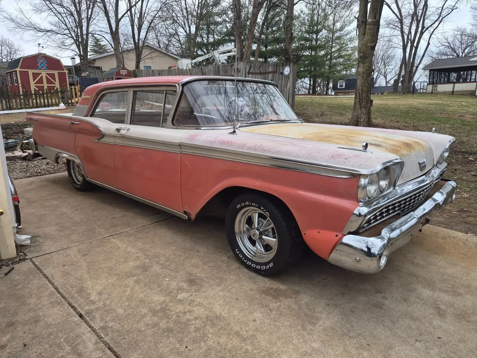 Very Very Solid original survivor. 1959 Ford Fairlane project car with the top of the line Galaxy 500 trim level. Odometer shows 51xxx and I truly believe thats accurate. ORIGINAL PAINT!!!!! Honest car no bondo or previous repairs that I can find, what you see is exactly what you get even the original floor boards are good. This is a Non running or driving project car. Was stored in a barn since the early 1990's and did run and drive when parked and at some point in time a previous owner upgraded the engine to a 1967 390 and C6 transmission. I had started to get it back into running condition and installed a new starter, carburetor, battery, solenoid, cables, HEI distributor, wires, plugs, oil change, etc. The engine is close to running and turns over freely and has great compression. It still needs a little under hood wiring, Fuel system gone through etc. The master cylinder is empty so no brakes. Car steers and rolls easy in neutral and goes into park. Clean open Missouri Title. THIS CAR IS SOLD AS IS FOR PARTS OR REPAIR / RESTORATION NOTHING IS TESTED ASSUME NOTHING. PICS ARE THE DESCRIPTION. Car is located in Ofallon Mo 63366 about 2 miles off of hwy 70, car transport access is not a problem. You can text questions to (636)three12-133eight thanks Ted