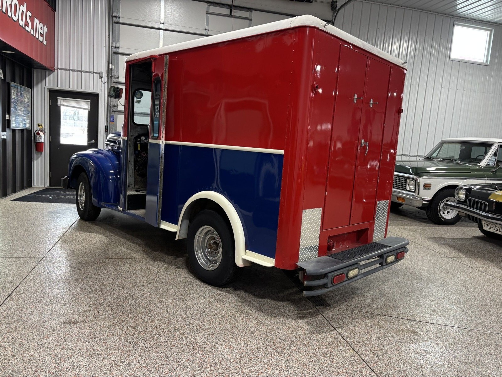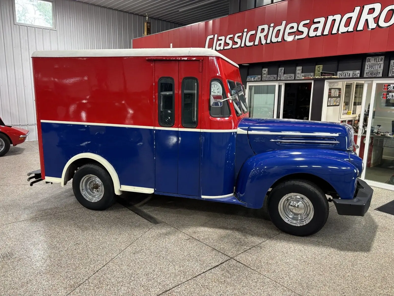This custom 1947 Ford half-ton panel truck was originally used as a home-delivery vehicle in Denver, CO, and features a restored and repainted body. It is powered by a period-correct Ford Flathead H engine that was rebuilt, with fewer than 500 miles since completion. Equipment includes custom front and rear bumpers, a new wiring harness, updated lighting and working signal lights, and corrected exterior bodywork prior to repainting. The rear compartment is fitted with metal shelving for special-event use for more info call Jordan at 612 290 9299