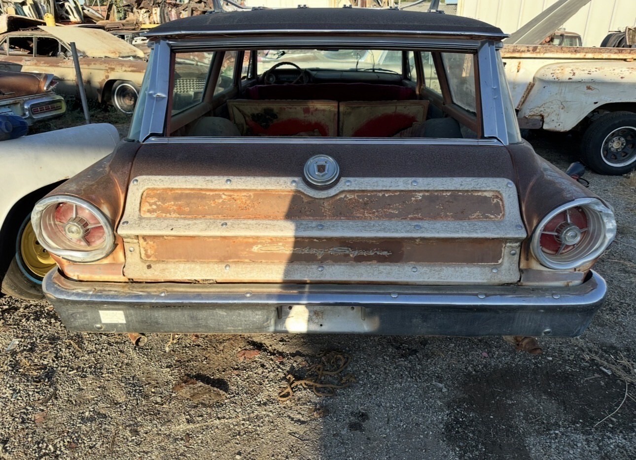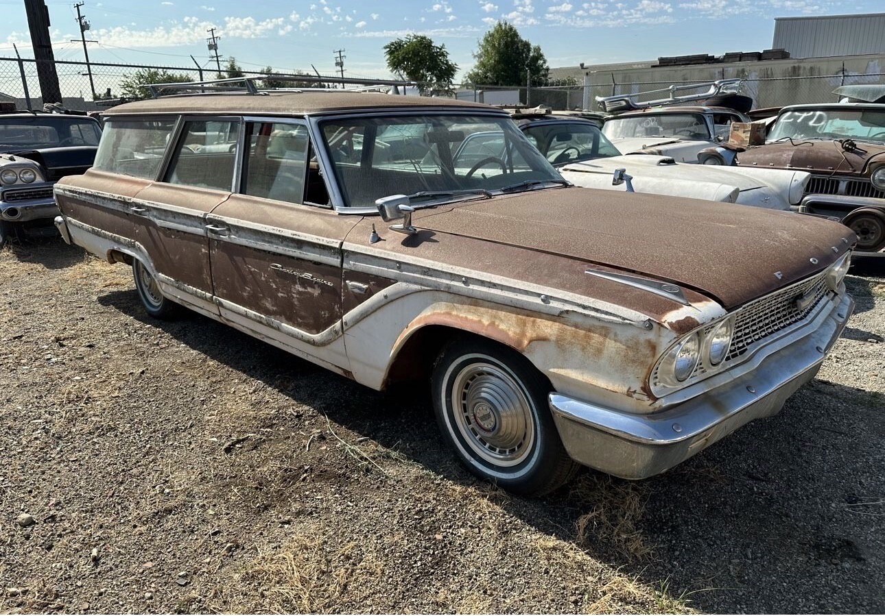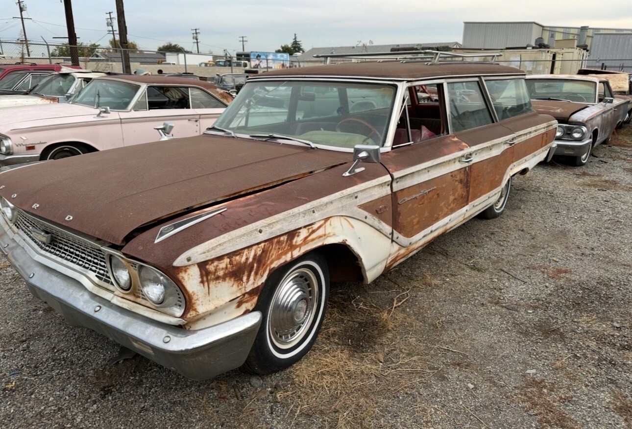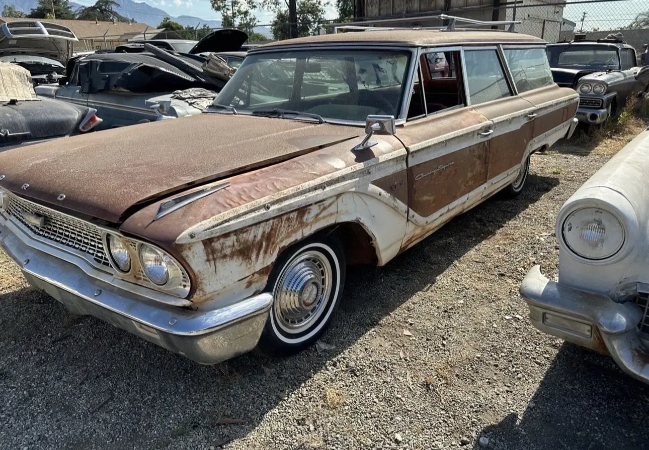 Here is a super original 1963 ford country squire. This car was acquired from the famous cuyama car garden in maricopa California. Car was parked in the 70s The car runs drives and stops. Has new brake shoes, hoses and wheel cylinders and new master cylinder. The original steel wheels were blasted and painted in the correct white color and new tires installed.