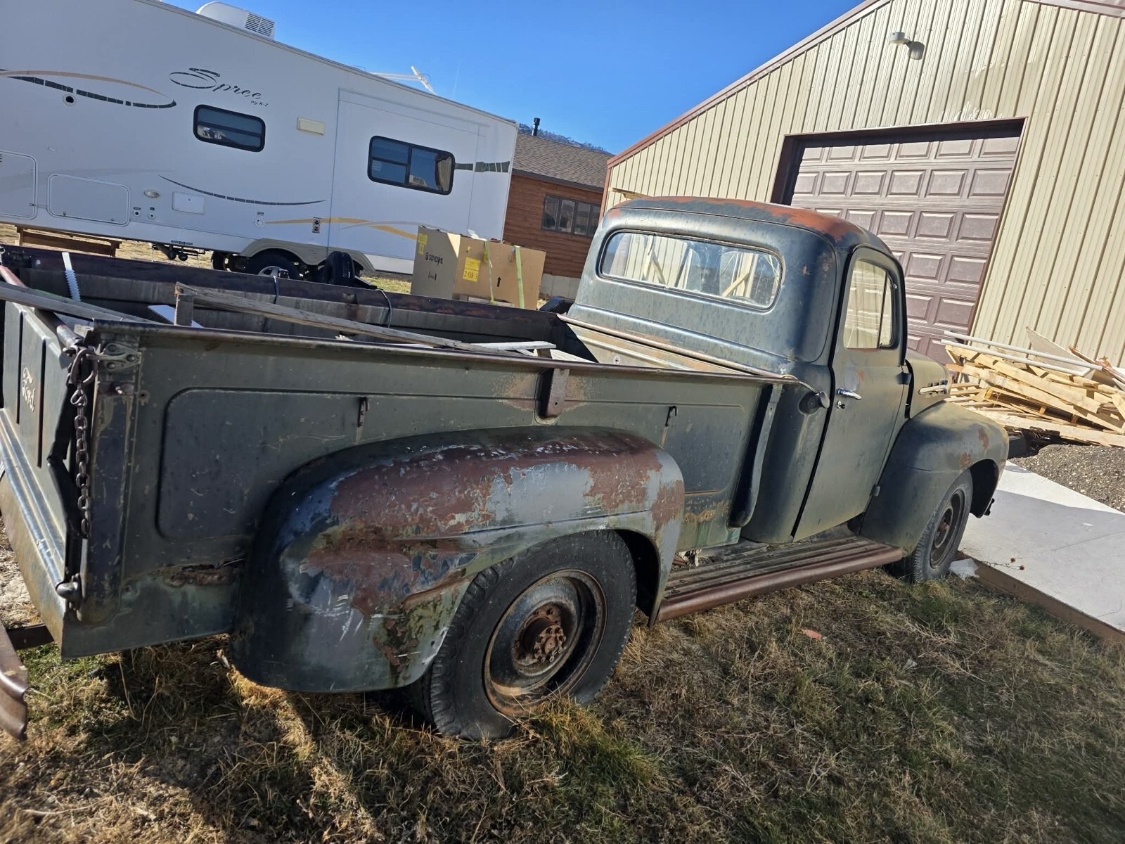 1952 Ford F3 4speed, with rebuilt mercury flathead engine in bay(53) and the original engine in the bed of the truck. This is mostly original for as much is can be. Remanned original radiator, engine was a purchased rebuild in about 2008. New clutch, bearing and resurfaced flywheel. Rebuilt carb. Hasn’t ran since. Life got in the way. My buddy bought this truck from my dad. I am helping him sell it. I have personally worked on this truck. This is definitely a project truck. It will need new bed wood and an unknown amount of restoration work to every inch of the truck. If interested, talk to me. I can tell whatever you want to know about it, just ask.