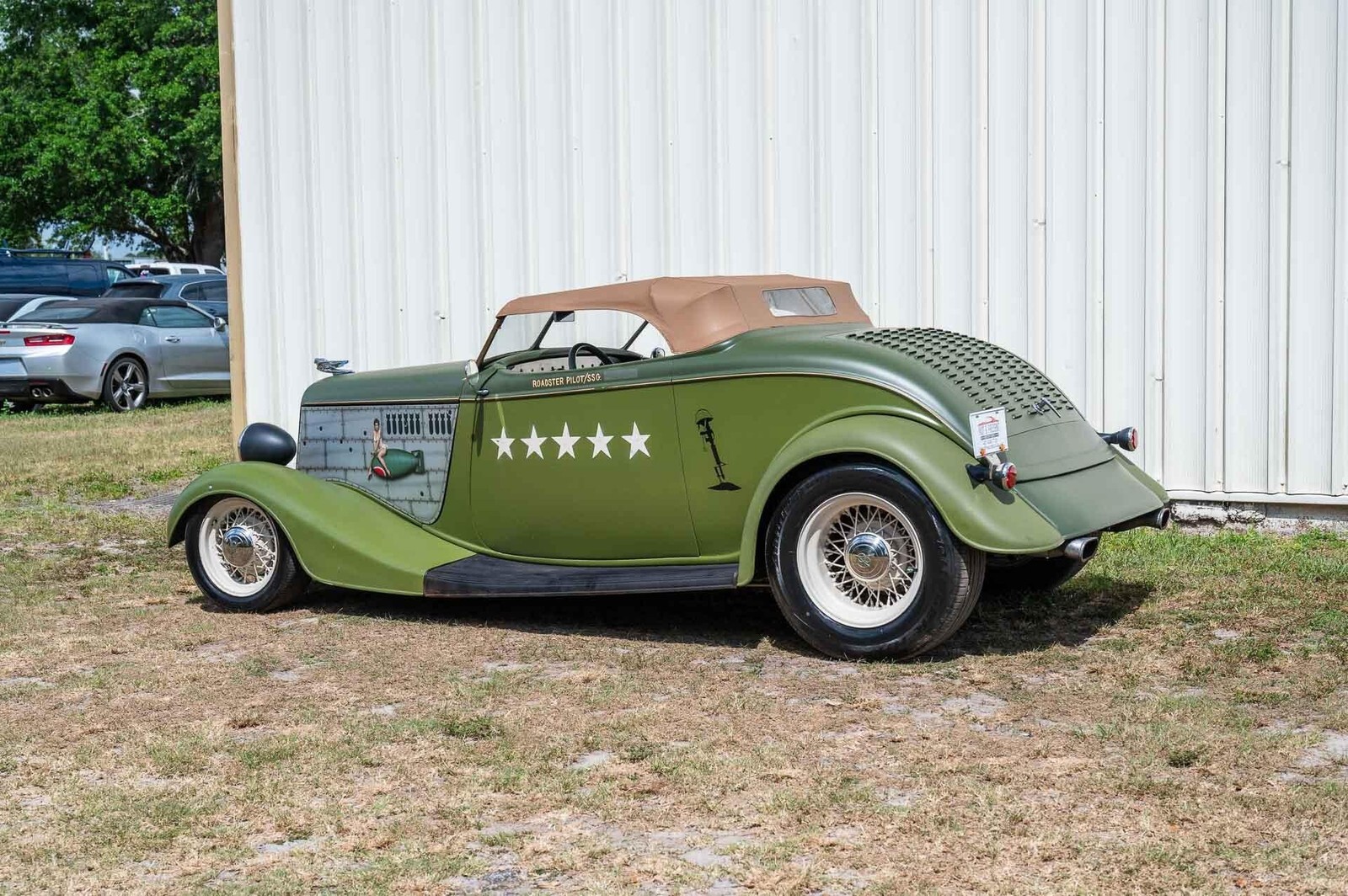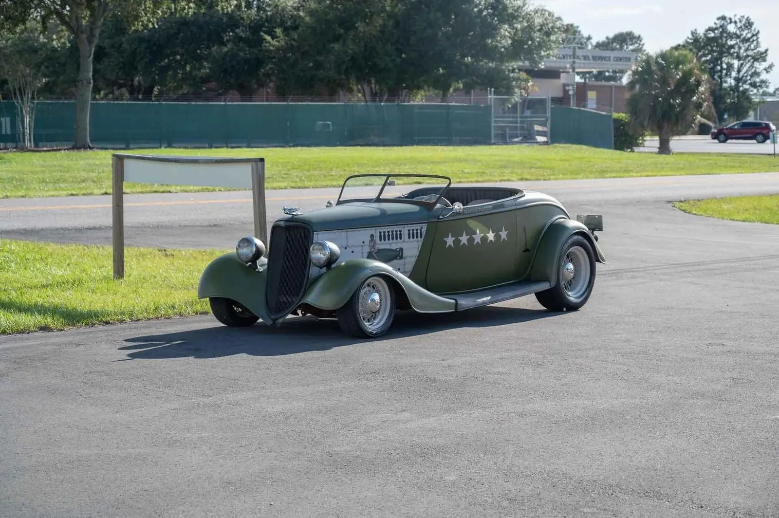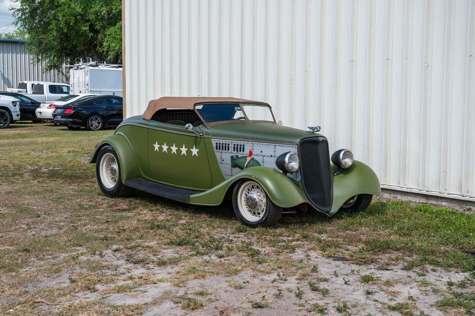 1933 Ford Roadster, WWII Tribute, Downs Body Chassis, Steel Fenders Hood, 383ci SBC, Automatic Transmission, Currie 9 Posi This '33 Ford is a purpose-built, period-inspired WWII tribute that blends traditional hot-rod DNA with thoughtful, name-brand components. The look is authentic and intentional: hand-painted graphics, DuVall-style brass windshield, Dan Fink grille, recently upgraded to leather bucket seats, and a proper big-n-little wire-wheel stance. Underneath the skin, it's a serious driver with a Downs body and chassis, a stout small-block, and a Turbo 350 Transmission. Highlights Downs fiberglass roadster tub on Downs chassis; steel front fenders and hood 383ci Small-Block Chevy V8, Griffin aluminum radiator for reliable cooling Turbo 350 Automatic Transmission Currie 9 smoothed rear housing with 3.55 Posi for balanced street performance DuVall-style brass windshield; Dan Fink grille Wheel Vintiques wire
