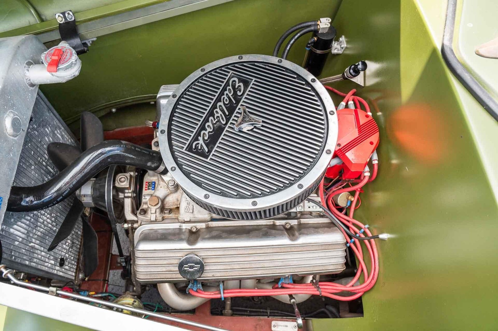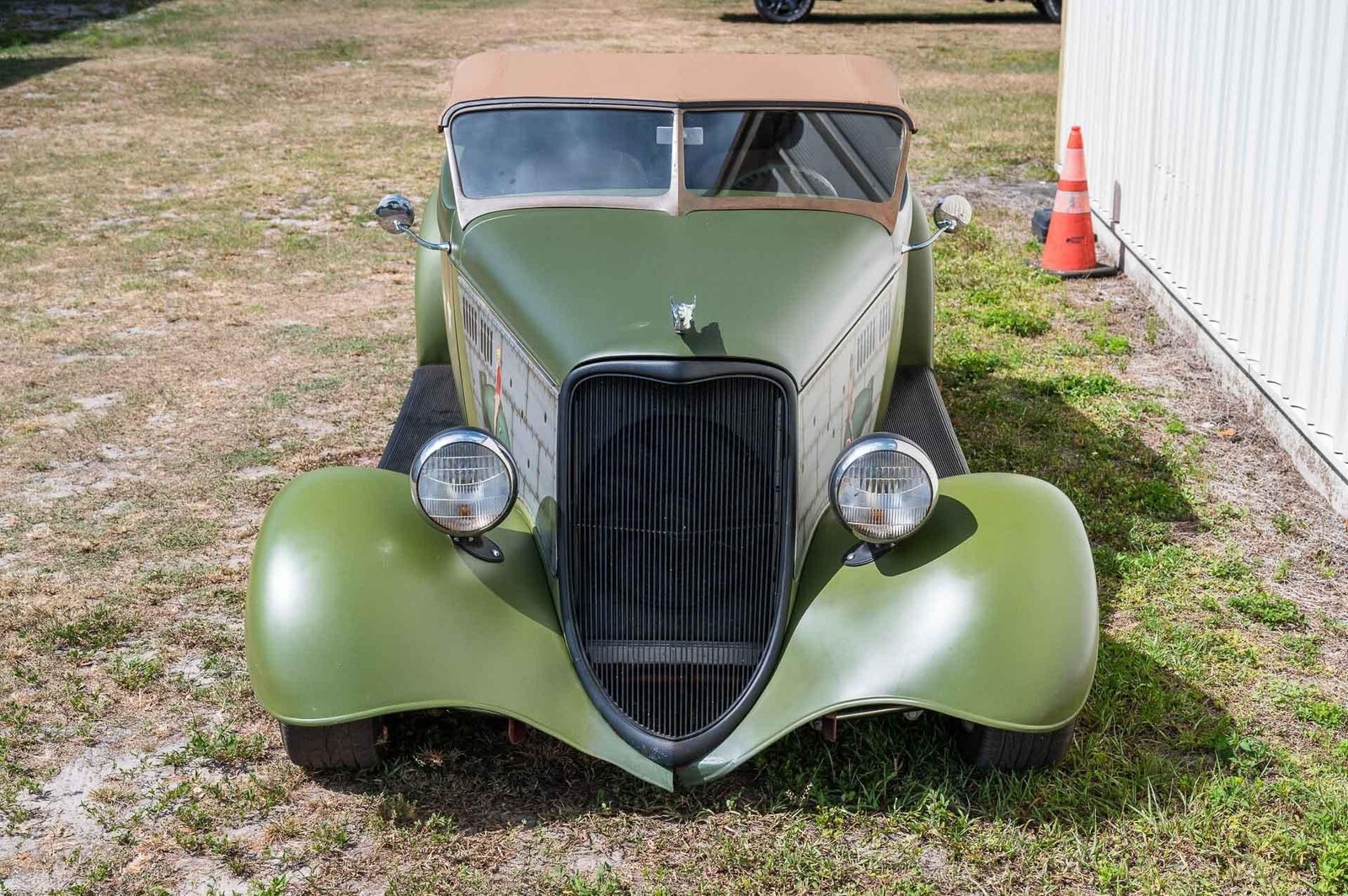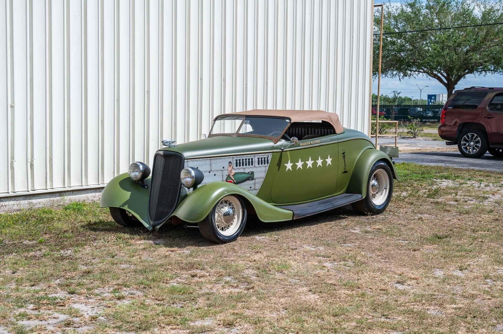 1933 Ford Roadster, WWII Tribute, Downs Body Chassis, Steel Fenders Hood, 383ci SBC, Automatic Transmission, Currie 9 Posi This '33 Ford is a purpose-built, period-inspired WWII tribute that blends traditional hot-rod DNA with thoughtful, name-brand components. The look is authentic and intentional: hand-painted graphics, DuVall-style brass windshield, Dan Fink grille, recently upgraded to leather bucket seats, and a proper big-n-little wire-wheel stance. Underneath the skin, it's a serious driver with a Downs body and chassis, a stout small-block, and a Turbo 350 Transmission. Highlights Downs fiberglass roadster tub on Downs chassis; steel front fenders and hood 383ci Small-Block Chevy V8, Griffin aluminum radiator for reliable cooling Turbo 350 Automatic Transmission Currie 9 smoothed rear housing with 3.55 Posi for balanced street performance DuVall-style brass windshield; Dan Fink grille Wheel Vintiques wire