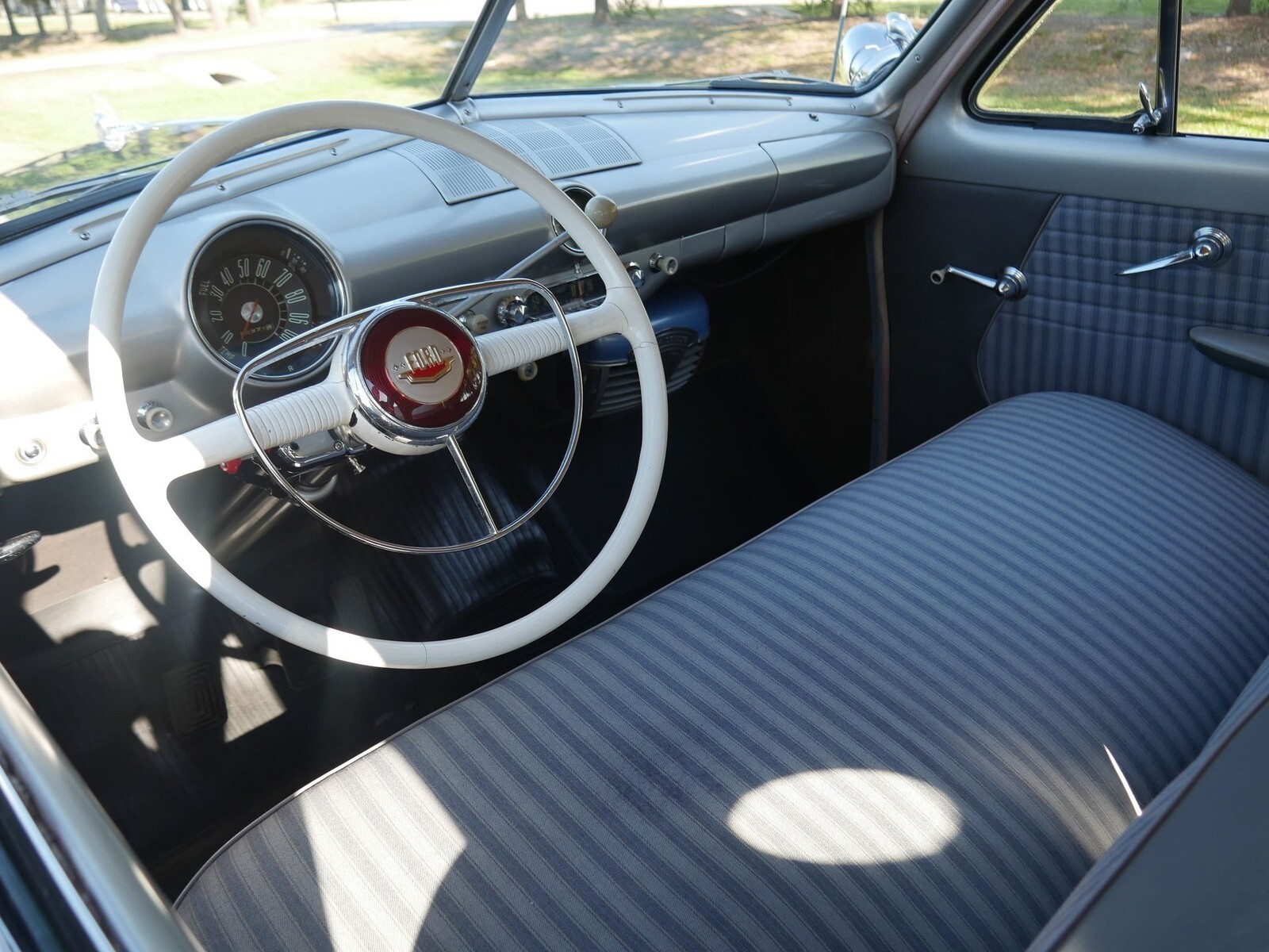 The Dark Blue paint is stunning with new wide white wall radial tires and red steel wheels with beauty rings and center caps. Lake pipes and fender skirts give it that 50s custom look that is so desirable!