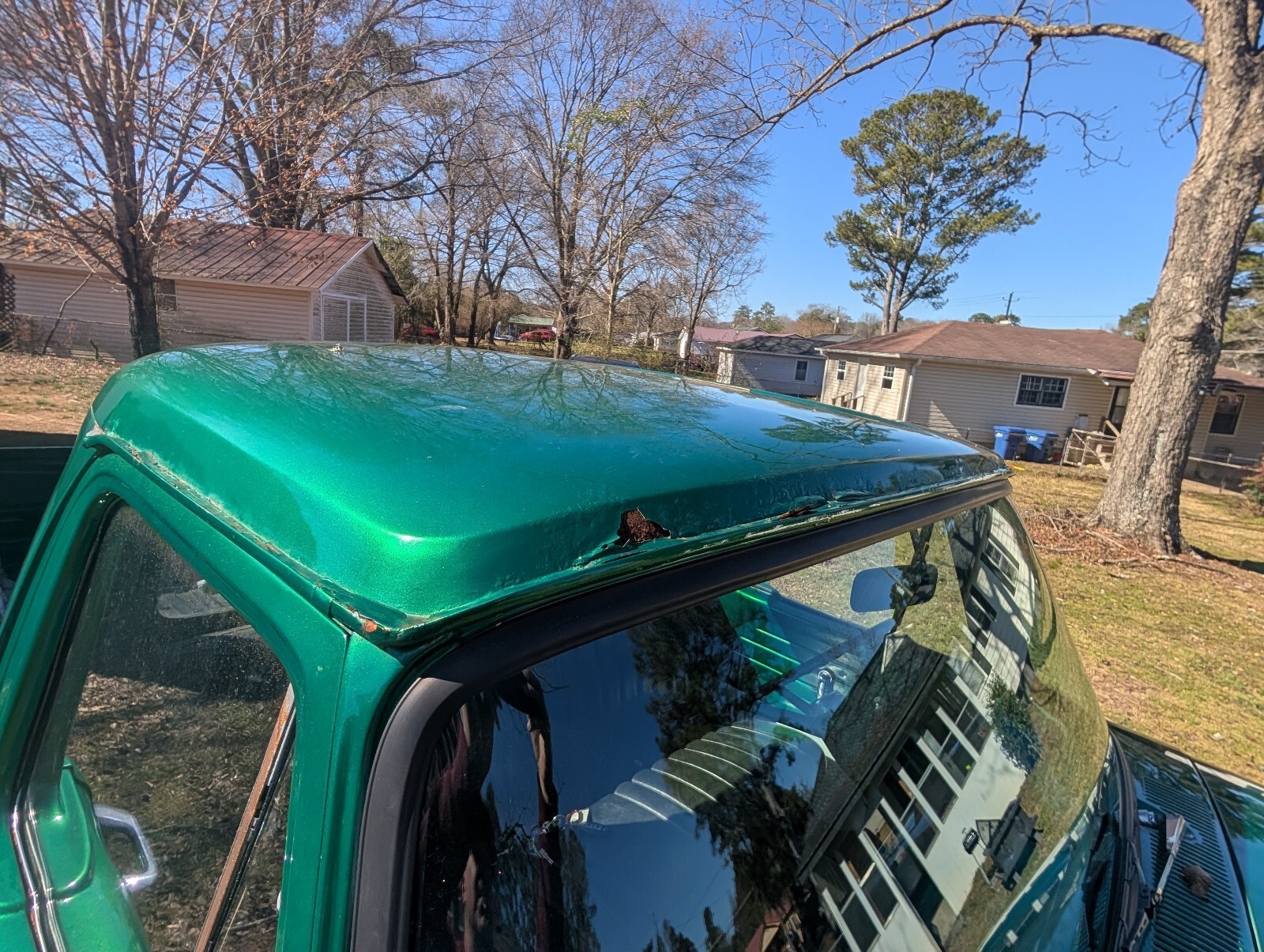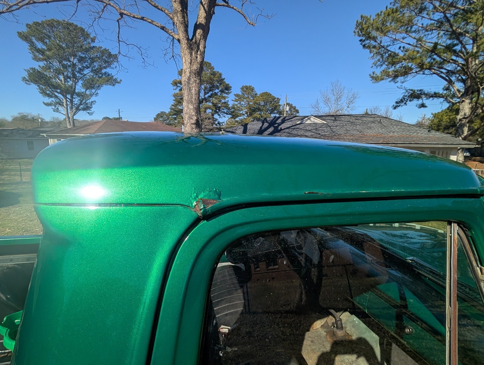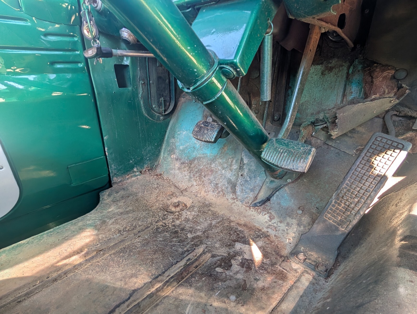 The Good: The green metallic paint shines up great from a distance and turns heads everywhere it goes. The glass is intact, the classic Ford grille is in great shape, and the black vinyl bench seat is comfortable and highly usable.