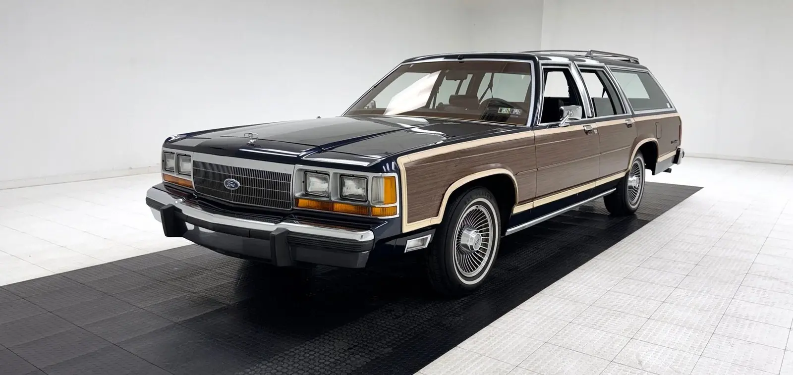 For consignment, a 1990 Ford LTD Country Squire LX station wagon showing 14,564 miles, but the true miles are unknown. This is a consignor stated one owner car and one of just over 6,000 that were built in 1990. Our example benefits from newer exhaust, A/C, and tires with an early 2024 date code.