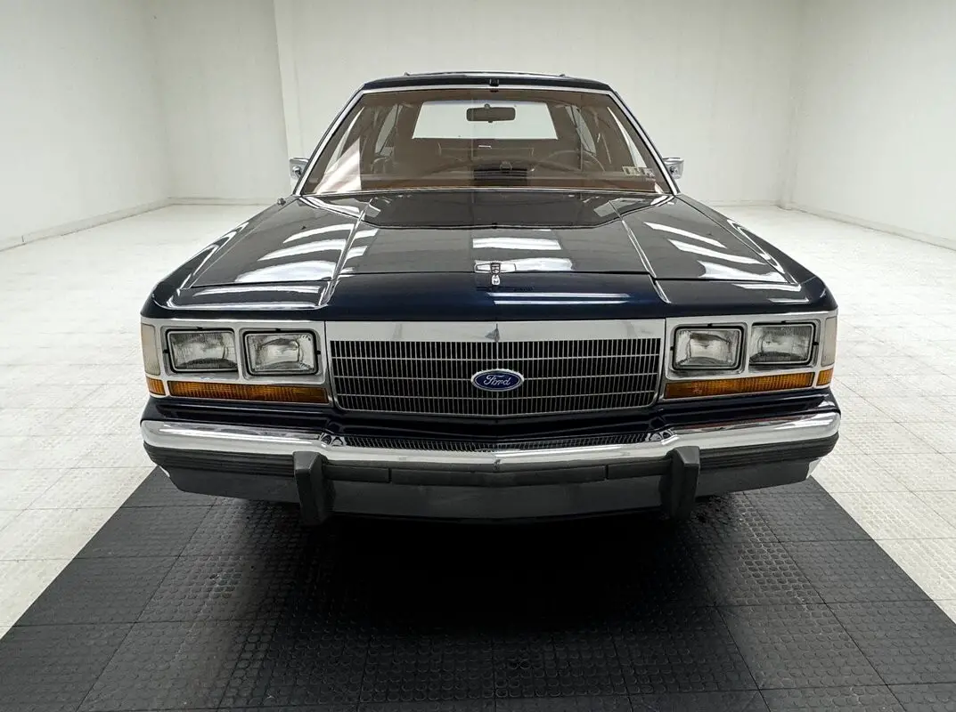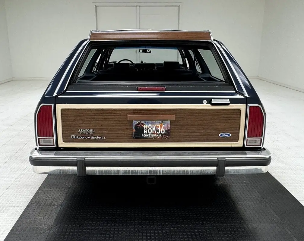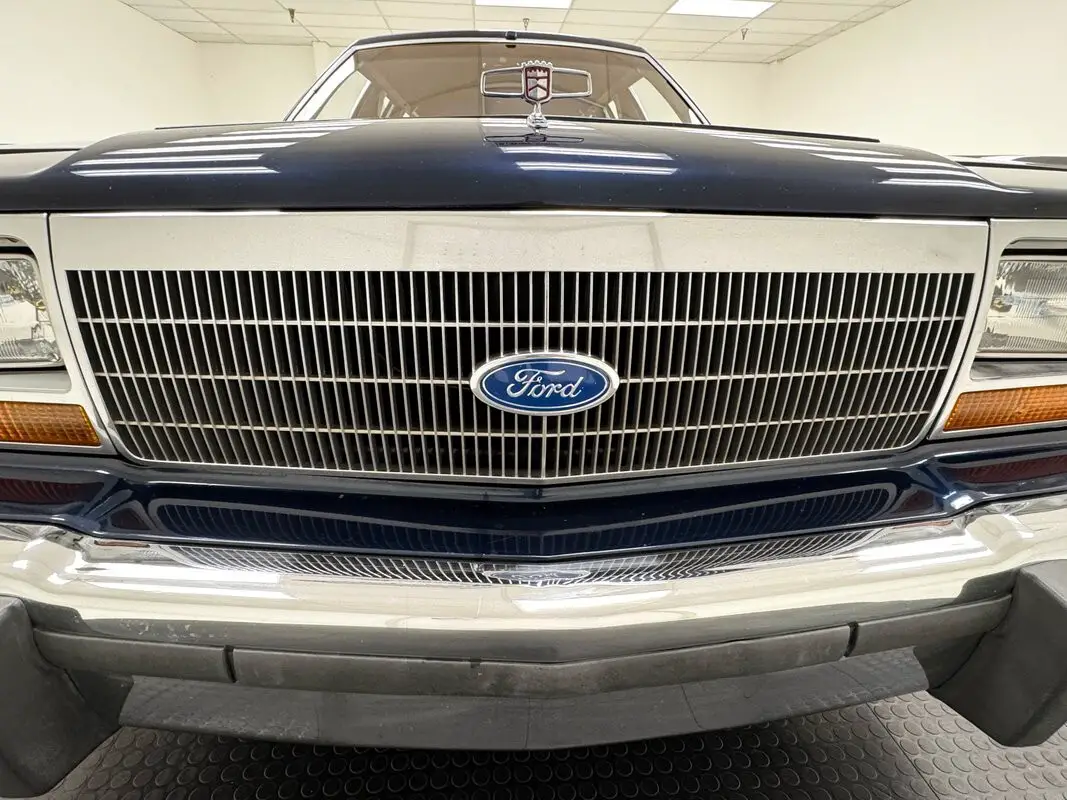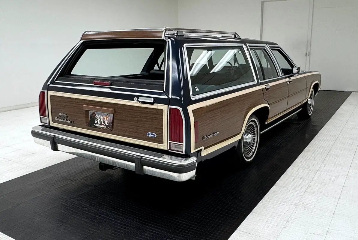 The dark blue of the exterior is matched with the dark blue interior beginning on the door panels of vinyl, plastic, brushed aluminum switchgear plates, and carpeted lowers. It's hard to imagine a family wagon without some simulated wood trim and it's here on each door contouring around door open handles. Blue leather bucket seats occupy the front with some patina creasing and wear on the driver's seat, evident use on the others, and some displaced leather on the passenger front seat. There is a third row of seating in the back, and when folded down creates a substantial open and flat space covered in nice blue carpet. Up front, it does not veer from the LTD sedan with a horizontal speedometer to 85 mph, column shifter, A/C panel, and updated AM/FM/CD radio and everything is in very nice condition. The plush blue carpet shows minimal wear, and the long, blue headliner is in great shape.