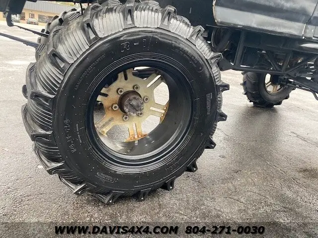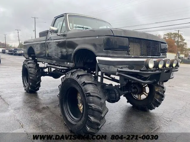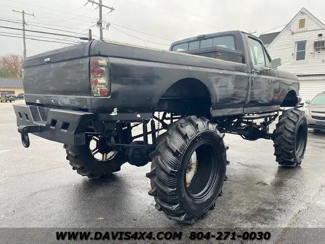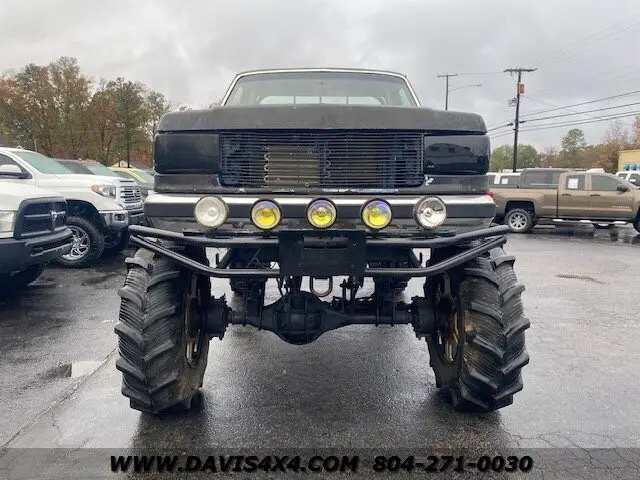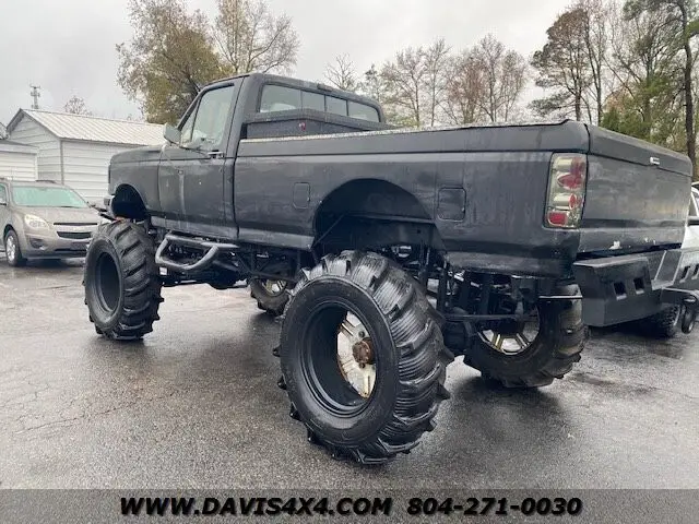 1989 Ford Monster Mud Mega Truck. Chevrolet big block powered, 2.5 ton GM axles, 14.9-24 cut and scoot tractor tires with offset wheels, Hydro steering, aftermarket bumpers, racing seats, BM shifter, roll cage, traction bars front and rear with a frame cradle system that could be used for future, coil over four link etc. This truck is the perfect farm toy or deep swamp playing. Big block Chevrolet was told to be a 454, Demon carburetor, MSD billet distributor, MSD coil, aluminum radiator, dual electric fans, orbital valve, Hydro assist steering, ribbed heavy duty oversized pulleys and belt on alternator, aluminum valve covers, headers, MSD wires etc. Does not make 1000 horsepower but a very dependable play all day type of truck.