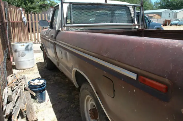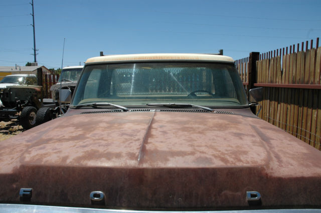 1979 Ford F250 six cylinder with a four speed manual transmission. This truck has power steering and power brakes but no AC. This truck sat for many years. I installed a new carburetor and fuel pump and it runs fine from a can of gasoline. I have not changed the gasoline in the dual tanks.The motor runs smooth and the clutch is smooth as well. The power steering box leaks and will need to be rebuilt. The bed is rusted in the rear as it sat with a pile of dirt in it for many years. No tailgate.The brakes work but fade so the master cylinder may need to be cleaned or changed or the brakes bled.The push bar will not be included in the sale.