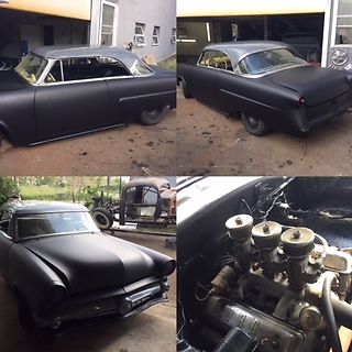 1954 Fors Victoria. Use to be a mild custom running around in 80s. Triple offys, offy intake manifold, 3 speed automatic, I sanded down and hot rod flatz it with semi gloss roof and bumpers, grille bar, lowered, interior has been grounded and painted lightly, I have door panels, all interior trim, seats. But will have to be wrapped in a blanket or interior done over. Body and chassis is very good shape for a car that can be made a driver very easily. It runs off gas line from a gas container. Needs fuel system gone through and cleaned before I would personally trust driving it anywhere.