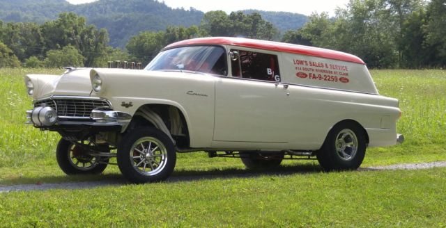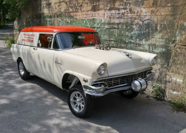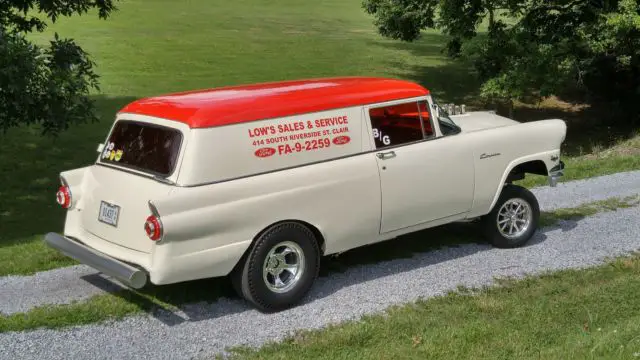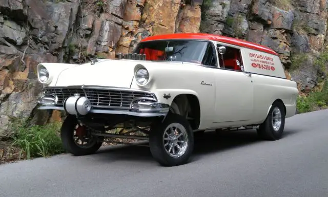 This is a very rare sedan delivery mild built 302 with comp thumper cam, 600 holly carb runs great, the trans is a 5speed manual, rear end is 57 ford wagon with 410 gear ope, vinyl lettering on side can be removed.. This car is finished in Wimbledon white, with red top, all the interior has been redone...This car is driven on the street, and can get in and drive it anywhere, and you wont see any more like it at any shows or cruise nights, Speedway front axle with disc brake, i have a set of electric wipers.. Got this car from an older guy that had the car for 46 years! This is a one off wagon, that stops everyone in their tracks! Call or text me @ 785-259-1034 for more pictures or information.. You are welcome to come view the car before bidding.. The car is sold as is no warrenty! I do reserve the right to end the auction early.