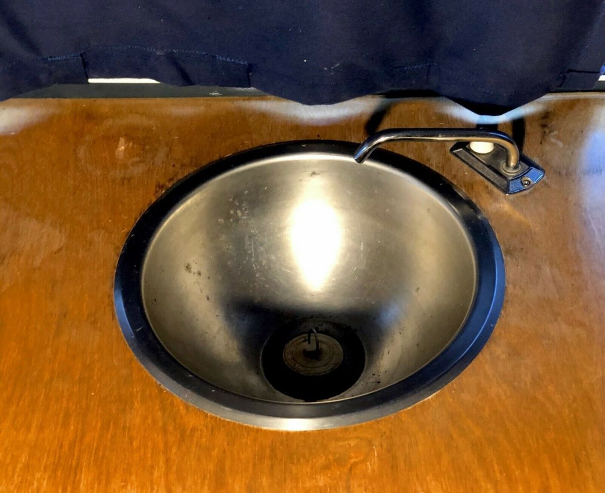There is a pump-powered sink running off the battery and a 20 gallon freshwater tank on board.