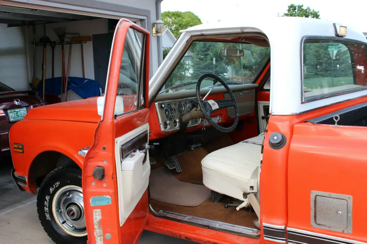 Good running, well maintained, attractive pickup. It is orange and white with no body damage, other than a few nicks and scrapes. Has a second gas tank, extra-sturdy rear bumper and hitch and has had some restoration done (interior, brakes, radiator, several new pieces of chrome trim, new battery, etc.) Krause Publications Collector Car Price Guide (2017) lists this truck, in "A" condition, at $20,000, and, in "B" condition, $14,000. I place it in the "B" category. One rocker panel has rusted and the imitation wood trim inside the outside moldings needs to be replaced. Some of the wood bed boards have rotted and a full plastic bed liner has been added. Truck runs well and is used regularly. It has a 350 c.i.d. engine and automatic transmission. AM/FM radio was added but original radio is available, along with a number of other parts.