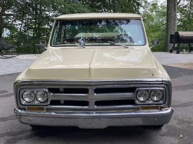 GMC 1500 Long bed Step Side Pickup truck. The truck was repainted several years ago and the paint is showing it's age. Originally a blue and white stripe 350 truck, its now a Cream Color. The engine and transmission were replaced with a small block 400 and TH350 3 speed automatic by the previous owner. Classic Autosound head unit with upgraded kick panel speakers. Heater core replaced and entire heating unit refurbished. Body mounts were replaced with energy suspension. The entire suspension was replaced with a QA1 Front and Rear Single Adjustable Coilovers. Upper and lower control arms and upgraded truck arms. New Borgeson steering box and lines, really cleans up the play in the steering along with a new steering column and wheel. This is a nice driver with a patina type paint job, the paint does chip on hood front, there is bubbling in some spots. The bed is Cedar wood and looks great. Tail lights are from a 65 Impala and fit the fender very well. Upgraded headlights from LMC Truck, much brighter but keeps the original look. This truck is almost perfect mechanically. Wheels are Riddler 20" with a machined lip. Front 245/35ZR20 in the Rear 295/35ZR20 with Nitto NT555.