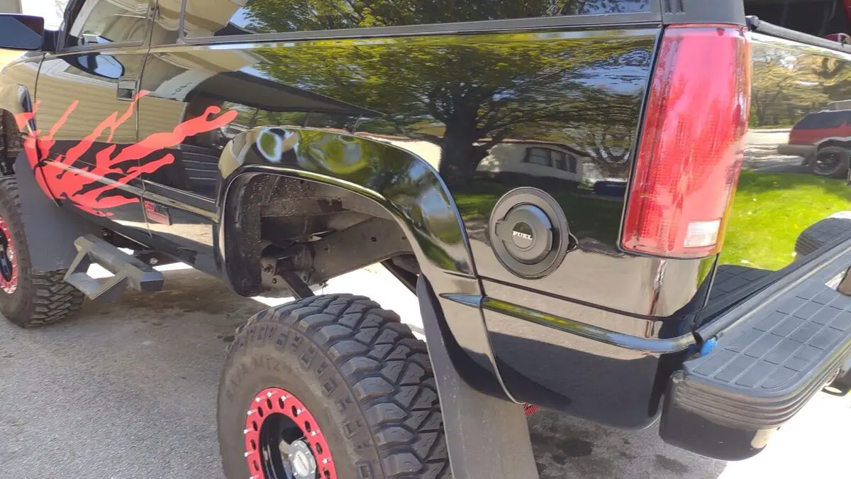 This 1994 GMC Yukon has a 2003 Denali front end, six way fog/ driving lights, limited slip 44 front and corporate 14 at rear, 373 gears. fresh rebuilt 4l60 trans with paperwork. 5.7 stock engine, one ton axles, Mickey Tompson tires on pro comp 16 inch wheels. Interior is in good condition for the year Very clean condition with no rust issues and undercoated. 12 inch lift, small dents on left front fender, hood and tailgate, shows good all around.