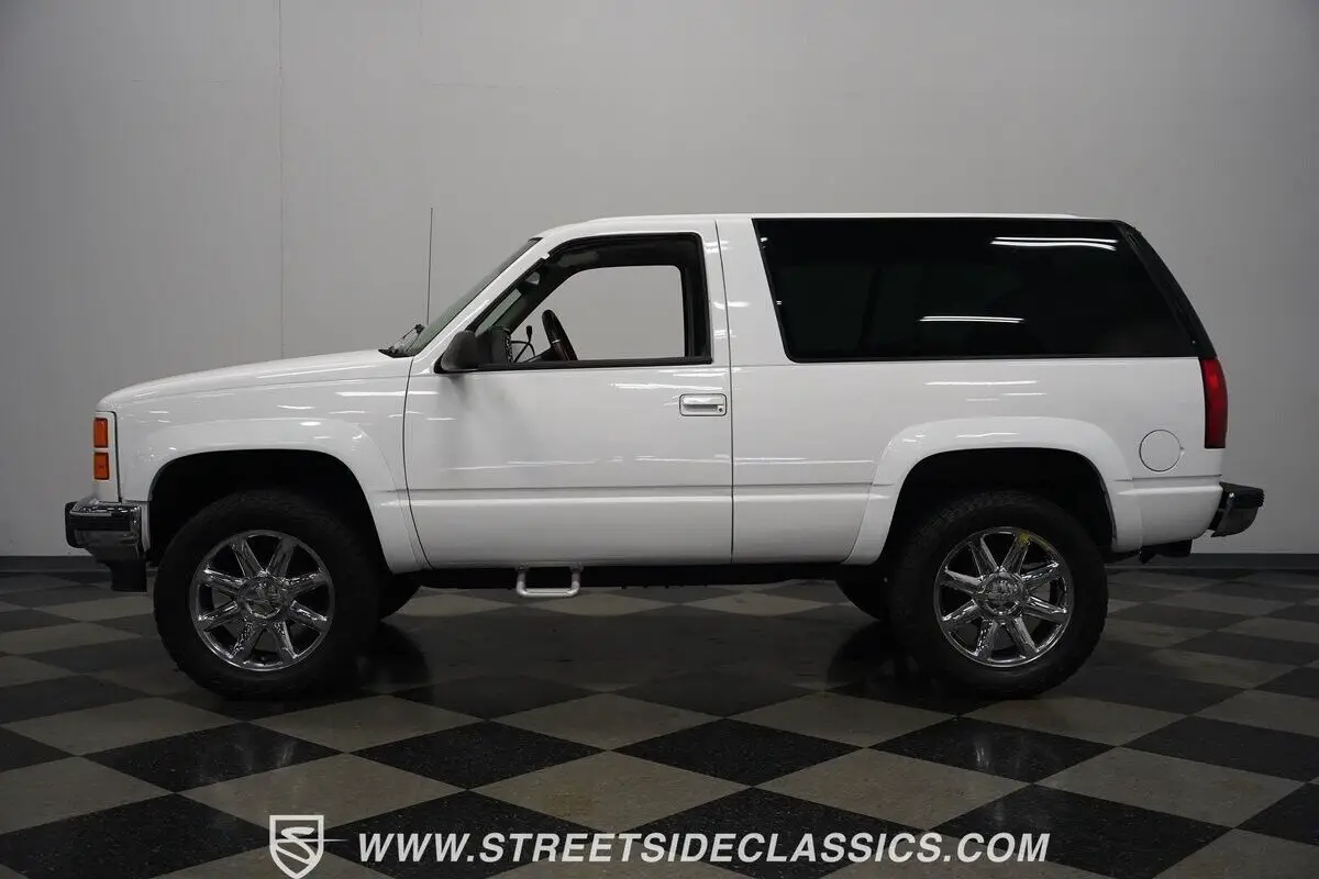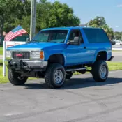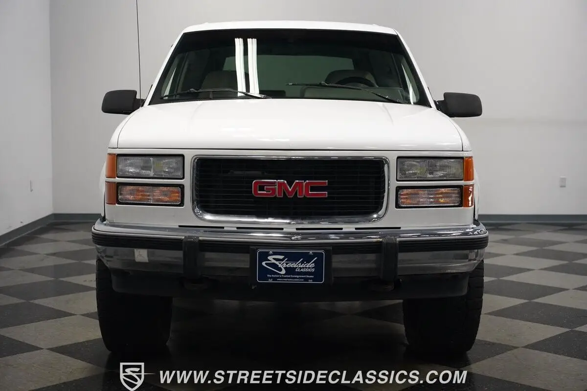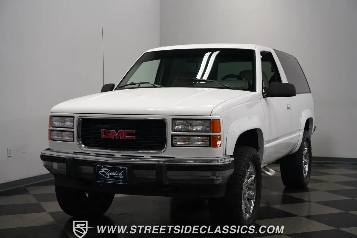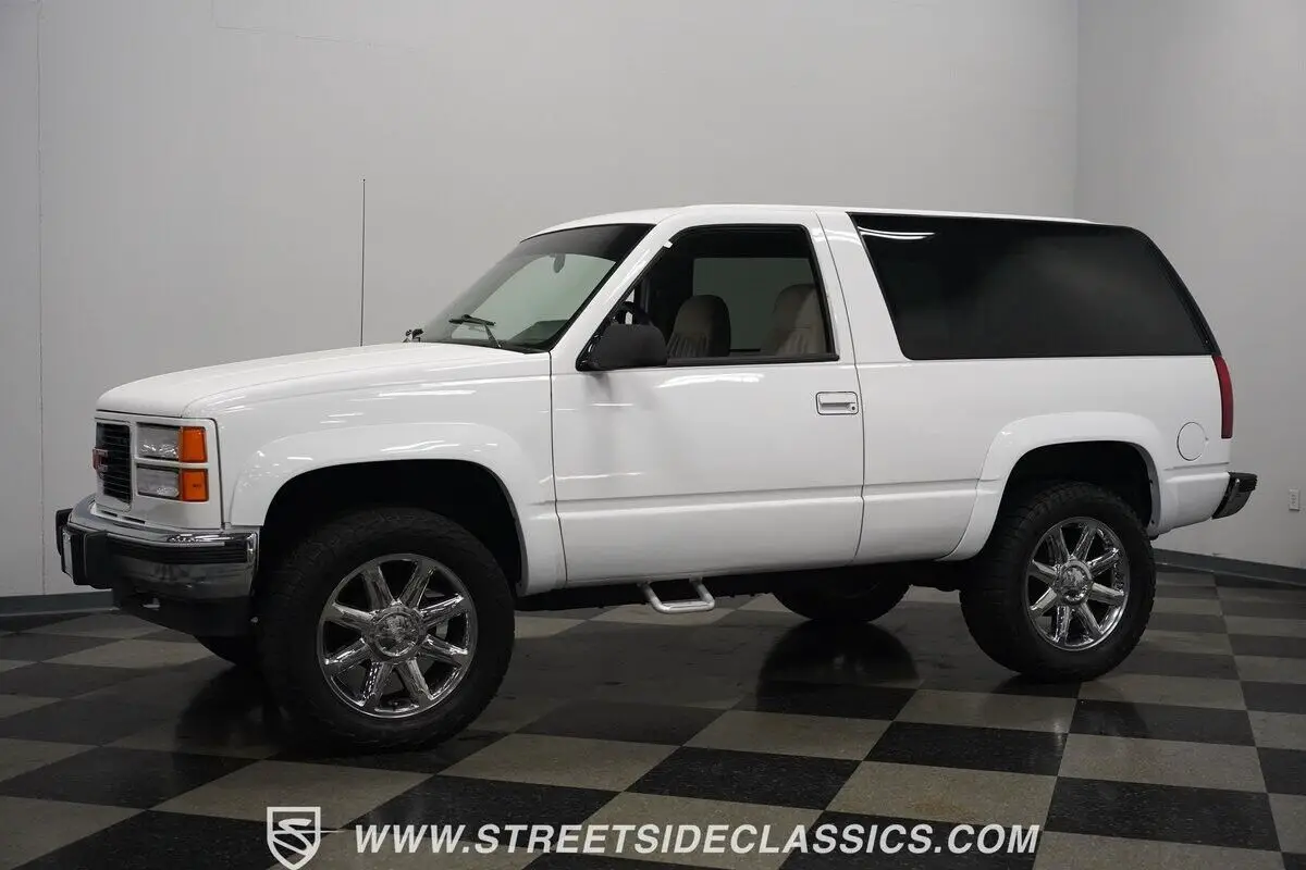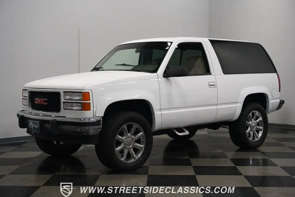 HIGHLIGHTS: • 5.7 Liter V8 Engine • 4 Speed Automatic Transmission (4L60E) • Electronic Fuel Injection • 3.73 Positraction Rear End • 4X4 Drivetrain • Rough Country Lift Kit • Upgraded Upper A-Arms • Power Disc Brakes • Dual Exhaust • Olympic White Paint • 20" GMC Chrome Wheels in LT305/55R20 Tires • Chrome Bumpers and Steps • Painted Headlight Bezels • Newer Headlights • Tinted Windows • 2-Door Body Style • Light Gray Cloth Interior with Bucket Seats • Power Seats • Power Mirrors • Aftermarket Stereo (AUX, USB, SD Card) • Power Steering • Column Shifter • Owner's Manual