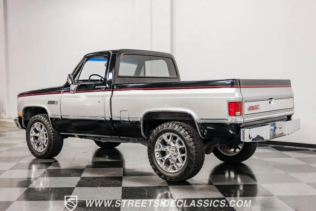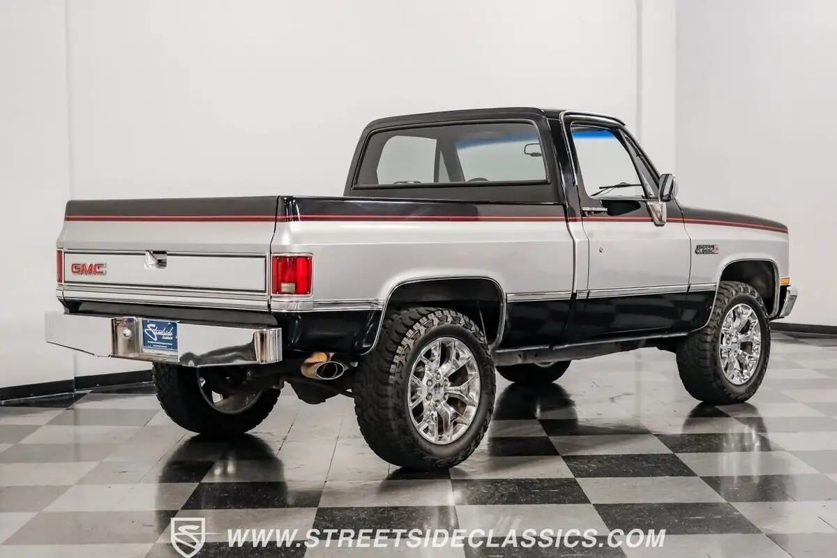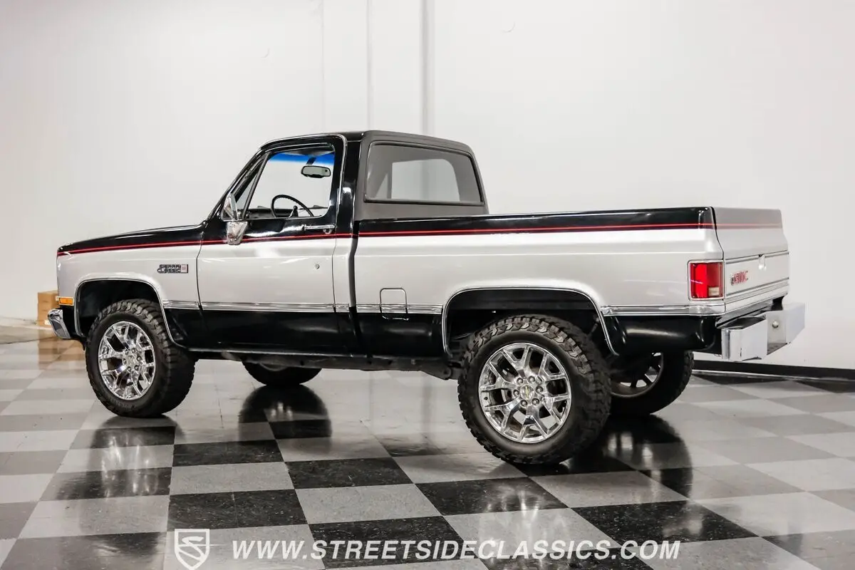 Modernized and modified for the ultimate performance upgrade, this 1982 GMC Sierra 1500 Classic Resto-Mod wears a sleek black and silver finish accented by red painted pin stripes. The exterior overhaul features chrome bumpers and GMC tailgate trim that perfectly complement the polished 20" wheels. The muscular stance is amplified by 285/60R20 Venom tires with plenty of tread life and a custom touch places the fuel filler in the back left corner of the bed.