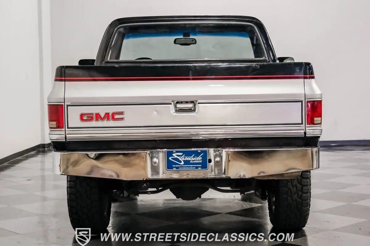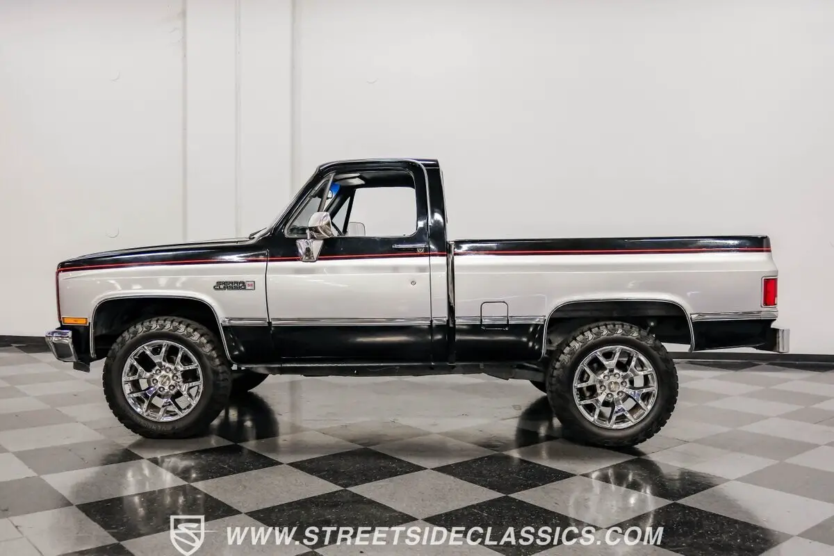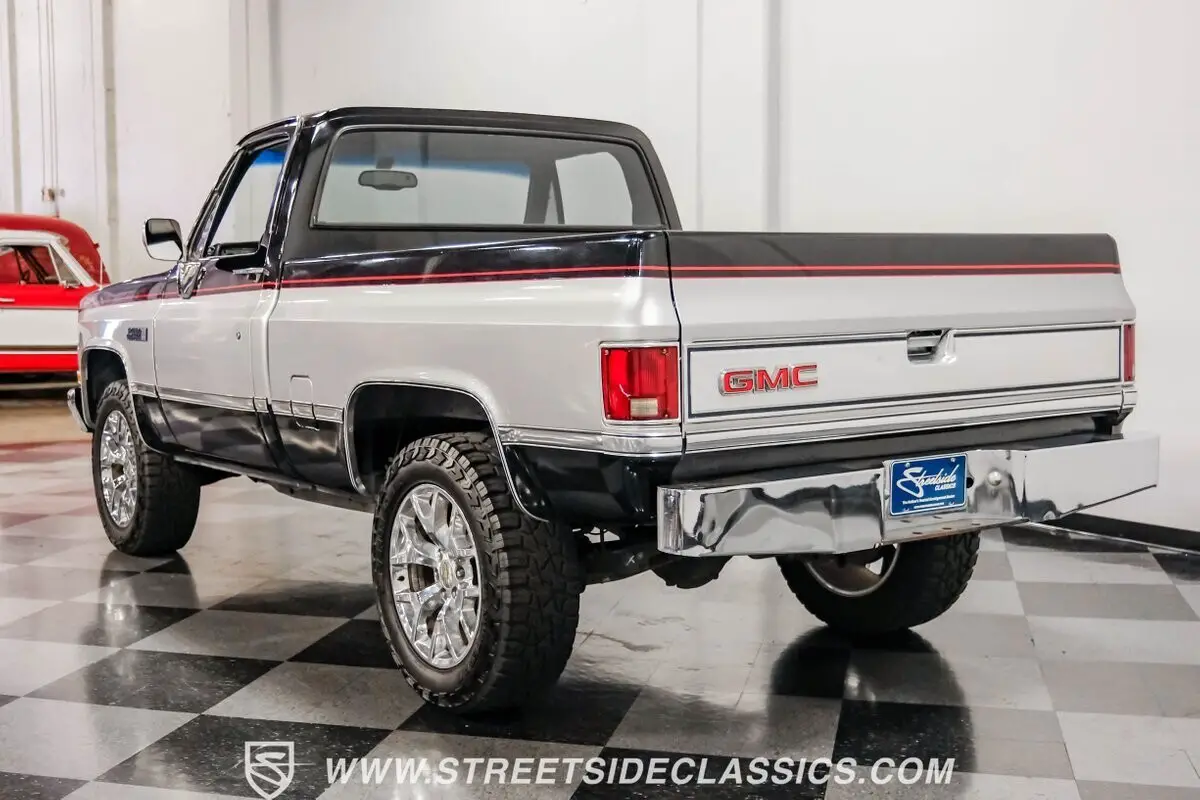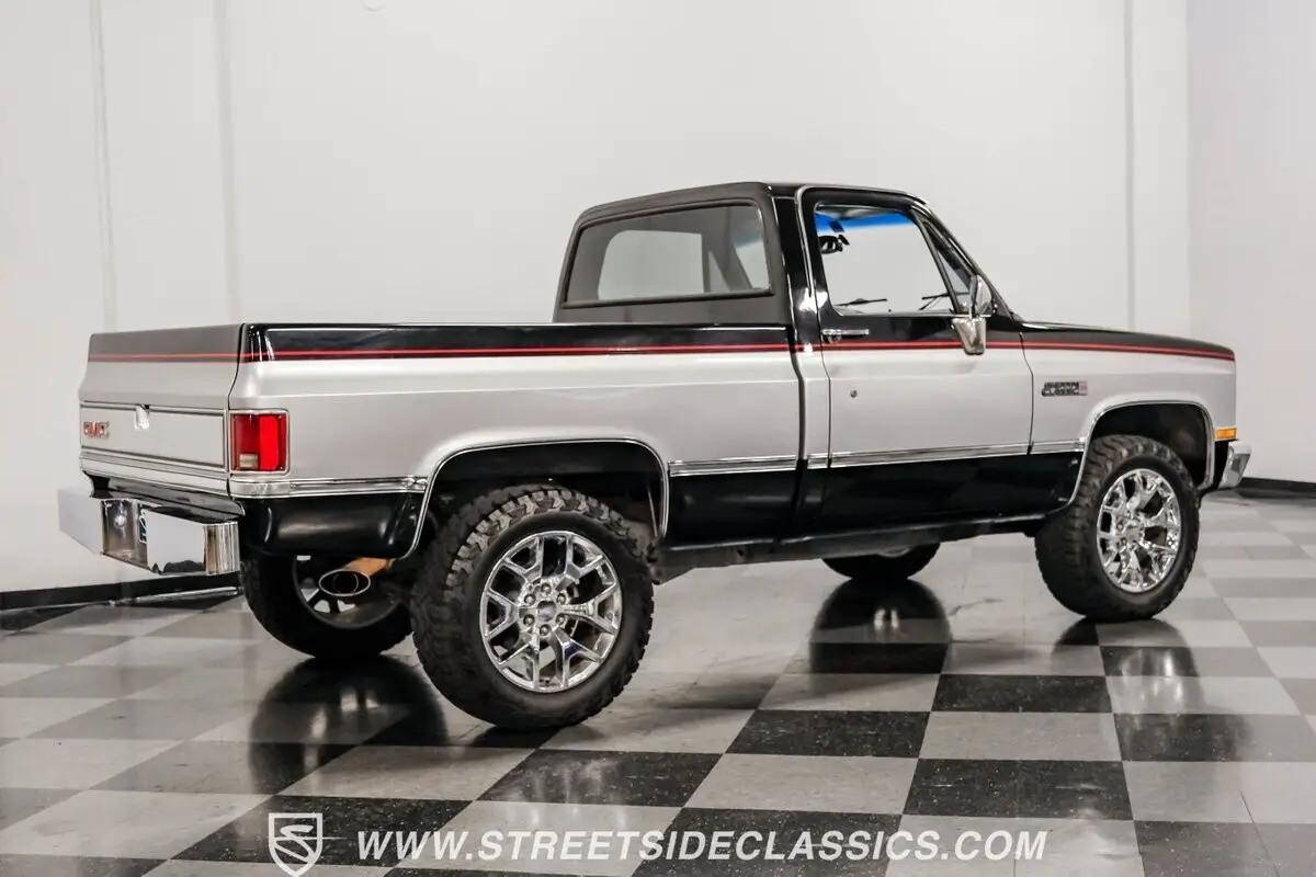 Modernized and modified for the ultimate performance upgrade, this 1982 GMC Sierra 1500 Classic Resto-Mod wears a sleek black and silver finish accented by red painted pin stripes. The exterior overhaul features chrome bumpers and GMC tailgate trim that perfectly complement the polished 20" wheels. The muscular stance is amplified by 285/60R20 Venom tires with plenty of tread life and a custom touch places the fuel filler in the back left corner of the bed.