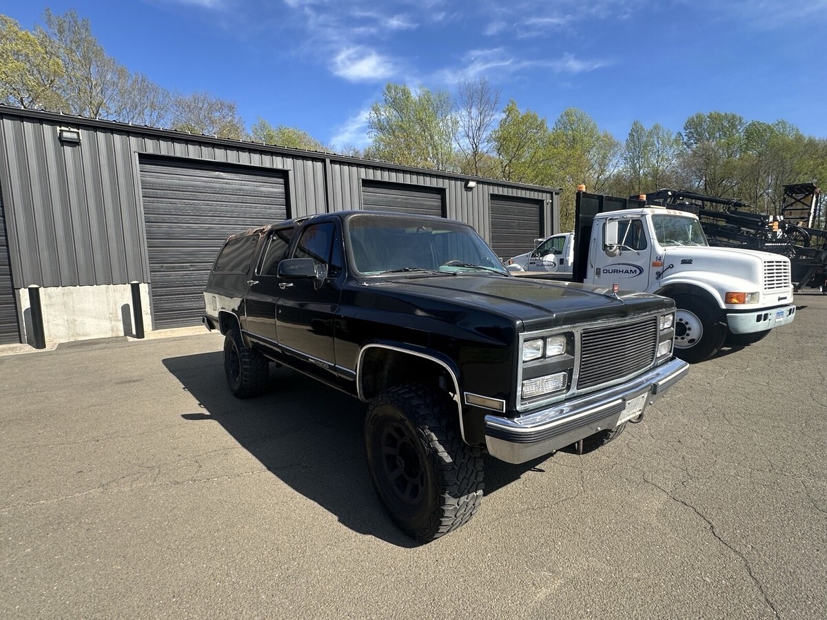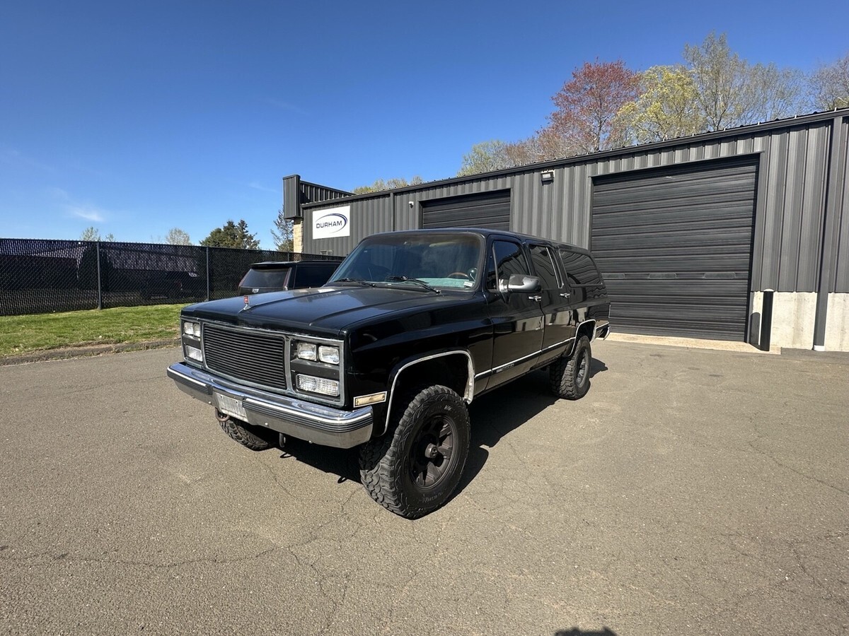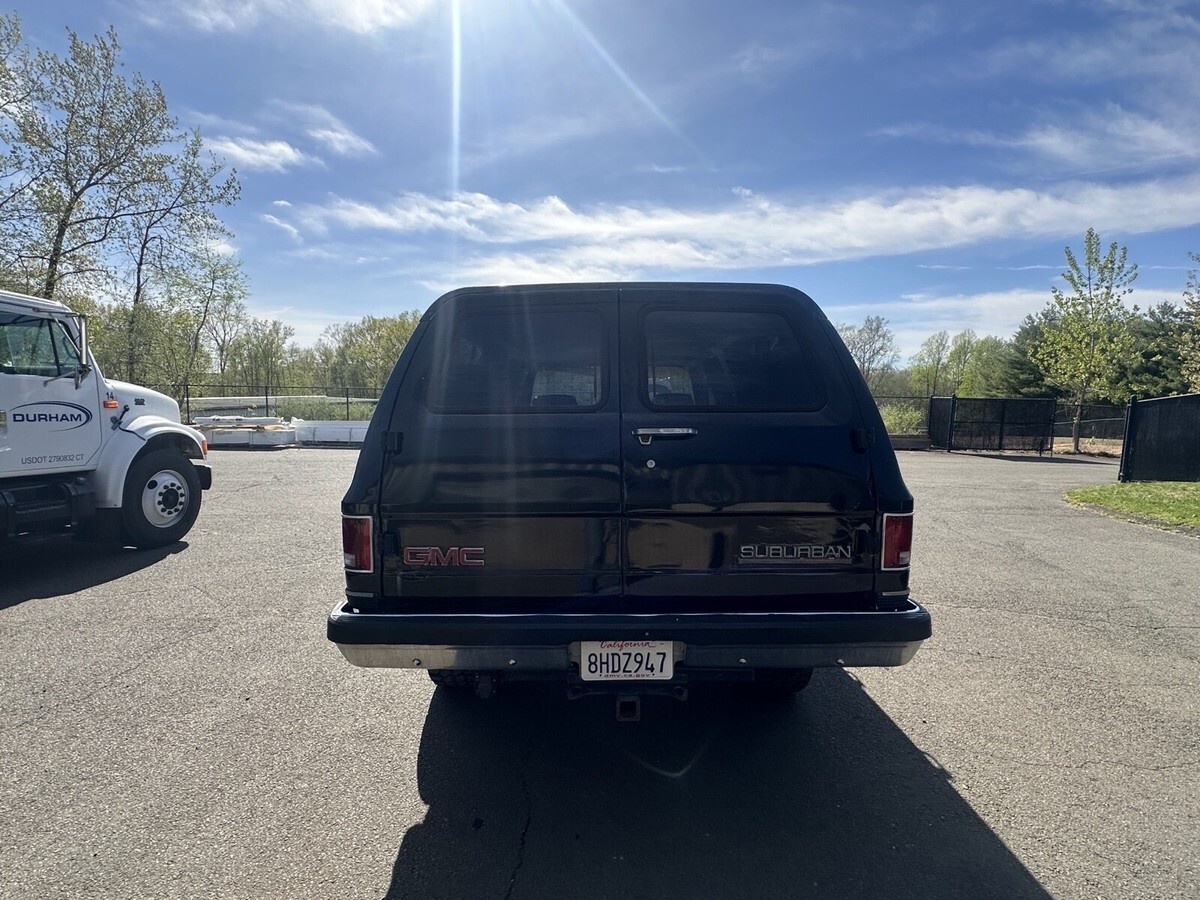 1990 GMC Suburban 2500 Fuel Injected 350 TBI Turbo 400 Transmission NP241 Transfer Case Clean Title California Truck with a Clean Rust Free Undercarriage Rust on Roof that will need Repair Runs and Drives Well 3” Lift Kit 35” Tires on Powdercoated H2 Hummer Wheels