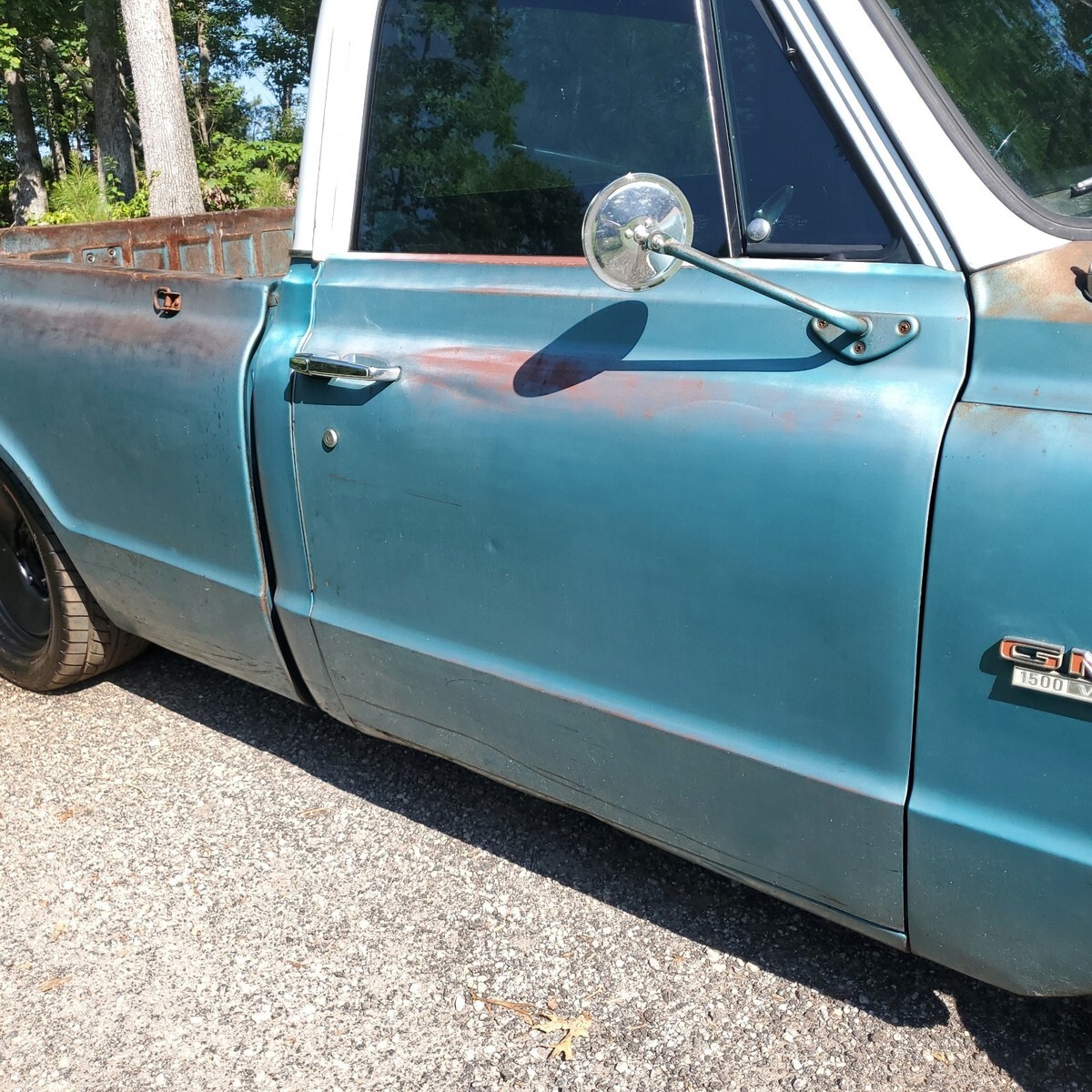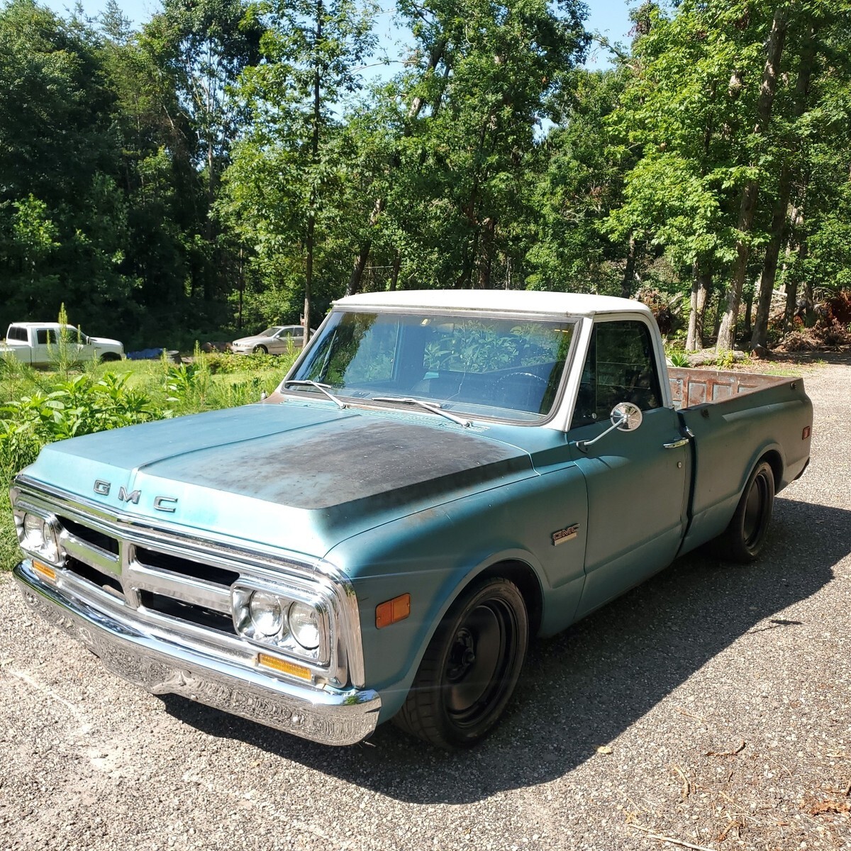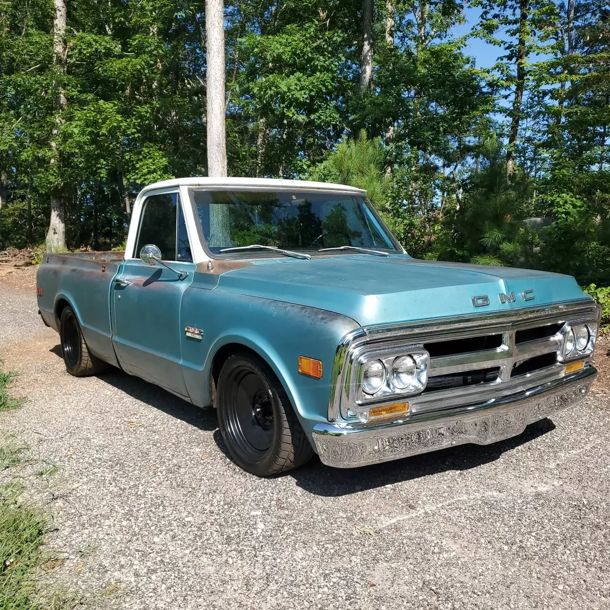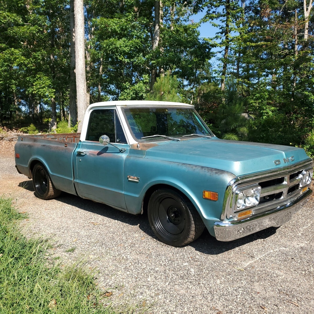 GMC factory shorted with ORIGINAL paint. Awesome patina, drop spindles, flip kit, C notched in rear, front disc with power brake booster and master cylinder, built 327 not original, factory 4 speed, all paperwork on truck, bought new in Quincy California. New seat and carpet, floors are solid! $23500 For sale by sc dealer with clear sc title 17 in rims and tires, also comes with new 15 in tires and hubcaps Andy 864 901 4339