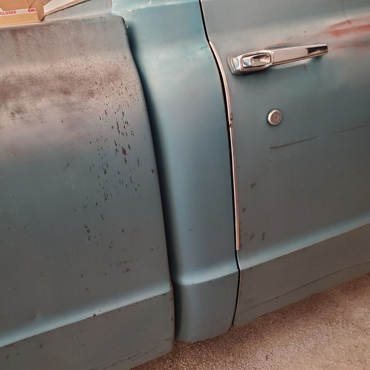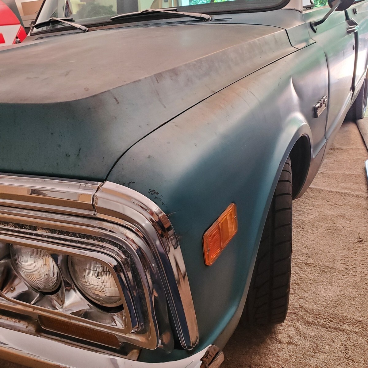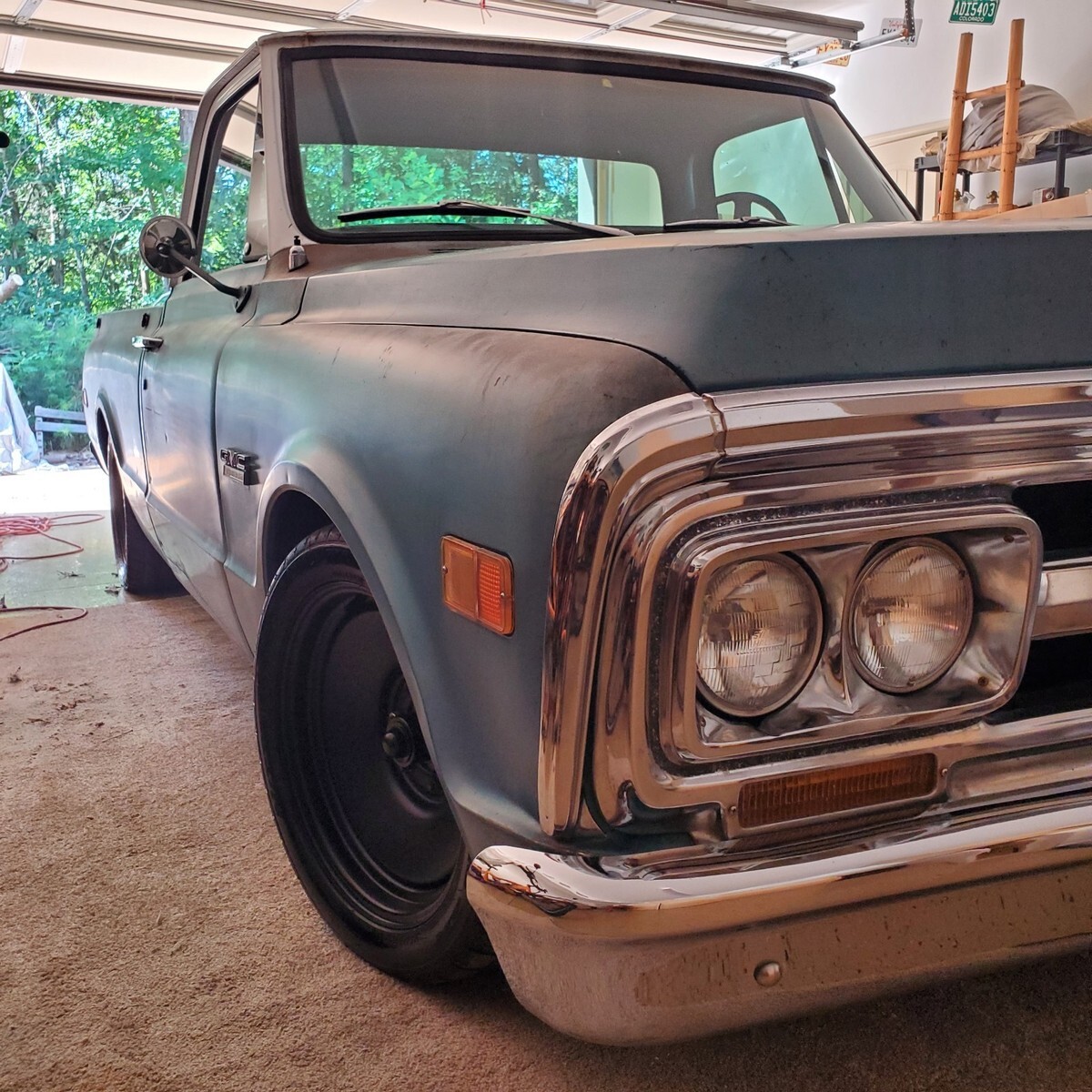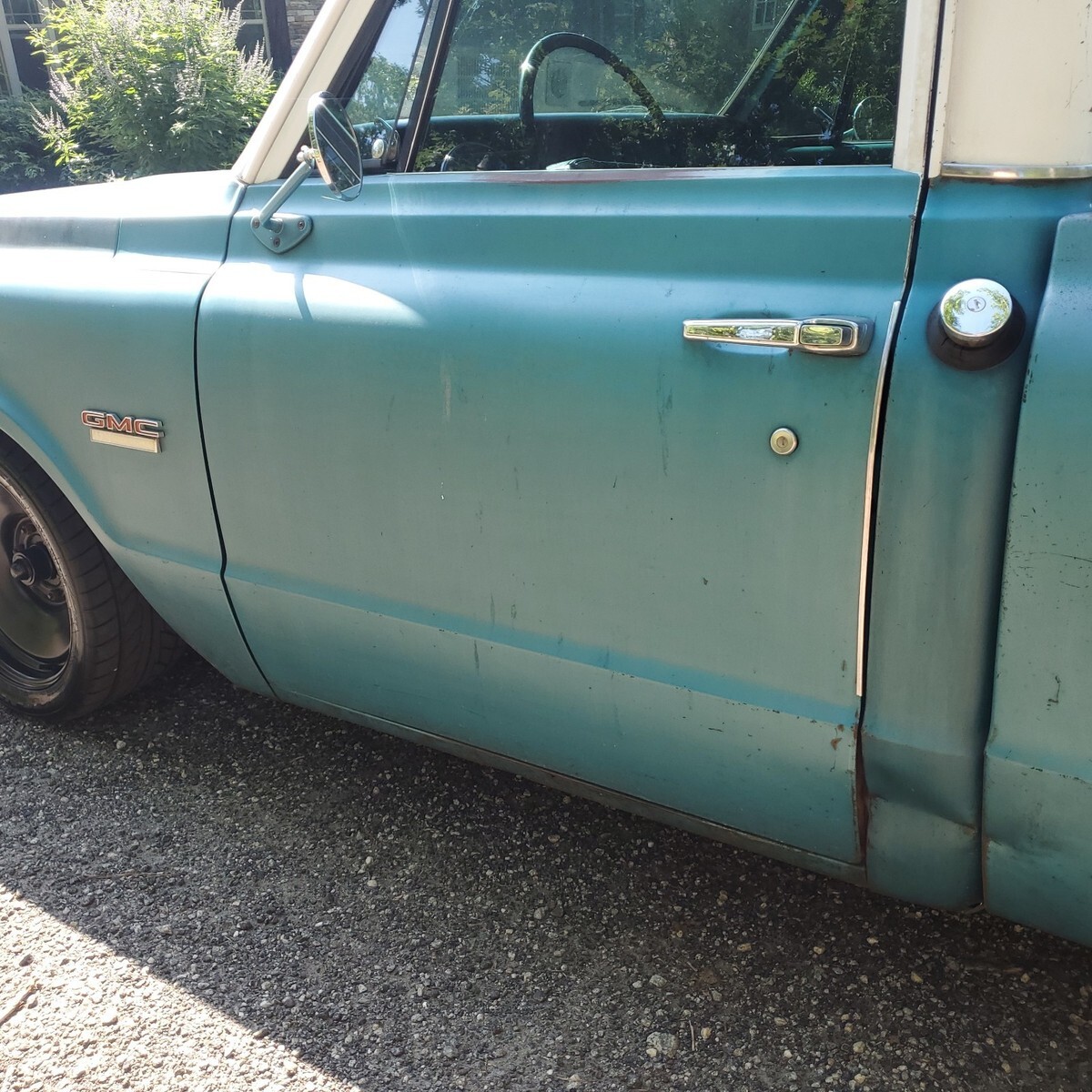 GMC factory shorted with ORIGINAL paint. Awesome patina, drop spindles, flip kit, C notched in rear, front disc with power brake booster and master cylinder, built 327 not original, factory 4 speed, all paperwork on truck, bought new in Quincy California. New seat and carpet, floors are solid! $23500 For sale by sc dealer with clear sc title 17 in rims and tires, also comes with new 15 in tires and hubcaps Andy 864 901 4339