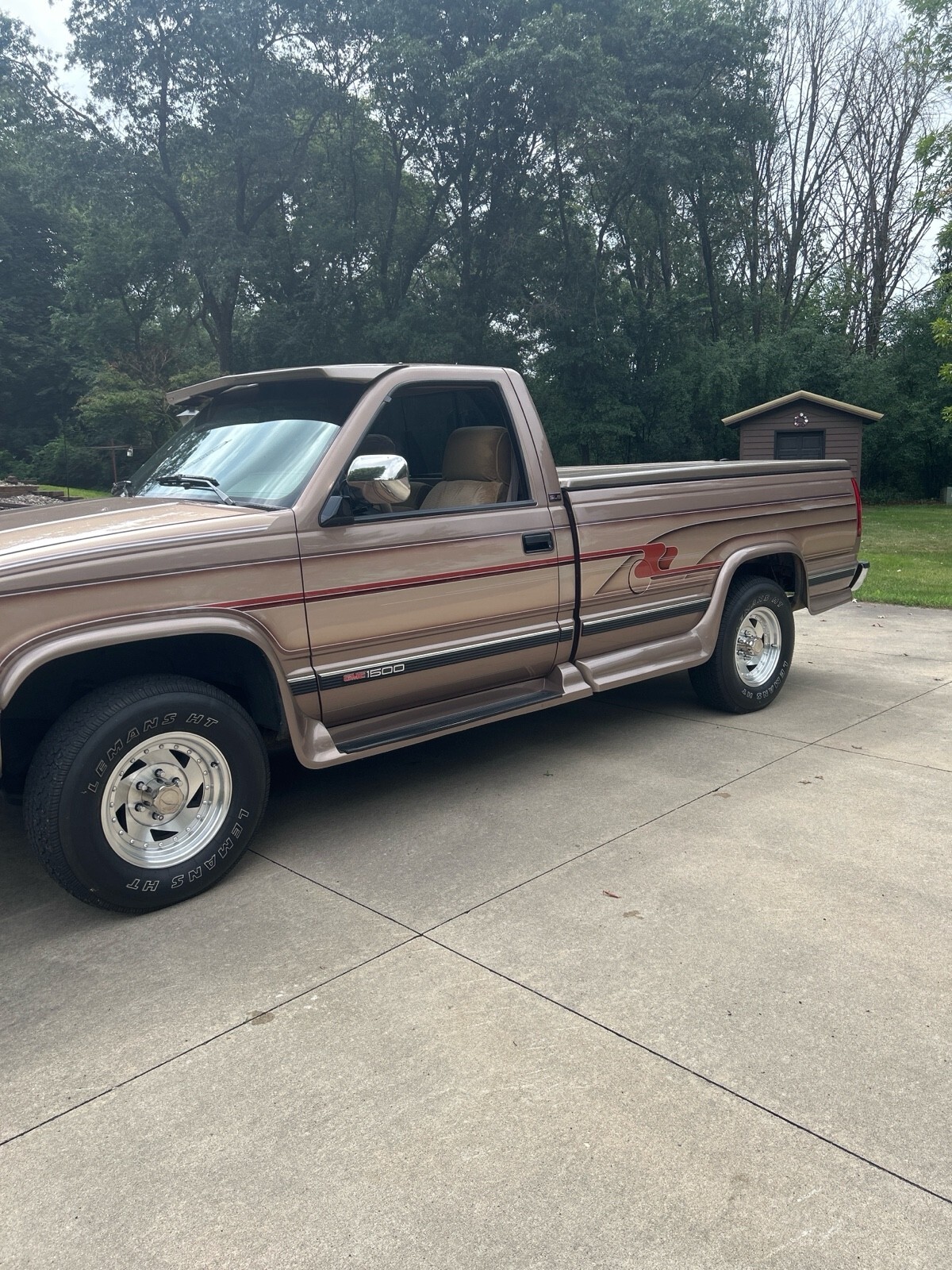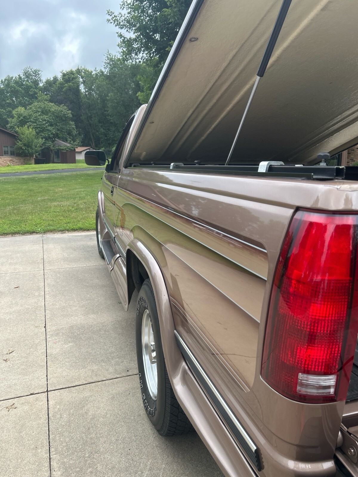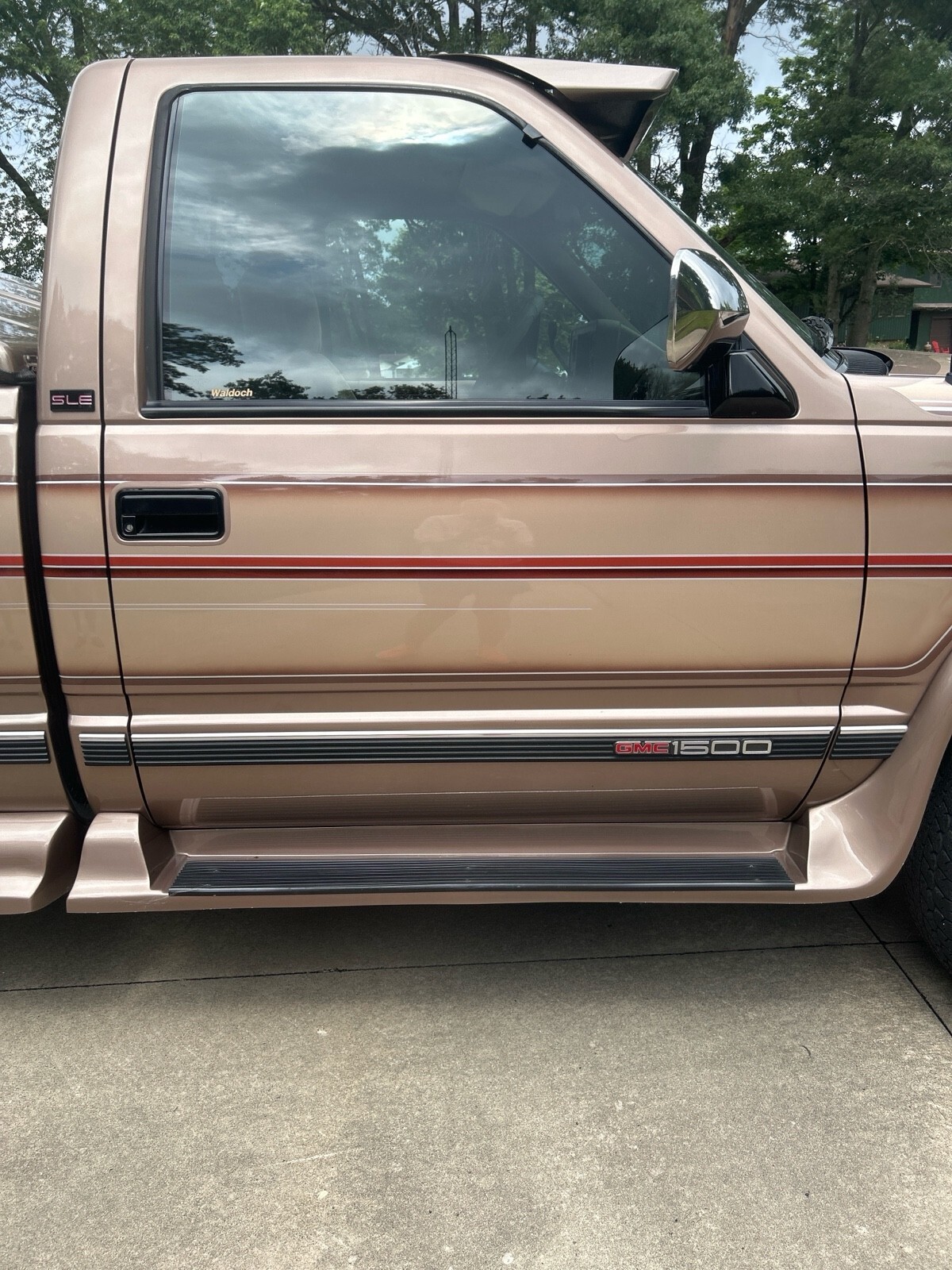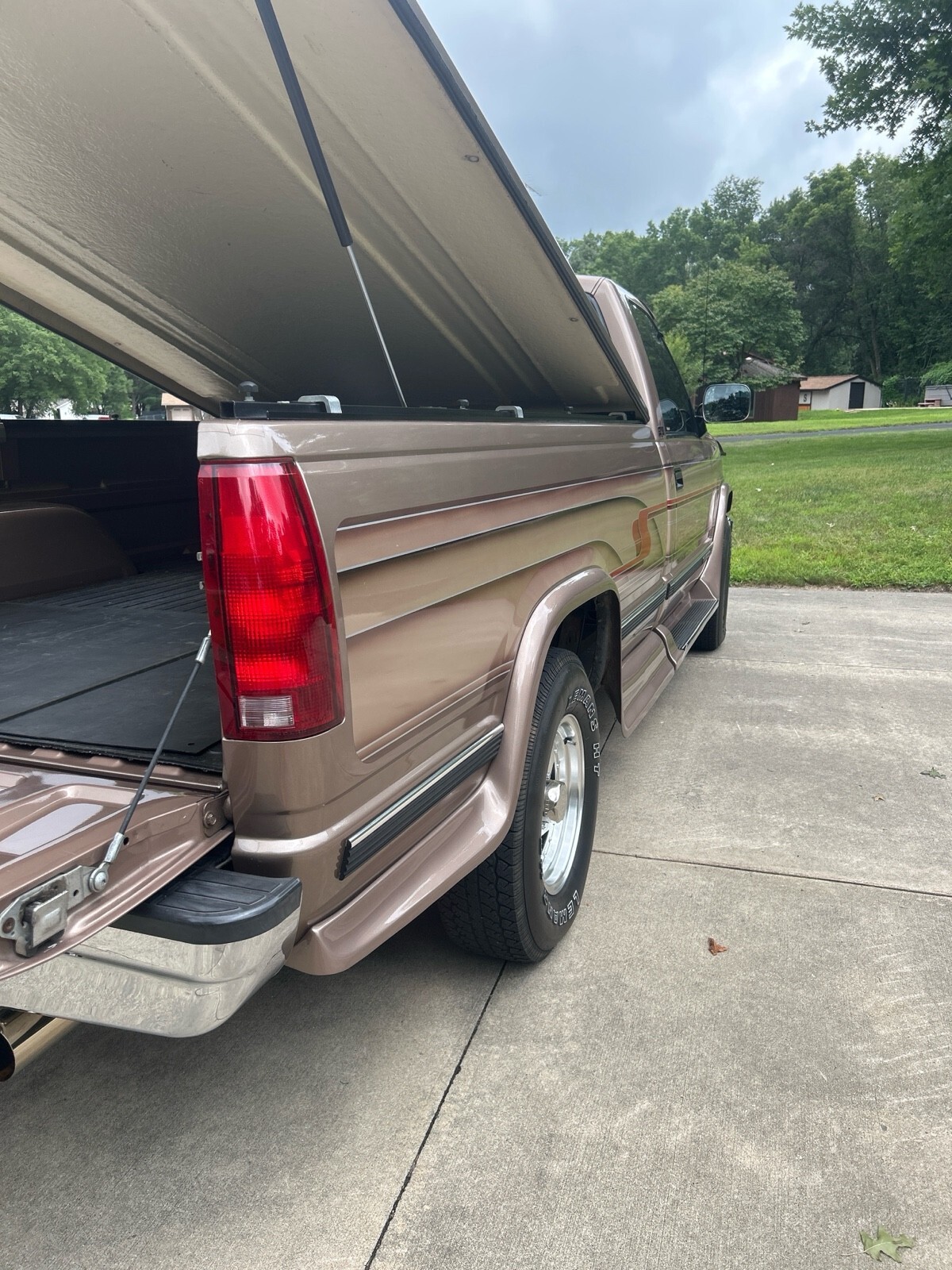 GMC SLE 1994 Sierra 1500 (only 64,114 miles) 4WD V8 350 cubic inch motor. A must see to appreciate. 8 ft box w A.R.E. fiberglass cover. Fantastic condition inside and out - one owner. Built in Running boards, sliding rear window, tires good, flex steel seats, chrome wheels, dual pipes, LUND sun visor, and trailer hitch behind GMC logo on bumper. Has Waldoch conversion kit so the paint job is very unique (no pinstripes) . The color is how it was painted.
