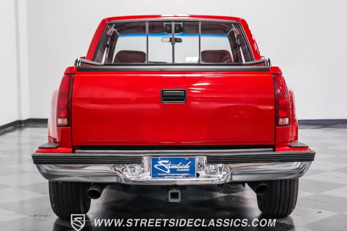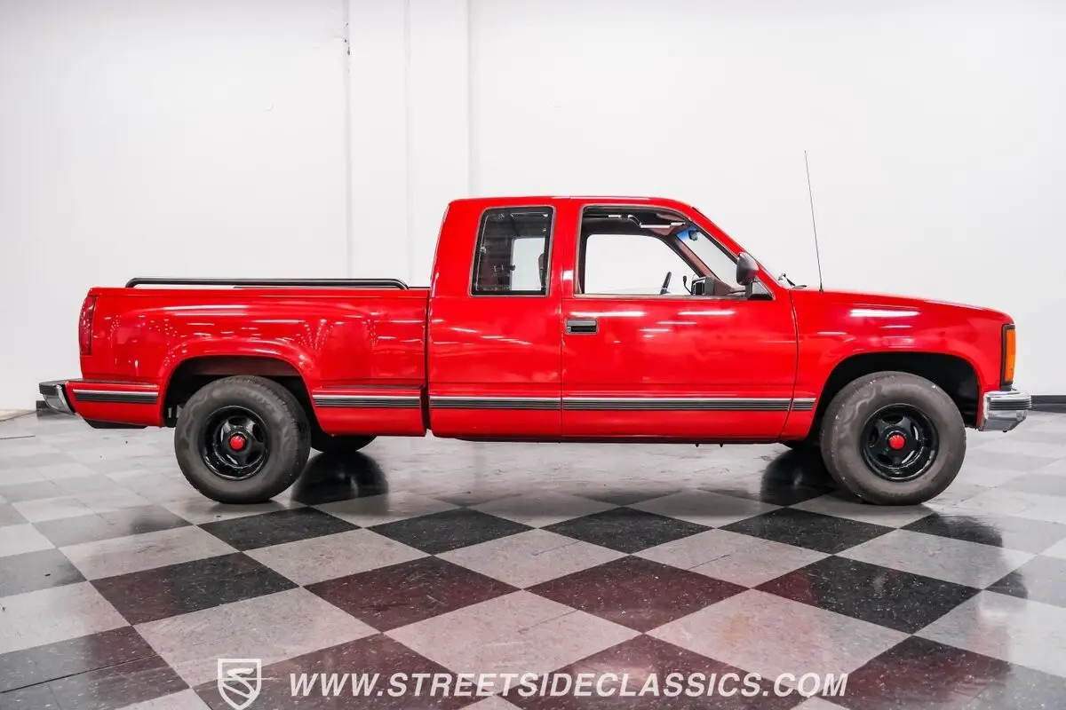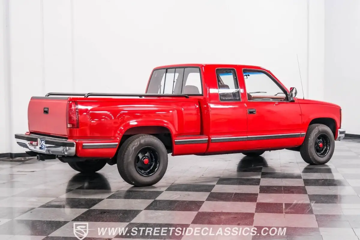 Refreshed in late 2024 this 1991 GMC Sierra 1500 Extended Cab is finished in red and rides on black 15-inch Centerline wheels with red center caps and 255/70R15 Evoluxx Capricorn HP tires. The step-side short bed is matched with a rear chrome bumper and newer tailgate trim. The front grille wears its GMC badge proudly between clear headlights, while the chrome front bumper adds a classic contrast. A spray-in bedliner, sliding rear window, and black mirrors round out the utility-minded exterior.