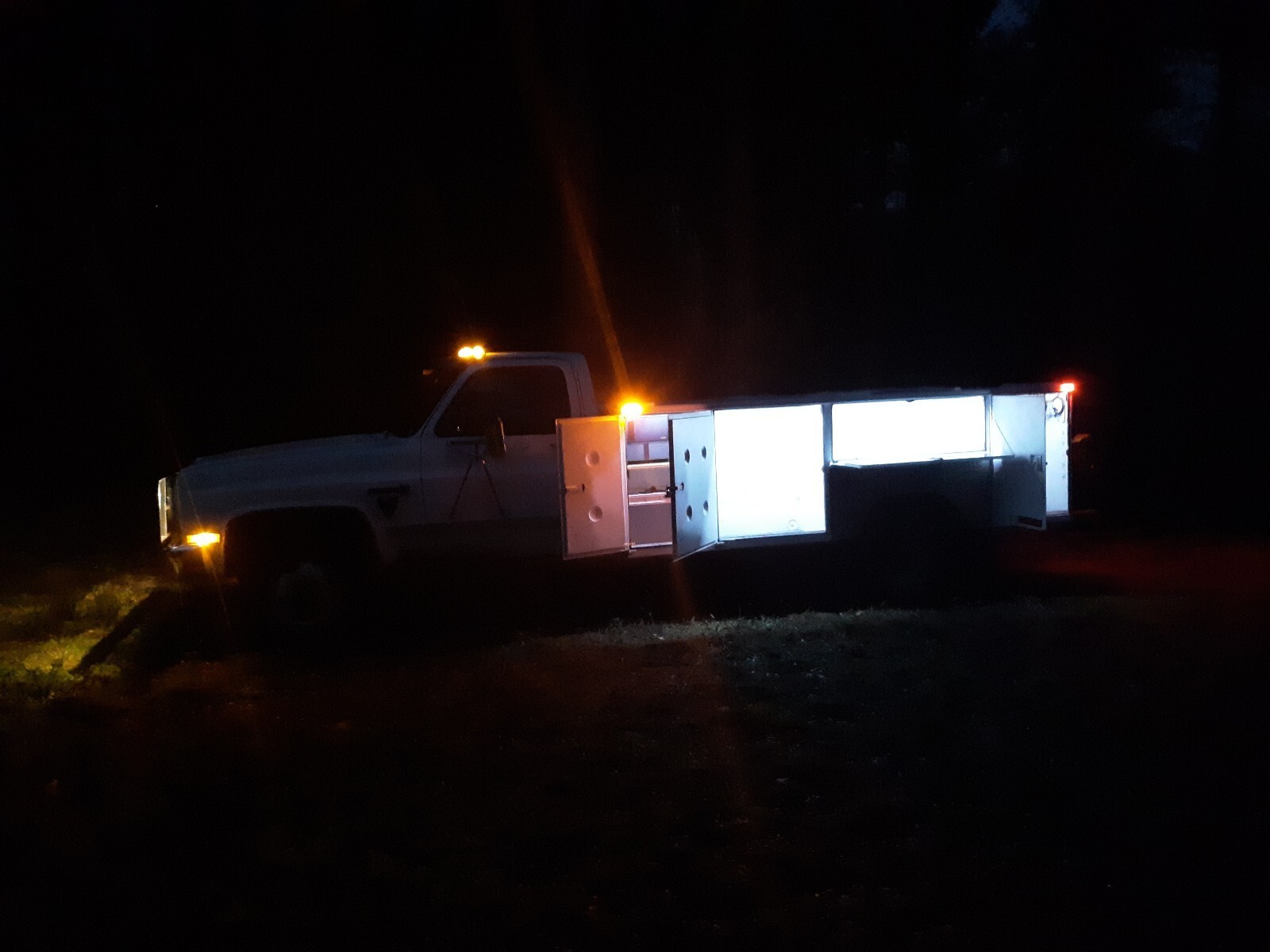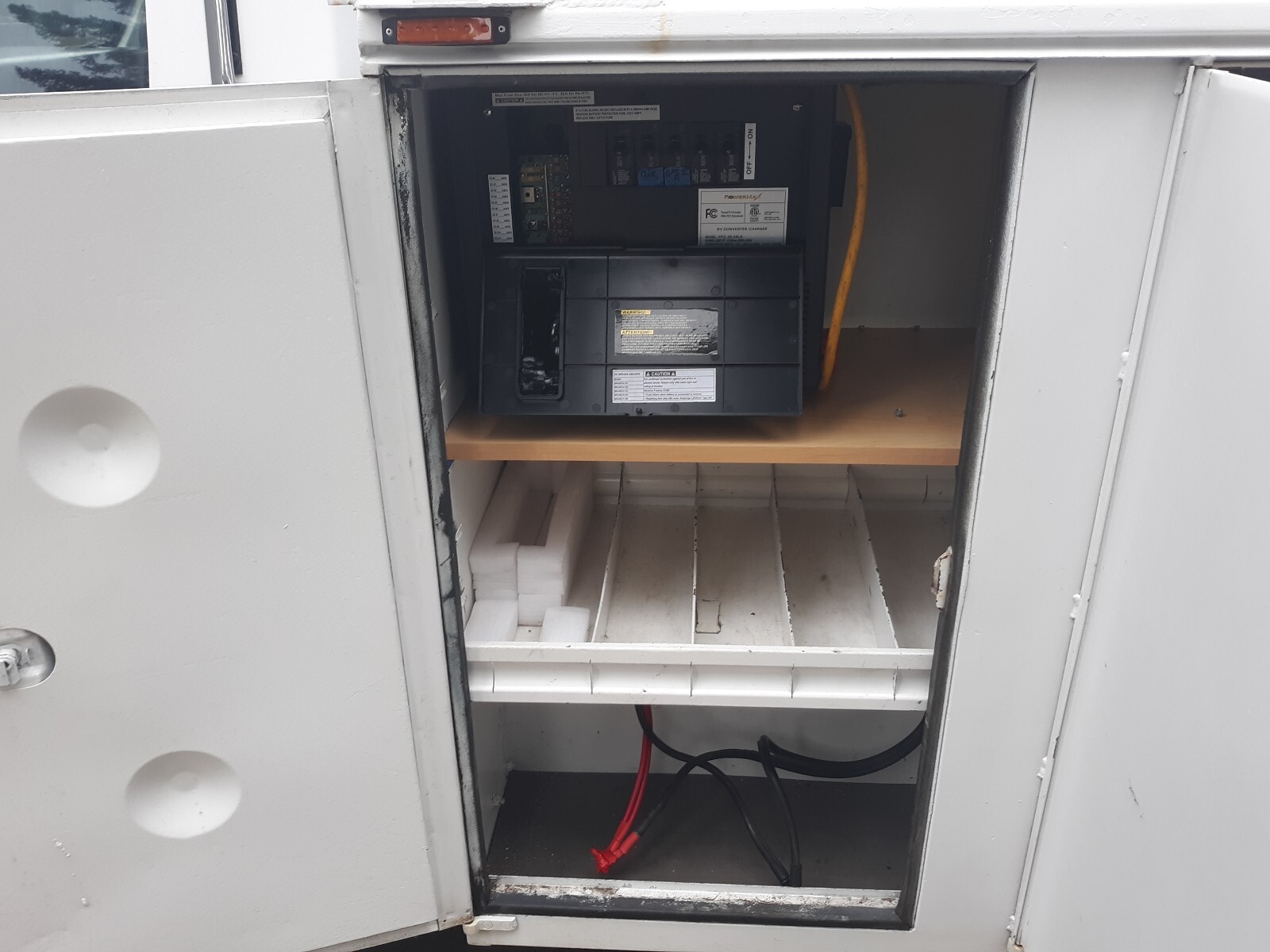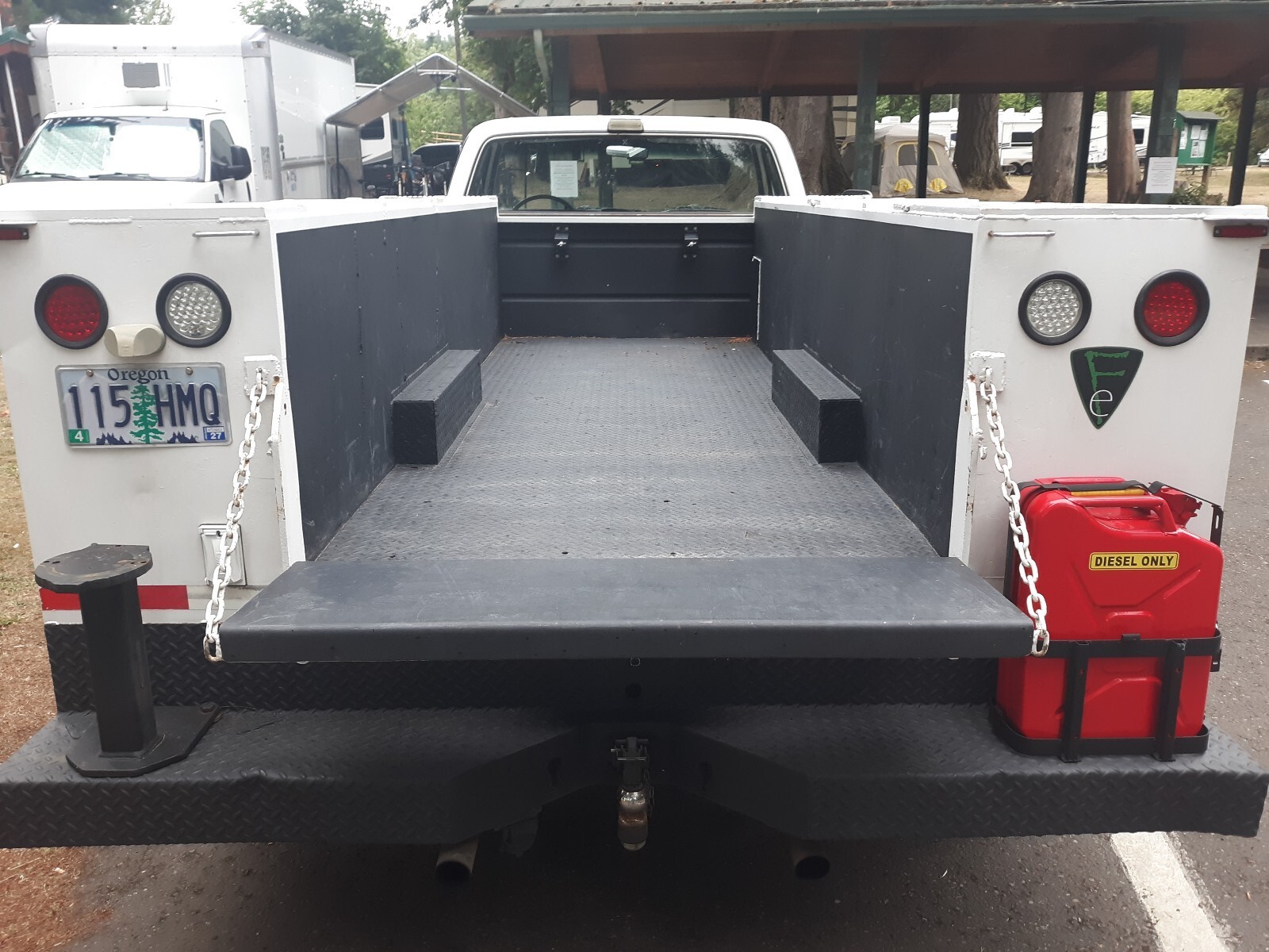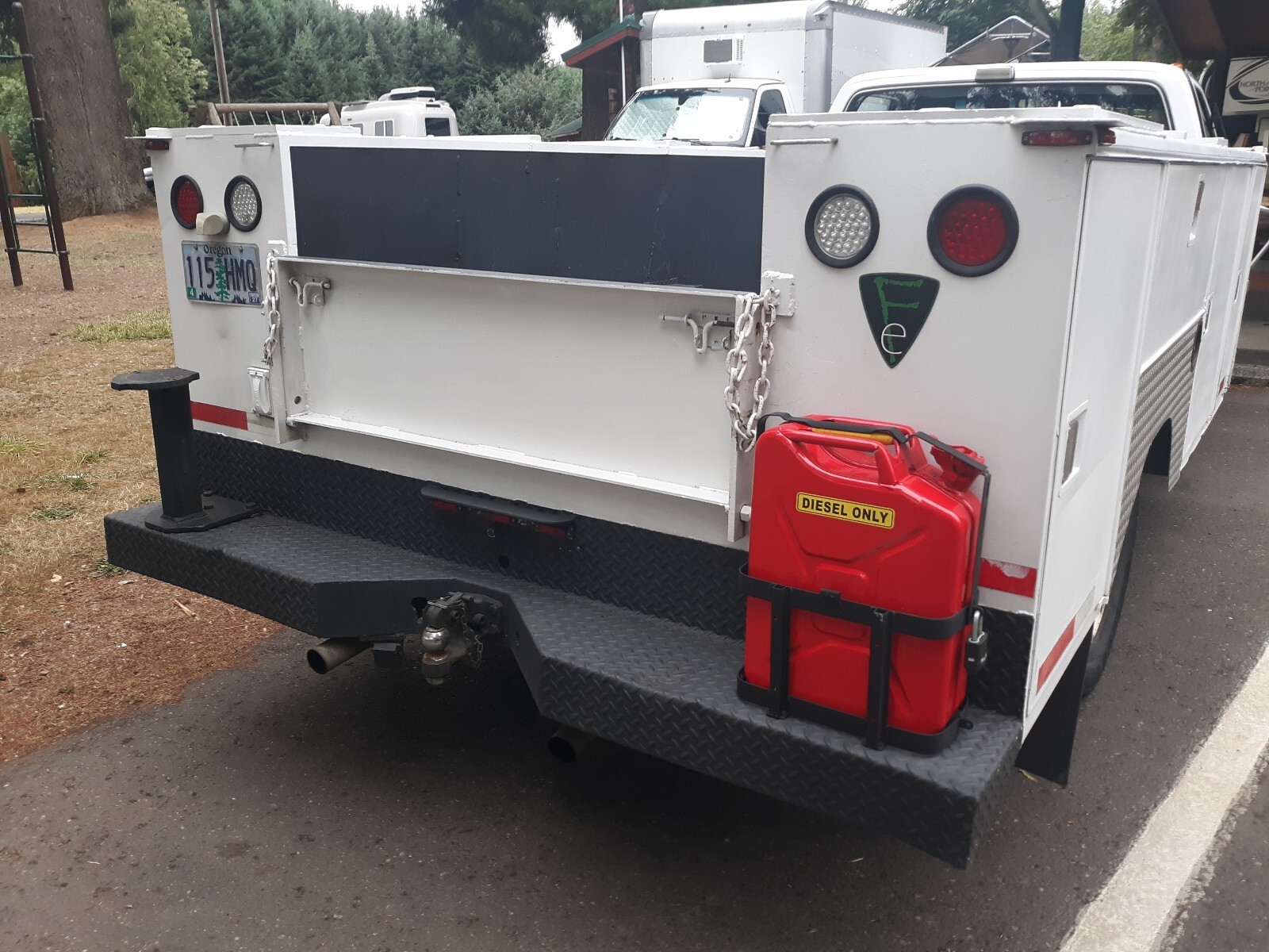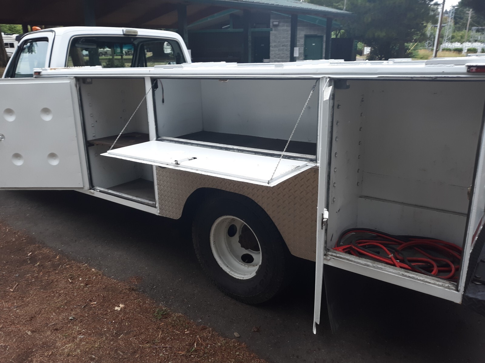 11' dually Stahl utility body was Auto Crane equipped (mounting intact). Vice mount on bumper, 10-ton pintle hook with 2-5/16” ball. No rust holes, all cabinet locks & doors work well, cabinets stay dry. All cabinets wired for 120v AC w/outlet boxes (additional 120v GFCI outlet outside rear & under hood), 12v DC & lighting with main breaker box & junction blocks. Wired for 5000w inverter & dual lifpo4 100ah accessory batteries (batts & inverter not included) with main battery & alternator isolation switch. Wavian USA Jerry Can & mount included.