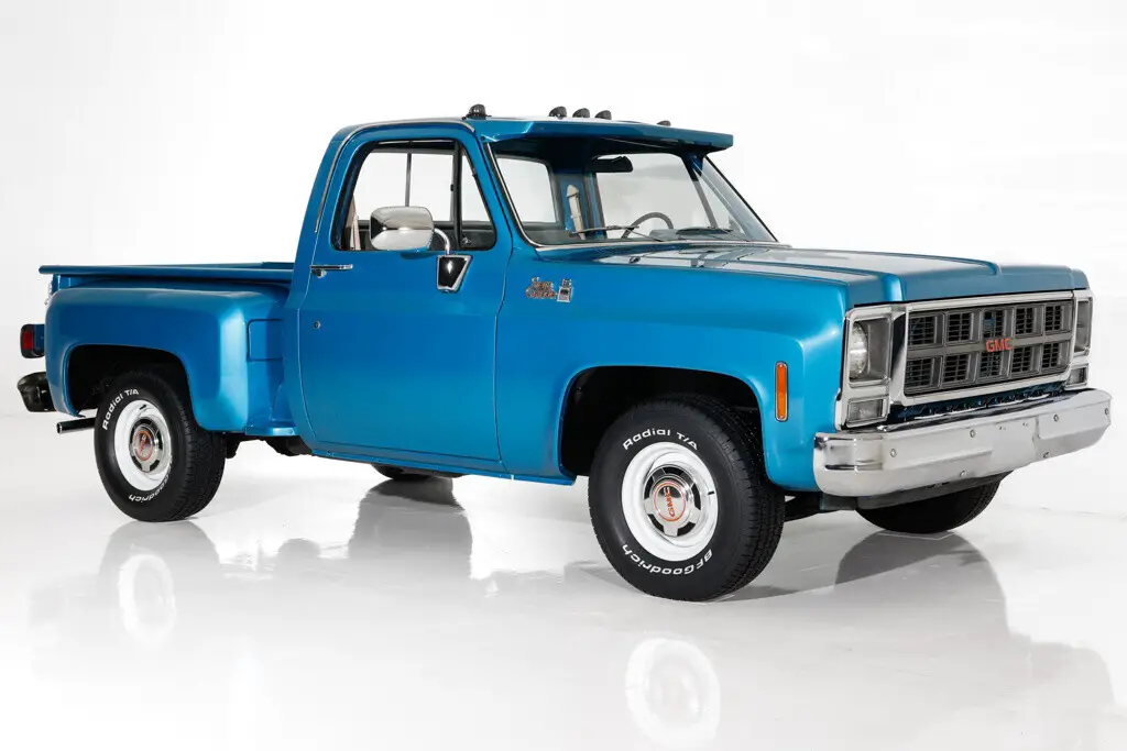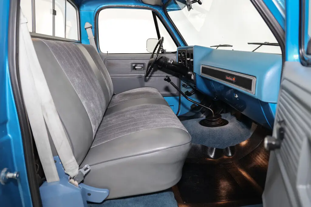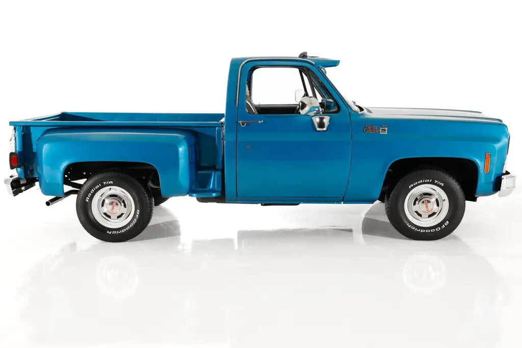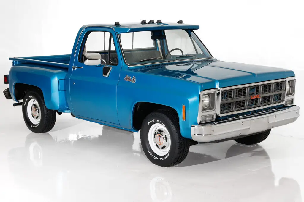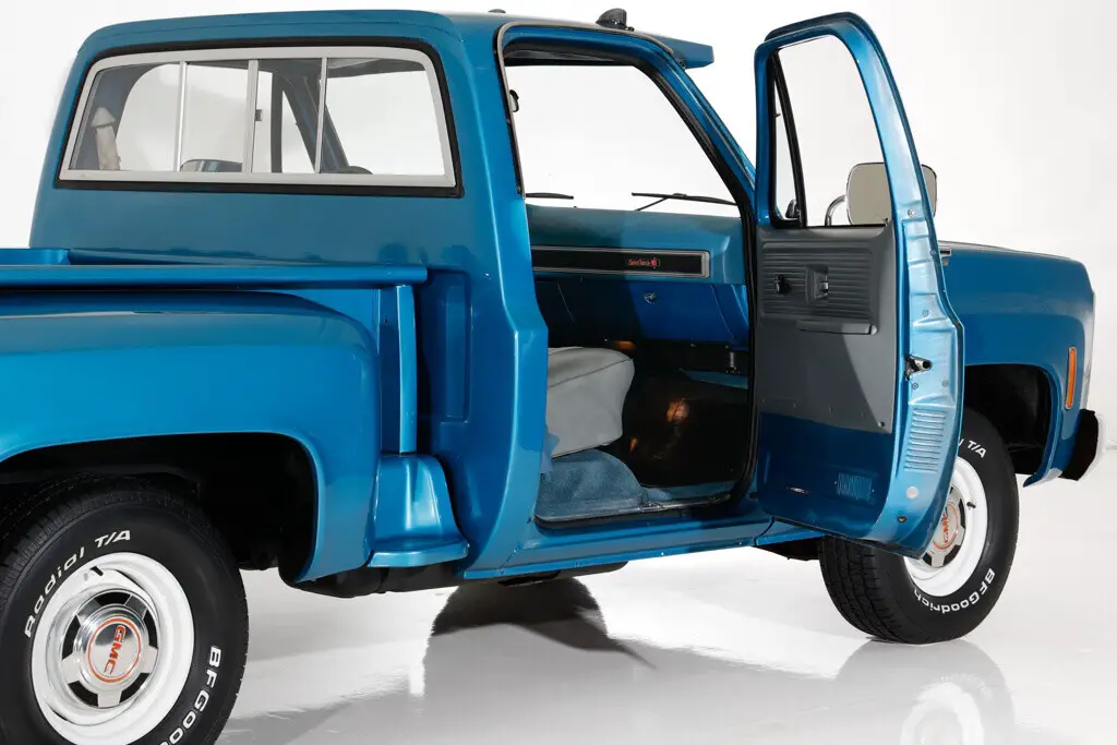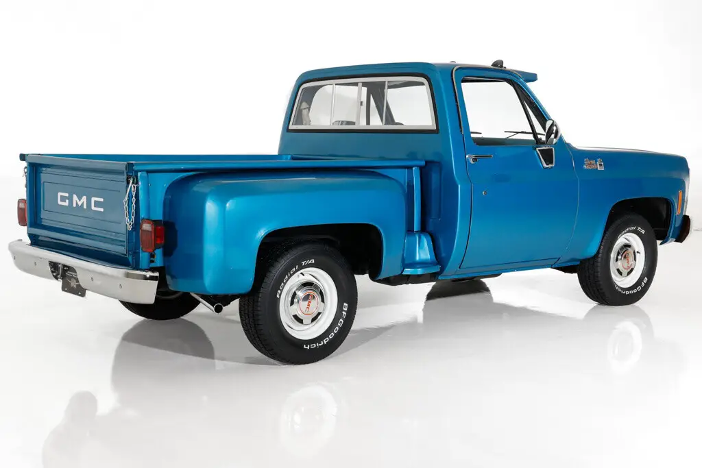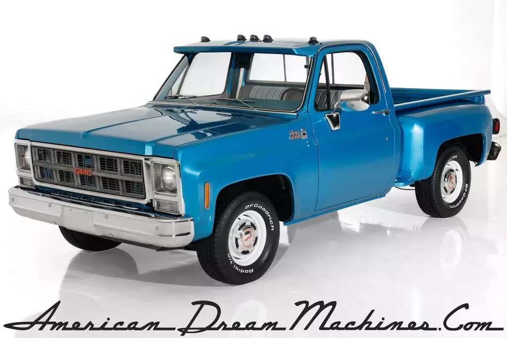 One owner's pride and joy, shimmering Blue Metallic 1979 GMC step side pickup with Sierra Grande trim package. Recently purchased from a 91 year old, very proud original owner, who recently gave this beautiful blue step side truck the new paint job it deserved. He decided to keep the trucks drivetrain exactly how he bought it and had the machine shop rebuild the original 250 cubic inch six cylinder engine and the 4-speed manual transmission at a cost of over $6000 with receipts. Now it runs and rides like a new truck. The interior is amazing with factory gauges, factory steering wheel, clean dash, am-fm Delco radio, sliding rear window and original seat belts. After the new paint new chrome bumpers and chrome side mirrors were added and look great. Inside the bed was repainted and the original wood was clearcoated for durability and a beautiful finish. Rolling on restored steel wheels, new center caps and new BF Goodrich Radial T/A tires for a great stance and drop dead good looks.