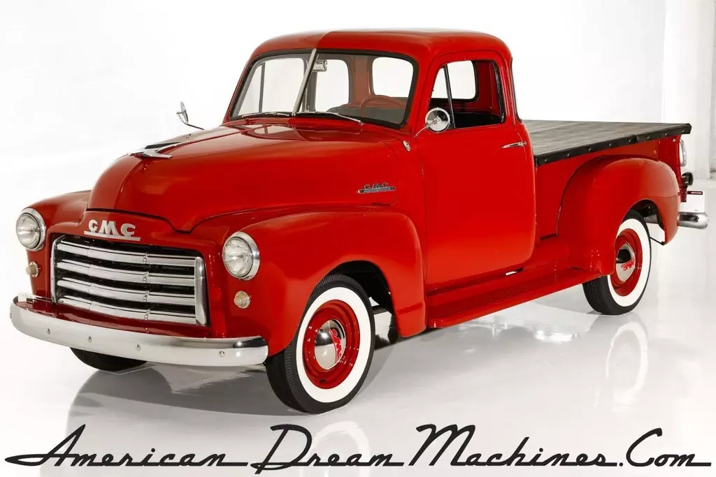 Stunning Crimson Red 1952 GMC 3100 five window pickup with iconic cab corner windows. A simple truck from a simpler time that is a blast to drive with its gas sipping, original 228 c.i. straight six engine and 3 speed manual transmission. The engine compartment has been detailed to impress at any small show or cruise in. Most of the chrome and stainless are all original, including the grill, hood trim, headlight trim and GMC emblems have been polished which which validates the the care this truck has had over the years. The bumpers have been replaced with new chrome ones because they had blemishes and they look great. The running boards have been painted to match for a higher end finish look. The wood in box has been restored and is protected by a tonneau cover that can be snapped on or removed completely depending on the look you desire. The black and red interior is super clean and features black upholstery on the original bench seat, new headliner, new door panels, painted to match dash, restored steering wheel, black carpet, retro radio and polished chrome dash bezels and garnish moldings. This iconic five window pickup is rolling on restored, painted to match steel wheels, new chrome GMC center caps and new wide white tires for timeless good looks.